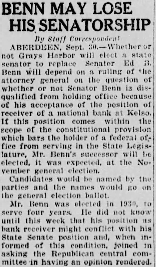BENN MAY LOSE HIS SENATORSHIP By Sept. not Grays Harbor will elect senator replace Senator Ed Benn will depend on ruling of the attorney on the question of whether not Senator Benn qualified from holding office because of his acceptance of the position receiver of national bank Kelso. If this position comes within the the which bars the holder of federal office from serving in the State Legis!ature, Mr. Benn's will elected. was expected, at the November general election. Candidates be named by the parties and the would go on the general ballot. Mr. Benn was elected serve four years. He did not know until this week that his position bank receiver might conflict with his State Senate position and, when informed of this joined asking the Republican mittee in having an opinion rendered.
