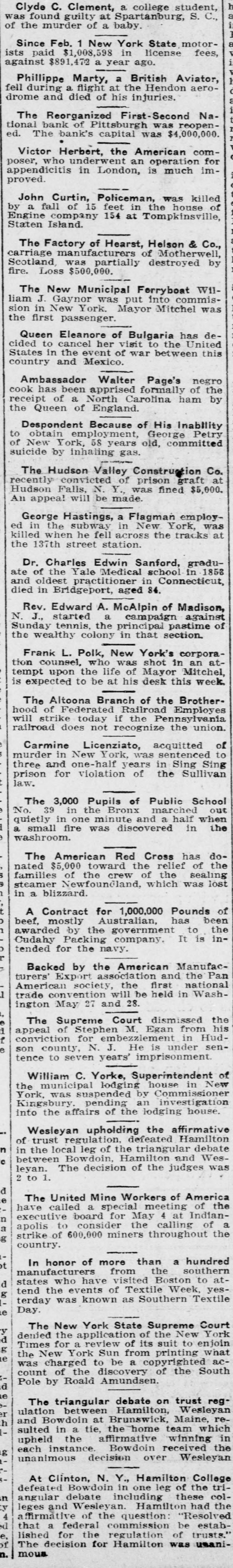 h Clyde C. Clement, a college student, S. C., was found guilty at Spartanburg, of the murder of a baby. Since Feb. 1 New York State motor- fees, paid $1,008,598 in license against ists $891,472 a year ago. Phillippe Marty, a British Aviator, aeroduring a flight at the Hendon fell drome and died of his injuries. Reorganized First-Second NaThe bank of Pittsburgh was reopened. tional The bank's capital was $4,000,000. Victor Herbert, the American com- for who underwent an operation improved. poser, appendicitis in London, is much John Curtin, Policeman, was house killed of fall of 15 feet in the Staten Island. Engine by a company 154 at Tompkinsville, The Factory of Hearst, Helson & Co., manufacturers of Motherwell, by carriage Scotland, was partially destroyed fire. Loss $500,000. The New Municipal Ferryboat commis- WilJ. Gaynor was put into was sion liam in New York. Mayor Mitchel the first passenger. Queen Eleanore of Bulgaria has United decancel her visit to the this States cided to in the event of war between country and Mexico. Ambassador Walter Page's negro the has been apprised formally of by receipt cook of a North Carolina ham the Queen of England. Despondent Because of His Inability Petry employment, George of to New obtain York, 58 years old, committed suicide by inhaling gas. The Hudson Valley Construction Co. at convicted of prison graft Hudson recently Falls, N. Y. was fined $5,000. An appea! will be made. George Hastings, a Flagman York, employ was subway in New killed ed in when the he fell across the tracks at the 137th street station. Charles Edwin Sanford, in gradu- 1853 ate and Dr. of oldest the Yale practitioner Medical in school Connecticut, died in Bridgeport, aged 84. Edward A. McAlpin of Madison, a rainst Rev. J., started a campaign of N. Sunday tennis, the principal pastime the wealthy colony in that section. Frank L. Polk, New York's corpora- an atcounsel, who was shot in Mitchel, tion upon the life of Mayor week. is tempt expected to be at his desk this Altoona Branch of the BrotherThe of Federated Railroad Employes hood strike today if the Pennsylvania union. railroad will does not recognize the Carmine Licenziato, acquitted of in New York, was sentenced to murder and one-half years in Sing Sullivan Sing three prison for violation of the law. The 3,000 Pupils of Public School out the Bronx marched No. 39 in in one minute and a half when the quietly a small fire was discovered in washroom. American Red Cross has of do- the nated The $5,000 toward the relief sealing the crew of the steamer families Newfoundland, of which was lost in a blizzard. Contract for 1,000,000 Pounds of A Australian, has been by the government to inPacking company It Cudahy awarded beef. mostly is the tended for the navy. Backed by the American Manufac- the Pan turers' Export association and national 1 American society the first held in Washtrade convention will be ington May 27 and 28. Supreme Court dismissed from the his 1 The of Stephen M. Egan Hudappeal conviction county, for N. embezzlement J. He imprisonment. is under in sentence son to seven years' William C. Yorke, Superintendent New of municipal lodging house Commissioner in the York, was suspended pending by an investigation into Kingsbury the affairs of the lodging house. upholding the affirmative Hamilton Wesleyan regulation. defeated debate of trust leg of the triangular Wesc in the local Bowdoin, Hamilton and 2 1. leyan. between The decision of the judges was d e United Mine Workers of America of the have The called a special meeting Indiann executive board for May 4 at of a a to consider the calling g strike apolis of 600,000 miners throughout the country. t from In honor of more than the a southern hundred d manufacturers who have visited Boston to atg states events of Textile Week, yesDay tend terday the was known as Southern Textile e y New York State Supreme Court York d The the application of the New enjoin g denied for a review of its suit to what Times New York Sun from printing acthe charged to be a copyrighted was of the discovery of the South d count Pole by Roald Amundsen, e triangular debate on trust Wesleyan regThe between Hamilton, h ulation Bowdoin at Brunswick, Maine, which reand in a tie, the home team sulted upheld the affirmative winning the in g instance Bowdoin received each unanimous decision over Wesleyan At Clinton, N. Y., Hamilton College triBowdoin in one leg of the colin defeated angular debate including these the y and Wesleyan. Hamilton had 4 leges affirmative of the question "Resolved d that a federal commission be trusts." estabfor the regulation of of The lished decision for Hamilton was usanimous n.