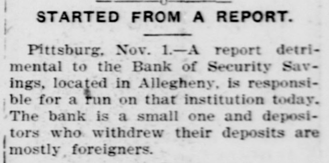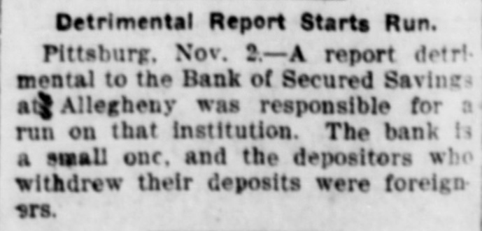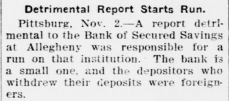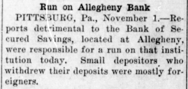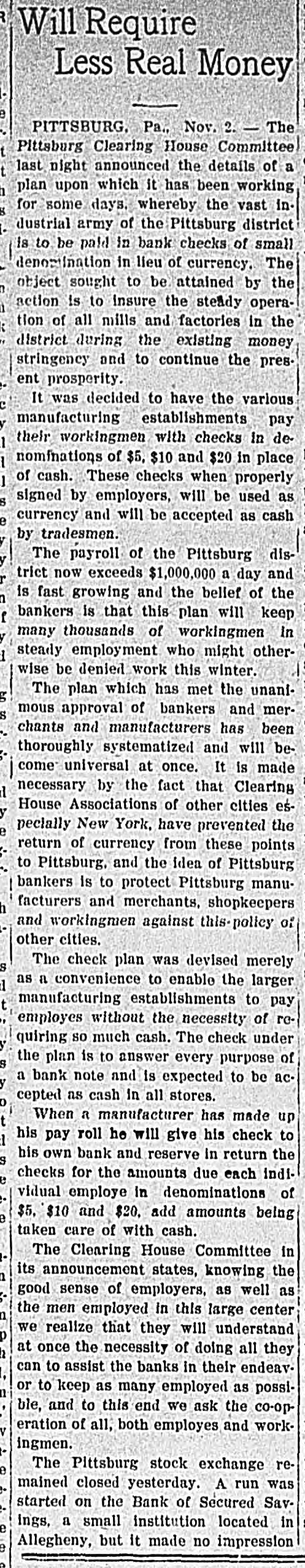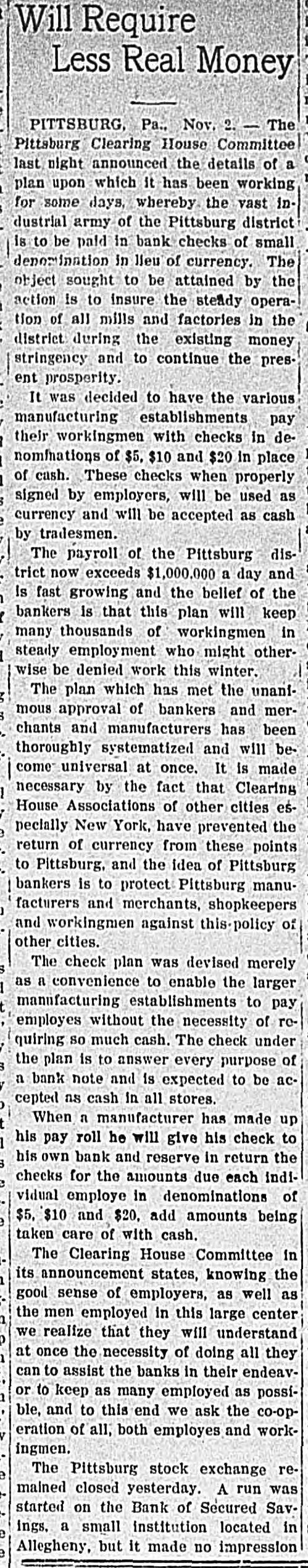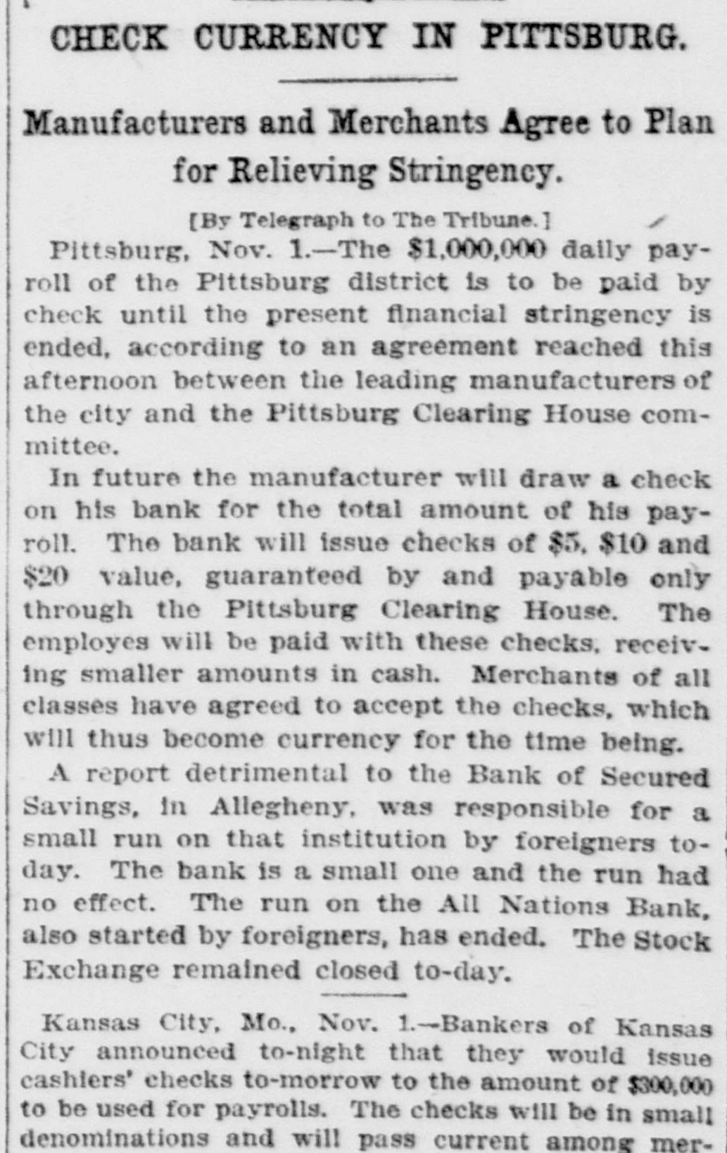 CHECK CURRENCY IN PITTSBURG. Manufacturers and Merchants Agree to Plan for Relieving Stringency. [By Telegraph to The Tribune.] Pittsburg, Nov. 1.-The $1,000,000 daily payroll of the Pittsburg district is to be paid by check until the present financial stringency is ended, according to an agreement reached this afternoon between the leading manufacturers of the city and the Pittsburg Clearing House committee. In future the manufacturer will draw a check on his bank for the total amount of his payroll. The bank will issue checks of $5. $10 and $20 value, guaranteed by and payable only through the Pittsburg Clearing House. The employes will be paid with these checks, receiving smaller amounts in cash. Merchants of all classes have agreed to accept the checks, which will thus become currency for the time being. A report detrimental to the Bank of Secured Savings, in Allegheny, was responsible for a small run on that institution by foreigners today. The bank is a small one and the run had no effect. The run on the All Nations Bank, also started by foreigners, has ended. The Stock Exchange remained closed to-day. Kansas City, Mo., Nov. 1.-Bankers of Kansas City announced to-night that they would issue cashiers' checks to-morrow to the amount of $300,000 to be used for payrolls. The checks will be in small denominations and will pass current among mer-