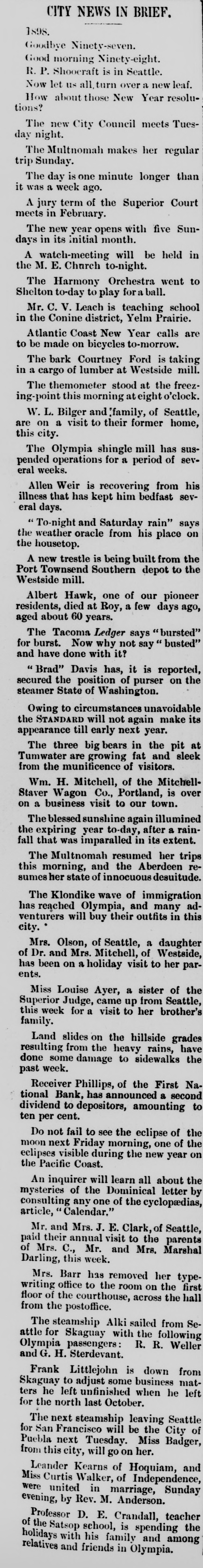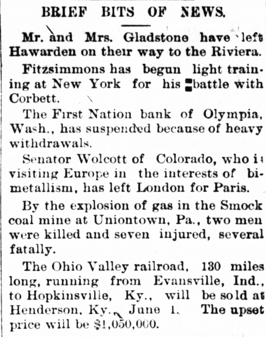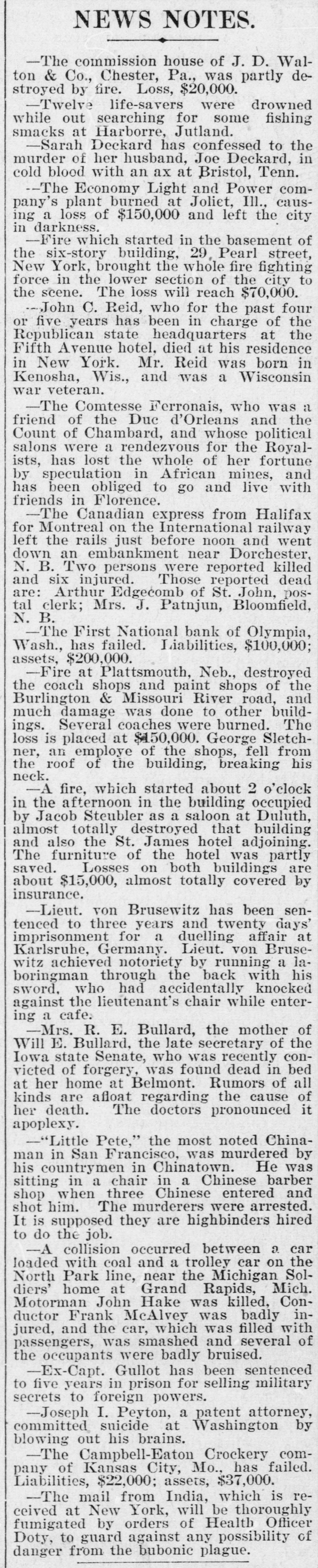 NEWS NOTES. -The commission house of J. D. Walton & Co., Chester, Pa., was partly destroyed by fire. Loss, $20,000. -Twelve life-savers were drowned while out searching for some fishing smacks at Harborre, Jutland. -Sarah Deckard has confessed to the murder of her husband, Joe Deckard, in cold blood with an ax at Bristol, Tenn. --The Economy Light and Power company's plant burned at Joliet, Ill., causing a loss of $150,000 and left the city in darkness. -Fire which started in the basement of the six-story building, 29, Pearl street, New York, brought the whole fire fighting force in the lower section of the city to the scene. The loss will reach $70,000. -John C. Reid, who for the past four or five years has been in charge of the Republican state headquarters at the Fifth Avenue hotel, died at his residence in New York. Mr. Reid was born in Kenosha, Wis., and was a Wisconsin war veteran. -The Comtesse Ferronais, who was a friend of the Due d'Orleans and the Count of Chambard, and whose political salons were a rendezvous for the Royalists, has lost the whole of her fortune by speculation in African mines, and has been obliged to go and live with friends in Florence. -The Canadian express from Halifax for Montreal on the International railway left the rails just before noon and went down an embankment near Dorchester, N. B. Two persons were reported killed and six injured. Those reported dead are: Arthur Edgecomb of St. John, postal clerk; Mrs. J. Patnjun, Bloomfield, N. B. -The First National bank of Olympia, Wash., has failed. Liabilities, $100,000; assets, $200,000. -Fire at Plattsmouth, Neb., destroyed the coach shops and paint shops of the Burlington & Missouri River road, and much damage was done to other buildings. Several coaches were burned. The loss is placed at $150,000. George Sletchner, an employe of the shops, fell from the roof of the building, breaking his neck. -A fire, which started about 2 o'clock in the afternoon in the building occupied by Jacob Steubler as a saloon at Duluth, almost totally destroyed that building and also the St. James hotel adjoining. The furniture of the hotel was partly saved. Losses on both buildings are about $15,000, almost totally covered by insurance. -Lieut. von Brusewitz has been sentenced to three years and twenty days' imprisonment for a duelling affair at Karlsruhe, Germany. Lieut. von Brusewitz achieved notoriety by running a laboringman through the back with his sword, who had accidentally knocked against the lieutenant's chair while entering a cafe. -Mrs. R. E. Bullard, the mother of Will E. Bullard, the late secretary of the Iowa state Senate, who was recently convicted of forgery, was found dead in bed at her home at Belmont. Rumors of all kinds are afloat regarding the cause of her death. The doctors pronounced it apoplexy. -"Little Pete," the most noted Chinaman in San Francisco, was murdered by his countrymen in Chinatown. He was sitting in a chair in a Chinese barber shop when three Chinese entered and shot him. The murderers were arrested. It is supposed they are highbinders hired to do the job. -A collision occurred between a car loaded with coal and a trolley car on the North Park line, near the Michigan Soldiers' home at Grand Rapids, Mich. Motorman John Hake was killed. Conductor Frank McAlvey was badly injured, and the car, which was filled with passengers, was smashed and several of the occupants were badly bruised. -Ex-Capt. Gullot has been sentenced to five years in prison for selling military secrets to foreign powers. -Joseph I. Peyton, a patent attorney, committed suicide at Washington by blowing out his brains. -The Campbell-Eaton Crockery company of Kansas City, Mo., has failed. Liabilities, $22,000; assets, $37,000. -The mail from India, which is received at New York, will be thoroughly fumigated by orders of Health Officer Dotv. to guard against any possibility of