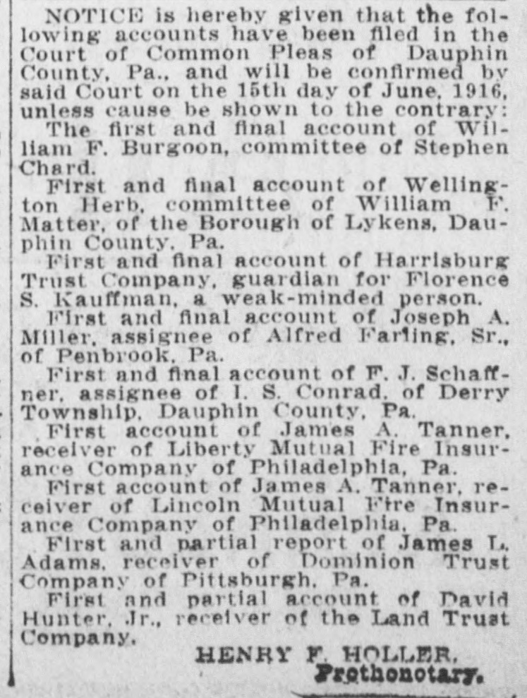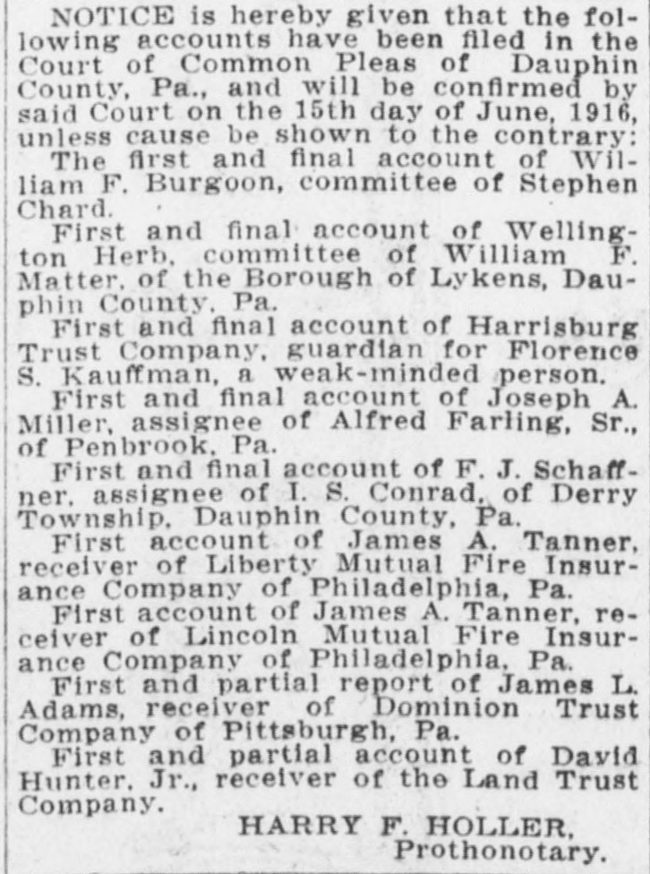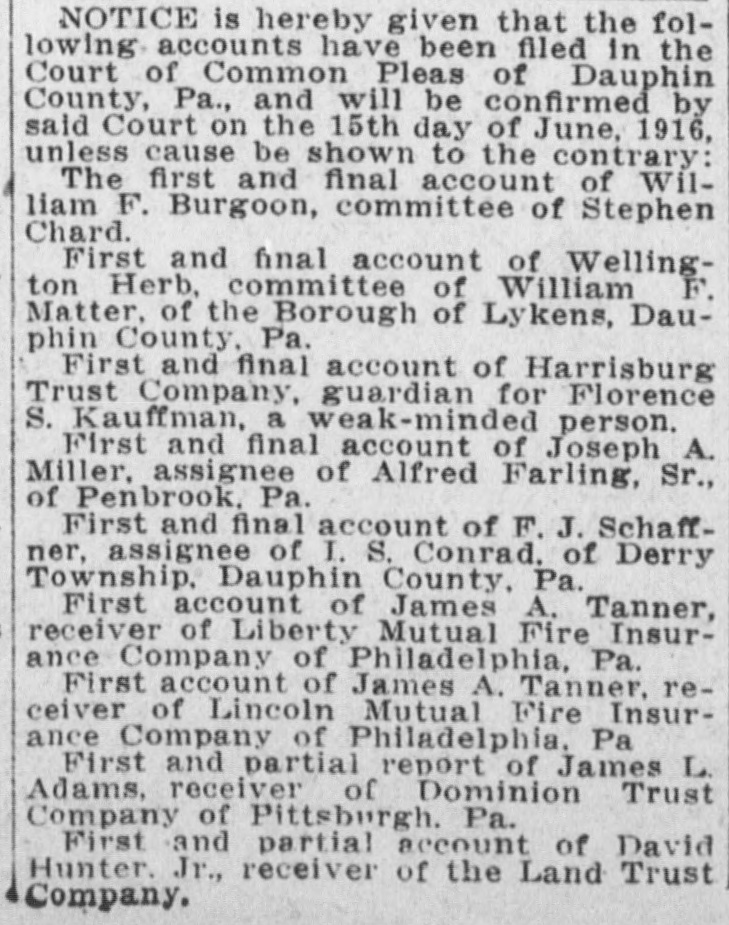 NOTICE is hereby given that the following accounts have been filed in the Court of Common Pleas of Dauphin County, Pa., and will be confirmed by said Court on the 15th day of June, 1916, unless cause be shown to the contrary: The first and final account of William F. Burgoon, committee of Stephen Chard. First and final account of Wellington Herb, committee of William F. Matter, of the Borough of Lykens, Dauphin County. Pa. First and final account of Harrisburg Trust Company, guardian for Florence S. Kauffman, a weak-minded person. First and final account of Joseph A. Miller. assignee of Alfred Farling, Sr., of Penbrook, Pa. First and final account of F. J. Schaffner, assignee of I. S. Conrad. of Derry Township. Dauphin County, Pa. First account of James A. Tanner, receiver of Liberty Mutual Fire Insurance Company of Philadelphia, Pa. First account of James A. Tanner, receiver of Lincoln Mutual Fire Insurance Company of Philadelphia, Pa. First and partial report of James L. Adams, receiver of Dominion Trust Company of Pittsburgh. Pa. First and partial account of David Hunter, Jr., receiver of the Land Trust Company. HENRY F. HOLLER, Prothonotary.