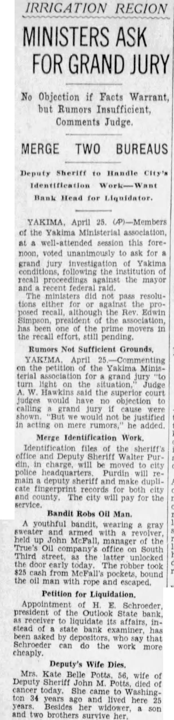 IRRIGATION REGION MINISTERS ASK FOR GRAND JURY No Objection if Facts Warrant, but Rumors Insufficient, Comments Judge. MERGE TWO BUREAUS Deputy Sheriff to Handle City's Identification Work-Want Bank Head for Liquidator. YAKIMA. April 25. (P)-Members of the Yakima Ministerial association, at well-attended session this forenoon, voted unanimously to ask for a grand jury investigation of Yakima conditions, following the of recall proceedings against the mayor and recent federal raid. The ministers did not pass resolutions either for or against the proposed recall, although the Rev. Edwin Simpson, the association, has been one of the prime movers in the recall effort. still pending. Rumors Not Sufficient Grounds, YAKIMA. April 25 -Commenting on the petition the Yakima Ministerial association for grand jury turn light on the situation, Judge W. Hawkins said the superior court judges would have no objection to calling a grand jury if cause were shown. "But we would not be justified in acting on mere rumors,' he added. Merge Identification Work. Identification files of the sheriff's office and Deputy Sheriff Walter Purdin, in charge, will be moved to city police headquarters. Purdin will remain deputy and make duplicate fingerprint for both city and county. The city will pay for the service. Bandit Robs Oil Man. A youthful bandit. wearing a gray sweater and armed with revolver, held up John McFall, manager of the True's Oil company's office on South Third street, as the latter unlocked the door early today. The robber took $25 cash from McFall's pockets, the oil man with rope and escaped. Petition for Liquidation. Appointment of H. E. Schroeder president of the Outlook State bank, as receiver to liquidate its affairs, instead of state bank examiner. has been asked by who say that Schroeder can do the work more cheaply. Deputy's Wife Dies. Mrs. Kate Belle Potts. 56, wife of Deputy Sheriff John Potts, died of cancer today. She came to Washington 34 years ago and lived here 25 years. Besides her widower, a son and two brothers survive her.