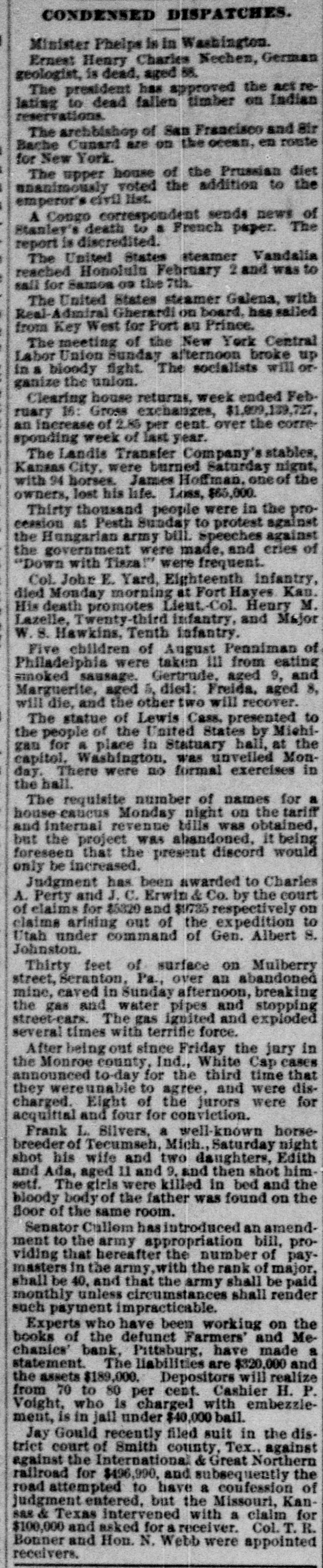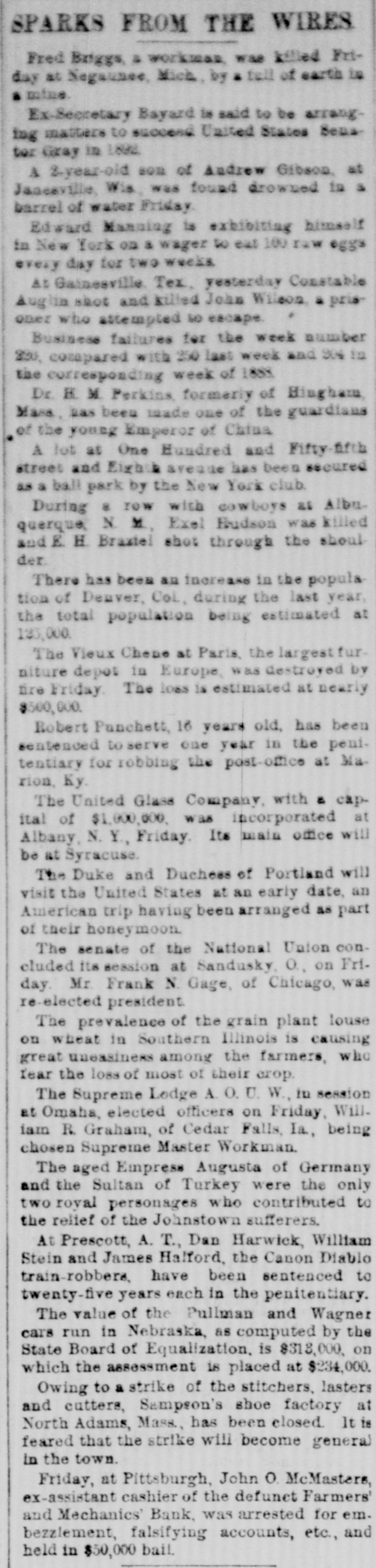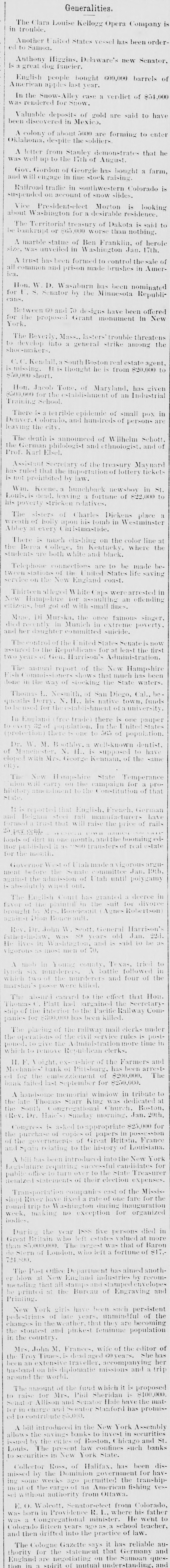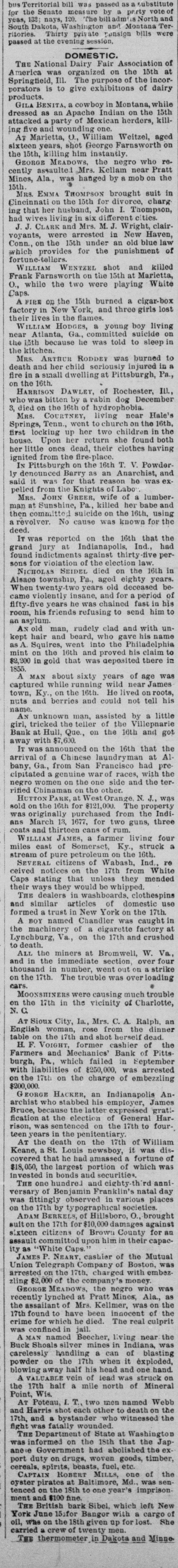 bus Territorial bill was passed substitute for the Senate measure by party vote of pus out, 1031 'sAuu :801 South Dakota, Washington and Montana Ter ritories. Thirty private pensign bills were session Sujueso em 10 pessed DOMESTIC. THE National Dairy Fair Association of 18 4791 1he uo organized SUM America Springtield, III. The purpose of the incorArtig 10 exhibitions DATE 07 SI D products. GILA BENITA, a cowboy in Montana, while 1314 the uo Indian Appach UB SU pessorp attacked a party of Mexican herders, killing five and wounding one. AT Marietta, U., William Weitzel, aged sixteen years, shot George Farnsworth on the 15th, killing him instantly GEORGE MEADOWS, the negro who re. cently assaulted Mrs. Kellam near Pratt 041 uo qour 8 sq peSueq SEM Ala Minos, 1514 MRS. EMMA THOMPSON brought suit in Cincinnati on the 15th for divorce, charg ing that her husband, John I. Thompson, had wives living in six different cities. J J. CLARK and Mrs. M. J. Wright, clairvoyants, were arrested in New Haven, MBI blue PIO uu Jepun 4391 the uo which provides for the punishment of fortune-tellers. WILLIAM WENTZEL shot and killed Frank Farnsworth on the 15th at Marietta, O., while the two were playing White Caps. B pournq 1514 the tto Mara V factory in New York, and three girls lost their lives in the flames. WILLIAM HODGES, a young boy living near Atlanta, Ga., committed suicide on up steep 01 p101 SEM life because 4721 en the kitchen. MRS. ARTHUR RODDEY was burned to B an poan(u) her puu d fire in a small dwelling at Pittsburgh, Pa., 1664 out uo HARRISON DAWLEY, of Rochester, III., December Sop a B sq bitten SEM oqm 3, died on the 16th of hydrophobia. MRS. COURTNEY, living near Hale's Springs, Tenn., went to church on the 16th, first locking up her two children in the house. Upon her return she found both her little ones dead, their clothes having ignited from the place. IN Pittsburgh on the 16th T. V. Powderly denounced Barry as an Anarchist, and XO SUAL ou reason that 101 SEM # pies pelled from the Knights of Labo MRS. JOHN GREER, wife of a lumberman at Sunshine, Pa., killed her babe and Sujen 1974. the uo subject committed then out 40J имоия SUM osneo No 8 deed. 140 that 4791 the uo SEM 11 puq "puI 18 Kanf ривля found indictments against thirty five persons for violation of the election law u! 4191 eye uo pepp Alsace township, Pa., aged eighty years. When twenty-two years old deceased be10 pojed e aoj pus came siq up 188J SEM 04 Areas every KIJU 07 mill puos 07 refusits spuers his "moor unitsu us AN old man, rudely clad and with unkept hair and beard, who gave his name as A. Squires, went into the Philadelphia on claim his релола puu 4391 the uo quiut at there SEAL that plos up $2.200 1855. SUM ese JO Fords not NVW V captured while running wild near James town, Ky., on the 16th. He lived on roots, siq 1101 you could pue bothing puu sinu name AN unknown man, assisted by a little 001 JO teller the thicked 11118 10.8 pue 4191 1he 110 "end "Iⁿᴴ 18 Bank 009'2$ 4714 AUMB IT was announced on the 16th that the IV 18 [ Chinese B 10 and peq Francisco use mo.r "Bg 'Sueq cipitated a genuine war of races, with the negro women on the one side and the terrified Chinaman on the other. HUTTON PARK, at West Orange, N. J., was Products our 000'1218 JOJ 1044 our uo PIO8 was originally purchased from the Indithere 'sunD OM1 JOJ 1291 'gI Marroh sue coats and thirteen cans of rum. WILLIAM JAMES, a farmer living four miles east of Somerset, Ky., struck a stream of pure petroleum on the 16th. SEVERAL citizens of Wabash, Ind,, re ceived notices on the 17th from White Caps stating that unless they mended their ways they would be whipped. THE dealers in washboards, clothespins and similar articles of domestic use formed a trust in New York on the 17th. A BOY named Chandler was caught in the machinery of a cigarette factory at Lynchburg, Va., on the 17th and crushed dealh 07 ALL the miners at Bromwell, W. Va, and in the immediate section, over four thousand in number, went out on a strike Include JOAO SUM thouble 140 4721 the uo cars. MOONSHINERS were causing much trouble Charlotte 30 Atentity our ut 4721 the uo ON AT Sioux City, Ia., Mrs. C. A. Ralph, an English woman, rose from the dinner deed berson the pue 4721 the uo table H. F. VOIGHT, former cashier of the Farmers and Mechanics' Bank of Pitts burgh, Pa, which failed in September with liabilities of $250,000, was arrested e JO charge the uo 421 140 uo 0000002$ EORGE HACKER, an Indianapolis Anarchist who stabbed his employer, James Bruce, because the latter expressed gratification at the election of General Har-inoj 01 4721 the uo servenced SEAL teen years in the penitentiary AT the death on the 17th of William -sip SEM 91 'Roqsmen Louis 78 e Reane's covered that he had amassed a fortune of $18,050, the largest portion of which was invested in bonds and securities. June p.1 cithts pun porpuny euo and versary of Benjamin Franklin's natal day was fittingly observed in various places on the 17th by typographical societies. ADAM BERKELS, of Hillsboro, O., brought suit on the 17th for damages against sixteen citizens of Brown County for an assault committed upon him in their capacity as "White Caps. JAMES P. NEARY, cashier of the Mutual Union Telegraph Company of Boston, was arrested on the 17th, charged with embezzling $2,000 of the company's money. GEORGE MEADOWS, the negro who was recently lynched at Pratt Mines, Ala., as the assailant of Mrs. Kellmer, was on the 17th found to have been innocent of the crime for which he died. The real culprit 1181 u! peuguoo SUM A MAN named Beecher, living near the Buck Shoals silver mines in Indiana, was carelessly handling a can of blasting powder on the 17th when it exploded, blowing away half his head and one hand. uo Monats SUM 1 JO VIGA V Mitheral 10 north mille 8 1184 4721 our SIM Point рошви now OM1 I I Potesn' 1V and Harris shot each other to death on the the possector OUAL bystander 8 pus 4721 рерипом S