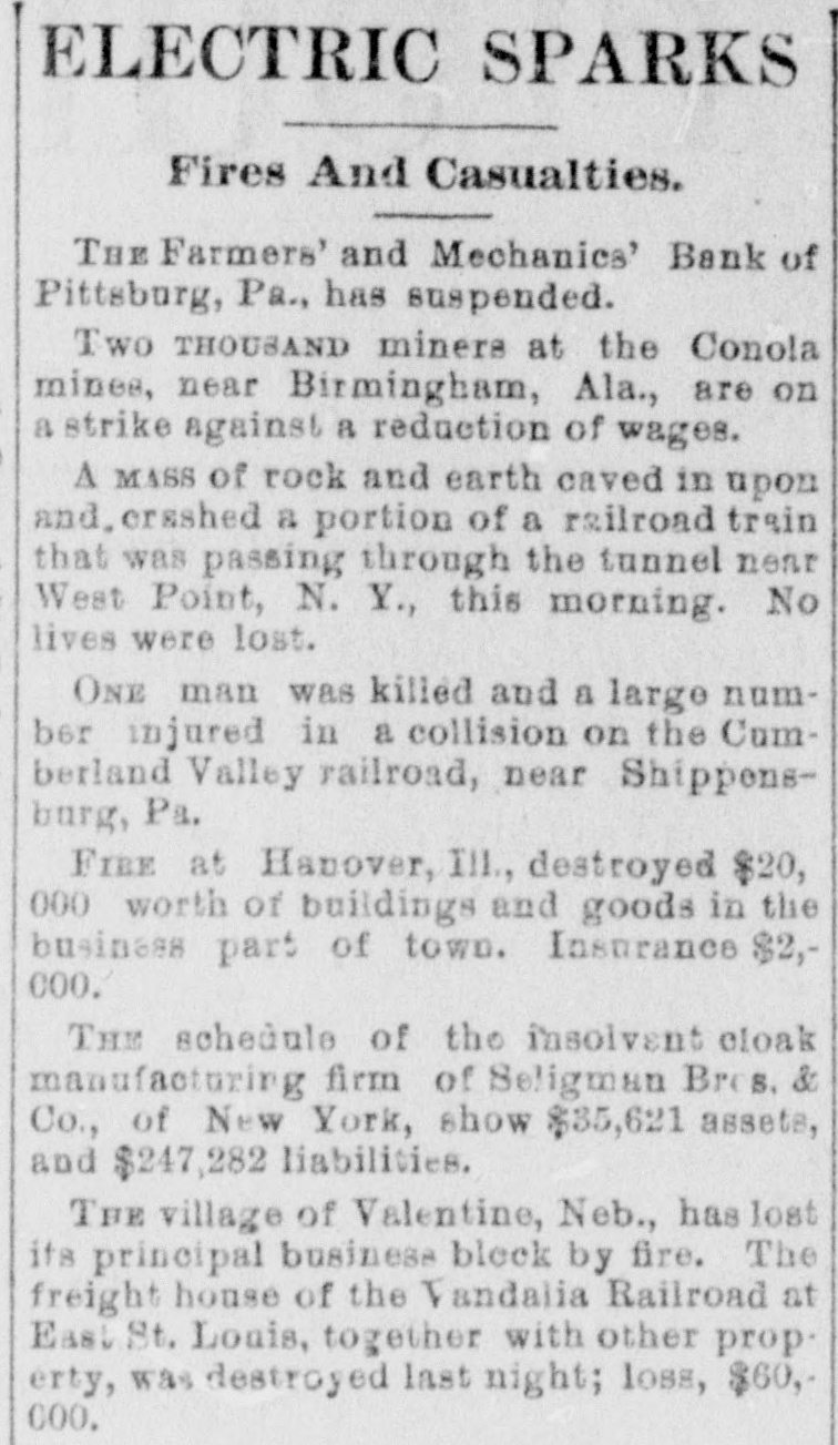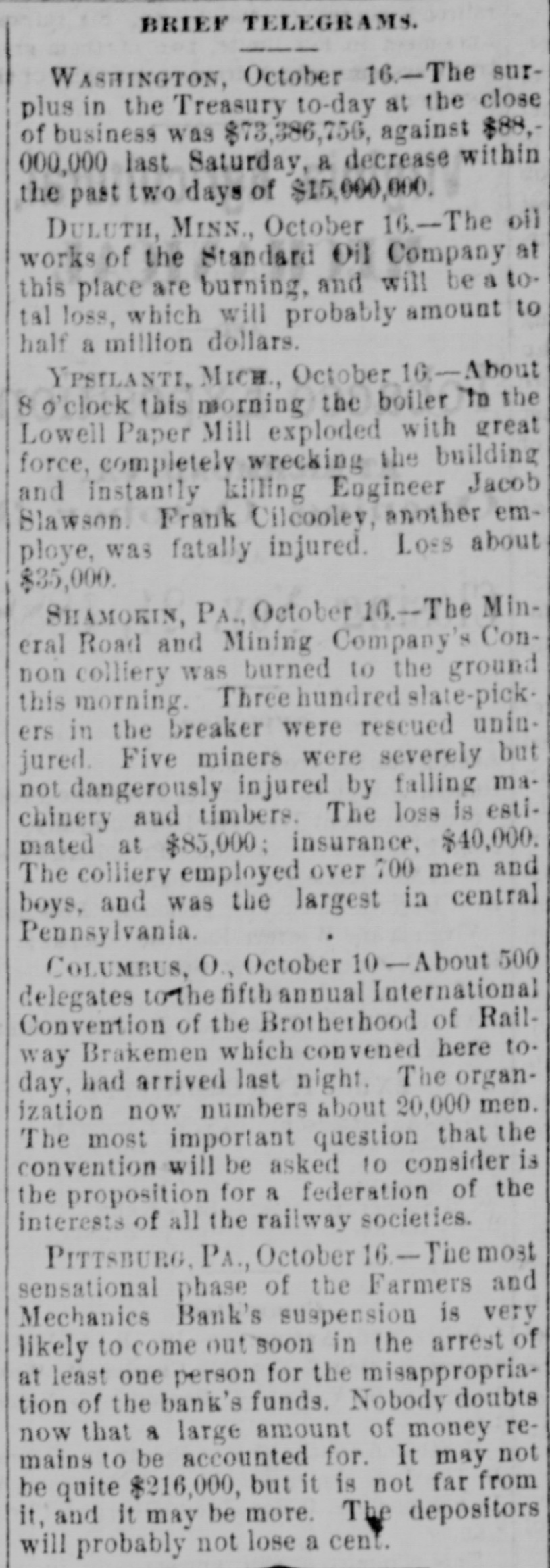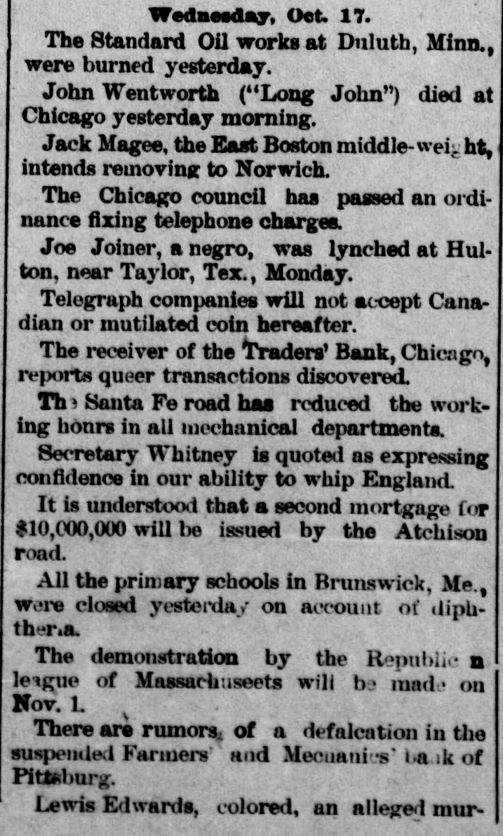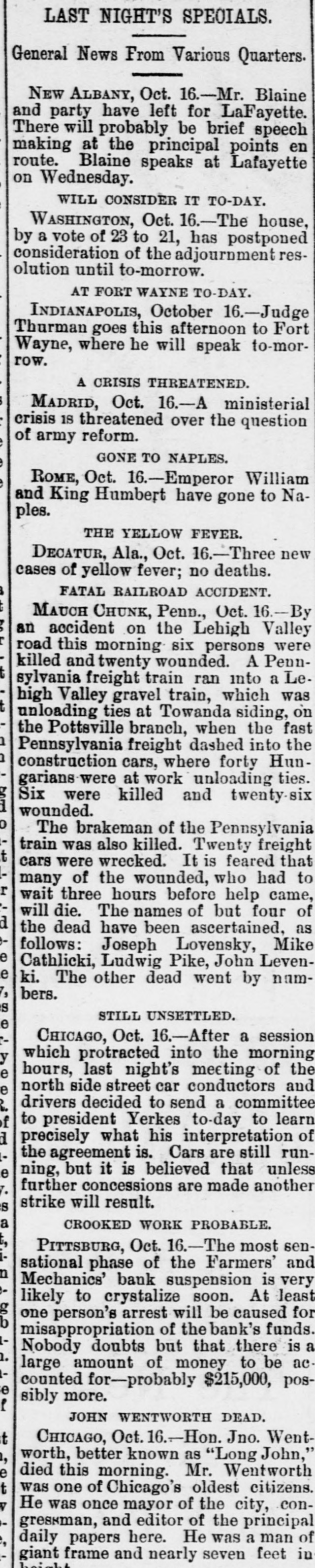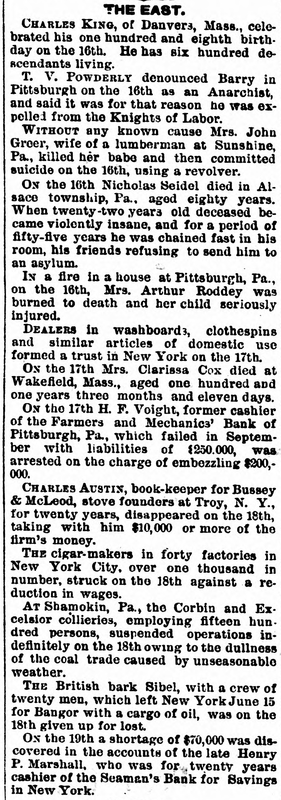 bus Territorial bill was passed substitute for the Senate measure by party vote of pus out, 1031 'sAuu :801 South Dakota, Washington and Montana Ter ritories. Thirty private pensign bills were session Sujueso em 10 pessed DOMESTIC. THE National Dairy Fair Association of 18 4791 1he uo organized SUM America Springtield, III. The purpose of the incorArtig 10 exhibitions DATE 07 SI D products. GILA BENITA, a cowboy in Montana, while 1314 the uo Indian Appach UB SU pessorp attacked a party of Mexican herders, killing five and wounding one. AT Marietta, U., William Weitzel, aged sixteen years, shot George Farnsworth on the 15th, killing him instantly GEORGE MEADOWS, the negro who re. cently assaulted Mrs. Kellam near Pratt 041 uo qour 8 sq peSueq SEM Ala Minos, 1514 MRS. EMMA THOMPSON brought suit in Cincinnati on the 15th for divorce, charg ing that her husband, John I. Thompson, had wives living in six different cities. J J. CLARK and Mrs. M. J. Wright, clairvoyants, were arrested in New Haven, MBI blue PIO uu Jepun 4391 the uo which provides for the punishment of fortune-tellers. WILLIAM WENTZEL shot and killed Frank Farnsworth on the 15th at Marietta, O., while the two were playing White Caps. B pournq 1514 the tto Mara V factory in New York, and three girls lost their lives in the flames. WILLIAM HODGES, a young boy living near Atlanta, Ga., committed suicide on up steep 01 p101 SEM life because 4721 en the kitchen. MRS. ARTHUR RODDEY was burned to B an poan(u) her puu d fire in a small dwelling at Pittsburgh, Pa., 1664 out uo HARRISON DAWLEY, of Rochester, III., December Sop a B sq bitten SEM oqm 3, died on the 16th of hydrophobia. MRS. COURTNEY, living near Hale's Springs, Tenn., went to church on the 16th, first locking up her two children in the house. Upon her return she found both her little ones dead, their clothes having ignited from the place. IN Pittsburgh on the 16th T. V. Powderly denounced Barry as an Anarchist, and XO SUAL ou reason that 101 SEM # pies pelled from the Knights of Labo MRS. JOHN GREER, wife of a lumberman at Sunshine, Pa., killed her babe and Sujen 1974. the uo subject committed then out 40J имоия SUM osneo No 8 deed. 140 that 4791 the uo SEM 11 puq "puI 18 Kanf ривля found indictments against thirty five persons for violation of the election law u! 4191 eye uo pepp Alsace township, Pa., aged eighty years. When twenty-two years old deceased be10 pojed e aoj pus came siq up 188J SEM 04 Areas every KIJU 07 mill puos 07 refusits spuers his "moor unitsu us AN old man, rudely clad and with unkept hair and beard, who gave his name as A. Squires, went into the Philadelphia on claim his релола puu 4391 the uo quiut at there SEAL that plos up $2.200 1855. SUM ese JO Fords not NVW V captured while running wild near James town, Ky., on the 16th. He lived on roots, siq 1101 you could pue bothing puu sinu name AN unknown man, assisted by a little 001 JO teller the thicked 11118 10.8 pue 4191 1he 110 "end "Iⁿᴴ 18 Bank 009'2$ 4714 AUMB IT was announced on the 16th that the IV 18 [ Chinese B 10 and peq Francisco use mo.r "Bg 'Sueq cipitated a genuine war of races, with the negro women on the one side and the terrified Chinaman on the other. HUTTON PARK, at West Orange, N. J., was Products our 000'1218 JOJ 1044 our uo PIO8 was originally purchased from the Indithere 'sunD OM1 JOJ 1291 'gI Marroh sue coats and thirteen cans of rum. WILLIAM JAMES, a farmer living four miles east of Somerset, Ky., struck a stream of pure petroleum on the 16th. SEVERAL citizens of Wabash, Ind,, re ceived notices on the 17th from White Caps stating that unless they mended their ways they would be whipped. THE dealers in washboards, clothespins and similar articles of domestic use formed a trust in New York on the 17th. A BOY named Chandler was caught in the machinery of a cigarette factory at Lynchburg, Va., on the 17th and crushed dealh 07 ALL the miners at Bromwell, W. Va, and in the immediate section, over four thousand in number, went out on a strike Include JOAO SUM thouble 140 4721 the uo cars. MOONSHINERS were causing much trouble Charlotte 30 Atentity our ut 4721 the uo ON AT Sioux City, Ia., Mrs. C. A. Ralph, an English woman, rose from the dinner deed berson the pue 4721 the uo table H. F. VOIGHT, former cashier of the Farmers and Mechanics' Bank of Pitts burgh, Pa, which failed in September with liabilities of $250,000, was arrested e JO charge the uo 421 140 uo 0000002$ EORGE HACKER, an Indianapolis Anarchist who stabbed his employer, James Bruce, because the latter expressed gratification at the election of General Har-inoj 01 4721 the uo servenced SEAL teen years in the penitentiary AT the death on the 17th of William -sip SEM 91 'Roqsmen Louis 78 e Reane's covered that he had amassed a fortune of $18,050, the largest portion of which was invested in bonds and securities. June p.1 cithts pun porpuny euo and versary of Benjamin Franklin's natal day was fittingly observed in various places on the 17th by typographical societies. ADAM BERKELS, of Hillsboro, O., brought suit on the 17th for damages against sixteen citizens of Brown County for an assault committed upon him in their capacity as "White Caps. JAMES P. NEARY, cashier of the Mutual Union Telegraph Company of Boston, was arrested on the 17th, charged with embezzling $2,000 of the company's money. GEORGE MEADOWS, the negro who was recently lynched at Pratt Mines, Ala., as the assailant of Mrs. Kellmer, was on the 17th found to have been innocent of the crime for which he died. The real culprit 1181 u! peuguoo SUM A MAN named Beecher, living near the Buck Shoals silver mines in Indiana, was carelessly handling a can of blasting powder on the 17th when it exploded, blowing away half his head and one hand. uo Monats SUM 1 JO VIGA V Mitheral 10 north mille 8 1184 4721 our SIM Point рошви now OM1 I I Potesn' 1V and Harris shot each other to death on the the possector OUAL bystander 8 pus 4721 рерипом S