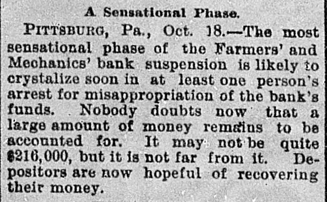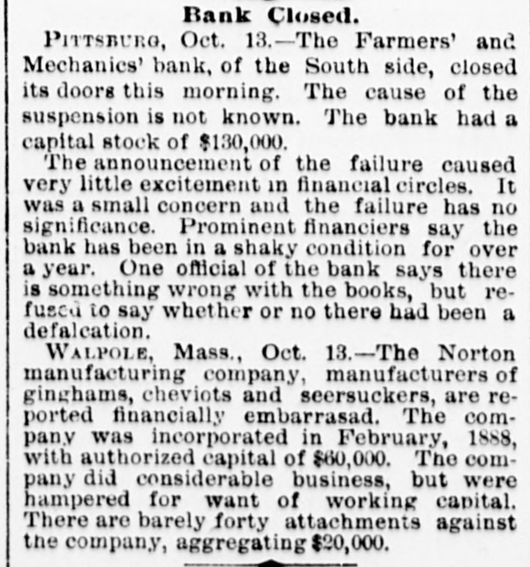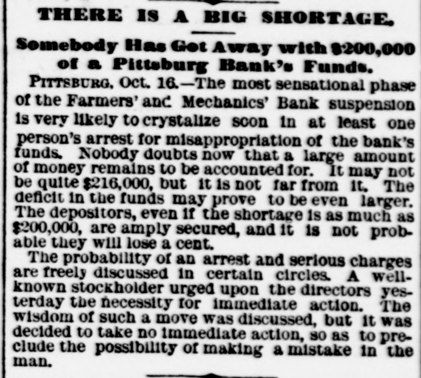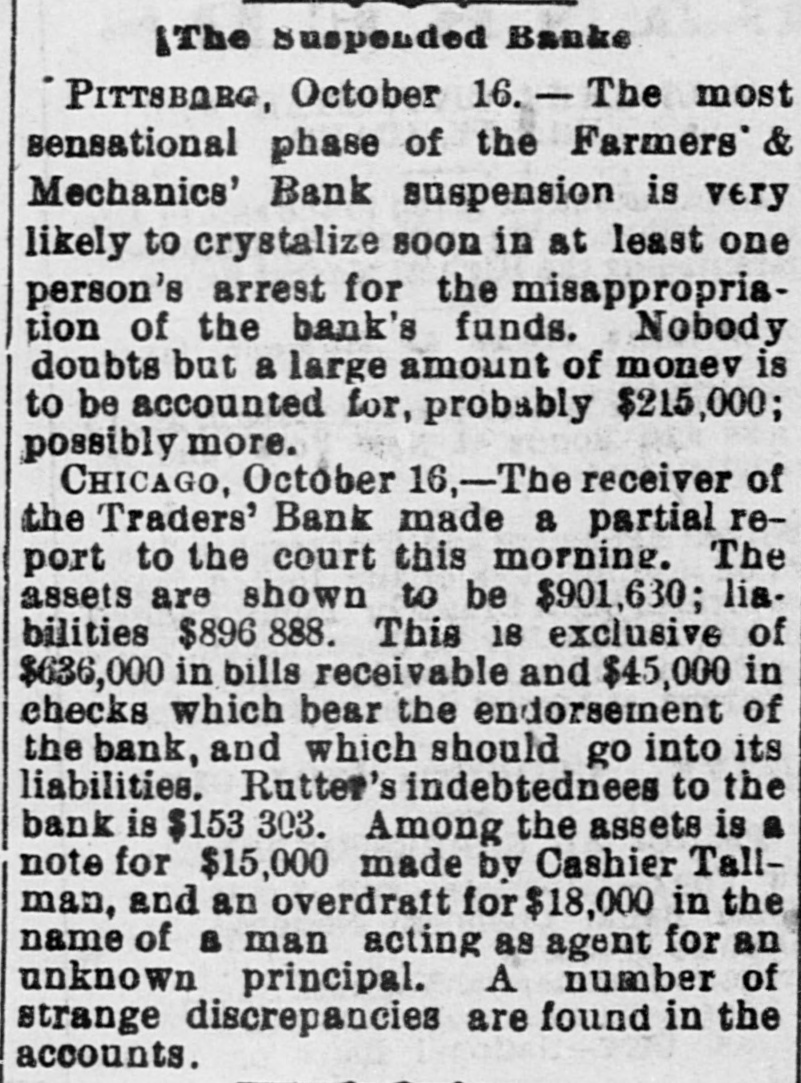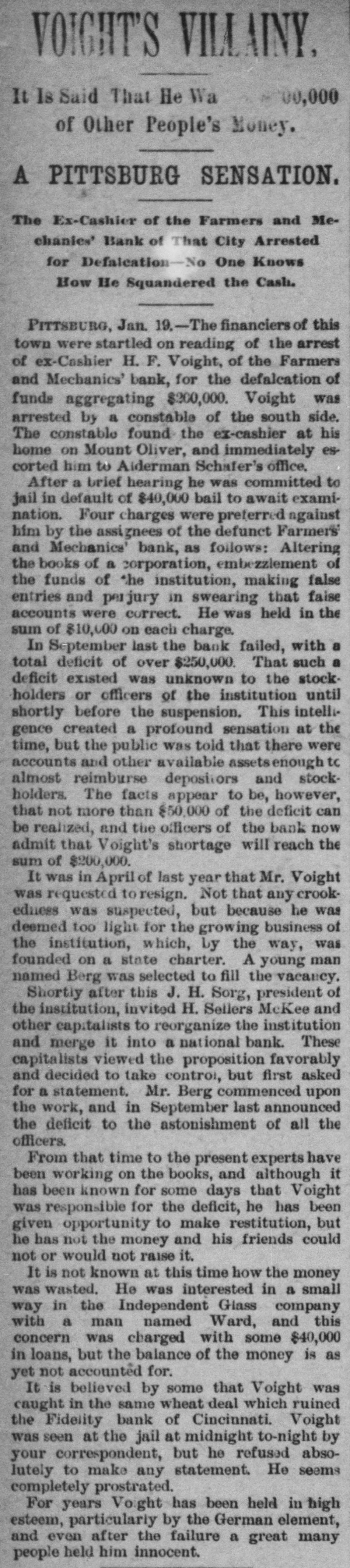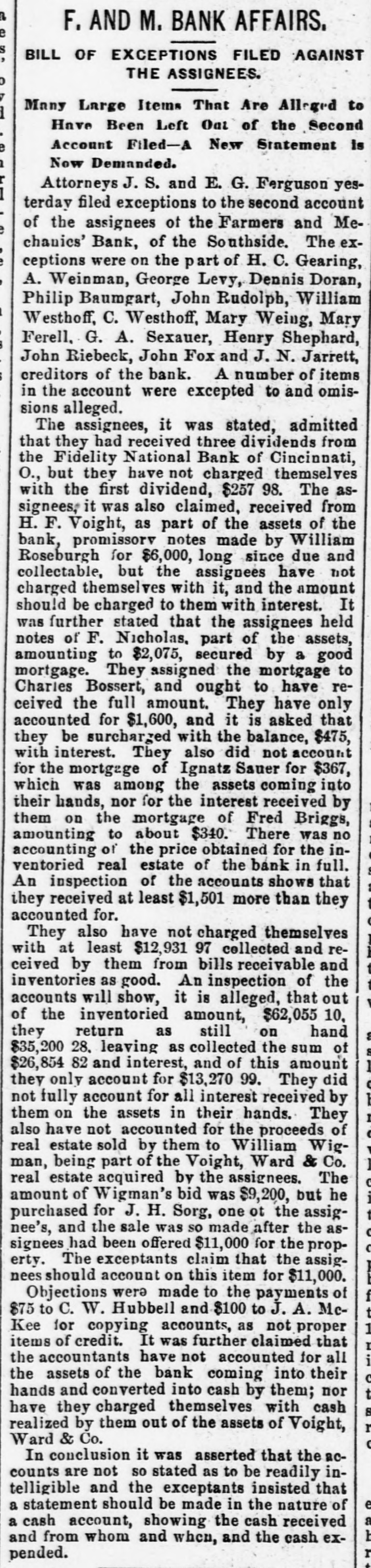 bus Territorial bill was passed substitute for the Senate measure by party vote of pus out, 1031 'sAuu :801 South Dakota, Washington and Montana Ter ritories. Thirty private pensign bills were session Sujueso em 10 pessed DOMESTIC. THE National Dairy Fair Association of 18 4791 1he uo organized SUM America Springtield, III. The purpose of the incorArtig 10 exhibitions DATE 07 SI D products. GILA BENITA, a cowboy in Montana, while 1314 the uo Indian Appach UB SU pessorp attacked a party of Mexican herders, killing five and wounding one. AT Marietta, U., William Weitzel, aged sixteen years, shot George Farnsworth on the 15th, killing him instantly GEORGE MEADOWS, the negro who re. cently assaulted Mrs. Kellam near Pratt 041 uo qour 8 sq peSueq SEM Ala Minos, 1514 MRS. EMMA THOMPSON brought suit in Cincinnati on the 15th for divorce, charg ing that her husband, John I. Thompson, had wives living in six different cities. J J. CLARK and Mrs. M. J. Wright, clairvoyants, were arrested in New Haven, MBI blue PIO uu Jepun 4391 the uo which provides for the punishment of fortune-tellers. WILLIAM WENTZEL shot and killed Frank Farnsworth on the 15th at Marietta, O., while the two were playing White Caps. B pournq 1514 the tto Mara V factory in New York, and three girls lost their lives in the flames. WILLIAM HODGES, a young boy living near Atlanta, Ga., committed suicide on up steep 01 p101 SEM life because 4721 en the kitchen. MRS. ARTHUR RODDEY was burned to B an poan(u) her puu d fire in a small dwelling at Pittsburgh, Pa., 1664 out uo HARRISON DAWLEY, of Rochester, III., December Sop a B sq bitten SEM oqm 3, died on the 16th of hydrophobia. MRS. COURTNEY, living near Hale's Springs, Tenn., went to church on the 16th, first locking up her two children in the house. Upon her return she found both her little ones dead, their clothes having ignited from the place. IN Pittsburgh on the 16th T. V. Powderly denounced Barry as an Anarchist, and XO SUAL ou reason that 101 SEM # pies pelled from the Knights of Labo MRS. JOHN GREER, wife of a lumberman at Sunshine, Pa., killed her babe and Sujen 1974. the uo subject committed then out 40J имоия SUM osneo No 8 deed. 140 that 4791 the uo SEM 11 puq "puI 18 Kanf ривля found indictments against thirty five persons for violation of the election law u! 4191 eye uo pepp Alsace township, Pa., aged eighty years. When twenty-two years old deceased be10 pojed e aoj pus came siq up 188J SEM 04 Areas every KIJU 07 mill puos 07 refusits spuers his "moor unitsu us AN old man, rudely clad and with unkept hair and beard, who gave his name as A. Squires, went into the Philadelphia on claim his релола puu 4391 the uo quiut at there SEAL that plos up $2.200 1855. SUM ese JO Fords not NVW V captured while running wild near James town, Ky., on the 16th. He lived on roots, siq 1101 you could pue bothing puu sinu name AN unknown man, assisted by a little 001 JO teller the thicked 11118 10.8 pue 4191 1he 110 "end "Iⁿᴴ 18 Bank 009'2$ 4714 AUMB IT was announced on the 16th that the IV 18 [ Chinese B 10 and peq Francisco use mo.r "Bg 'Sueq cipitated a genuine war of races, with the negro women on the one side and the terrified Chinaman on the other. HUTTON PARK, at West Orange, N. J., was Products our 000'1218 JOJ 1044 our uo PIO8 was originally purchased from the Indithere 'sunD OM1 JOJ 1291 'gI Marroh sue coats and thirteen cans of rum. WILLIAM JAMES, a farmer living four miles east of Somerset, Ky., struck a stream of pure petroleum on the 16th. SEVERAL citizens of Wabash, Ind,, re ceived notices on the 17th from White Caps stating that unless they mended their ways they would be whipped. THE dealers in washboards, clothespins and similar articles of domestic use formed a trust in New York on the 17th. A BOY named Chandler was caught in the machinery of a cigarette factory at Lynchburg, Va., on the 17th and crushed dealh 07 ALL the miners at Bromwell, W. Va, and in the immediate section, over four thousand in number, went out on a strike Include JOAO SUM thouble 140 4721 the uo cars. MOONSHINERS were causing much trouble Charlotte 30 Atentity our ut 4721 the uo ON AT Sioux City, Ia., Mrs. C. A. Ralph, an English woman, rose from the dinner deed berson the pue 4721 the uo table H. F. VOIGHT, former cashier of the Farmers and Mechanics' Bank of Pitts burgh, Pa, which failed in September with liabilities of $250,000, was arrested e JO charge the uo 421 140 uo 0000002$ EORGE HACKER, an Indianapolis Anarchist who stabbed his employer, James Bruce, because the latter expressed gratification at the election of General Har-inoj 01 4721 the uo servenced SEAL teen years in the penitentiary AT the death on the 17th of William -sip SEM 91 'Roqsmen Louis 78 e Reane's covered that he had amassed a fortune of $18,050, the largest portion of which was invested in bonds and securities. June p.1 cithts pun porpuny euo and versary of Benjamin Franklin's natal day was fittingly observed in various places on the 17th by typographical societies. ADAM BERKELS, of Hillsboro, O., brought suit on the 17th for damages against sixteen citizens of Brown County for an assault committed upon him in their capacity as "White Caps. JAMES P. NEARY, cashier of the Mutual Union Telegraph Company of Boston, was arrested on the 17th, charged with embezzling $2,000 of the company's money. GEORGE MEADOWS, the negro who was recently lynched at Pratt Mines, Ala., as the assailant of Mrs. Kellmer, was on the 17th found to have been innocent of the crime for which he died. The real culprit 1181 u! peuguoo SUM A MAN named Beecher, living near the Buck Shoals silver mines in Indiana, was carelessly handling a can of blasting powder on the 17th when it exploded, blowing away half his head and one hand. uo Monats SUM 1 JO VIGA V Mitheral 10 north mille 8 1184 4721 our SIM Point рошви now OM1 I I Potesn' 1V and Harris shot each other to death on the the possector OUAL bystander 8 pus 4721 рерипом S