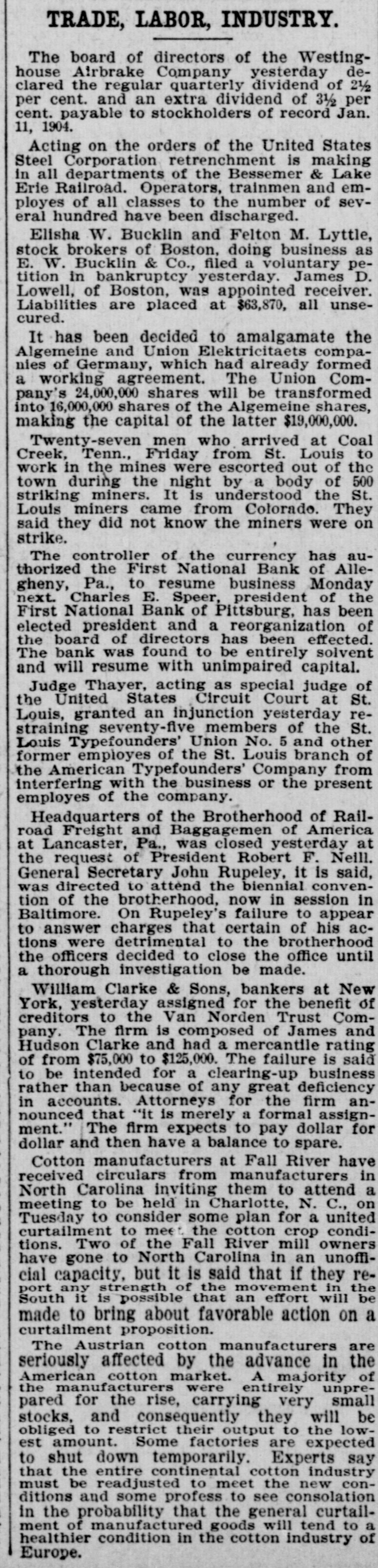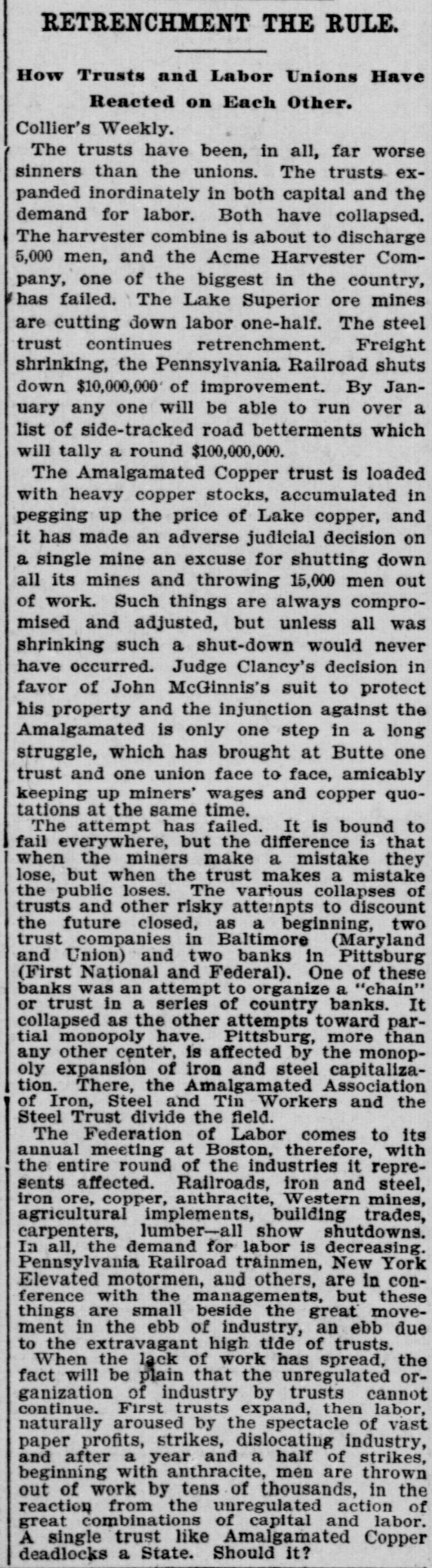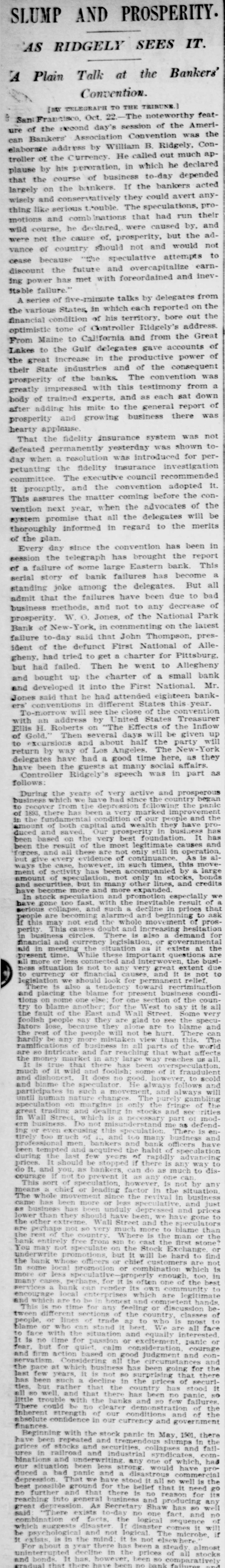 SLUMP AND PROSPERITY. AS RIDGELY SEES IT. A Plain Talk at the Bankers' Convention. [ntr TELEGRAPH TO THE TRIBUNE.] & SantFrancisco, Oct. 22.-The noteworthy feature of the second day's session of the American Bankers' Association Convention was the elaborate address by William B. Ridgely, Controller of the Currency. He called out much applause by his peroration, in which he declared that the course of business to-day depended largely on the bankers. If the bankers acted wisely and conservatively they could avert anything like serious trouble. The speculations, promotions and combinations that had run their wild course, he declared. were caused by, and were not the cause of, prosperity, but the advance of country should not and would not cease because "the speculative attempts to discount the future and overcapitalize earning power has met with foreordained and inevitable failure." A series of five-minate talks by delegates from the various States, in which each reported on the financial condition of his territory, bore out the optimistic tone of Controller Ridgely's address From Maine to California and from the Great Lakes to the Gulf delegates gave accounts of the great increase in the productive power of their State industries and of the consequent prosperity of the banks. The convention was greatly impressed with this testimony from a body of trained experts, and as each sat down after adding his mite to the general report of prosperity and growing business there was hearty applause That the fidelity insurance system was not defeated permanently yesterday was shown today when a resolution was introduced for perpetuating the fidelity insurance investigation committee The executive council recommended It promptly, and the convention adopted It. This assures the matter coming before the convention next year, when the advocates of the system promise that all the delegates will be thoroughly informed in regard to the merits of the plan. Every day since the convention has been in session the telegraph has brought the report of a failure of some large Eastern bank. This serial story of bank failures has become a standing joke among the delegates. But all admit that the failures have been due to bad business methods, and not to any decrease of prosperity. W O. Jones, of the National Park Bank of New-York, in commenting on the latest failure to-day said that John Thompson, president of the defunct First National of Allegheny, had tried to get a charter for Pittsburg, but had failed. Then he went to Allegheny and bought up the charter of a small bank and developed it into the First National. Mr. Jones said that he had attended eighteen bankers conventions in different States this year. To-morrow will see the close of the convention with an address by United States Treasurer Ellis H. Roberts on "The Effects of the Inflow of Gold." Then several days will be given up to excursions and about half the party will return by way of Los Angeles. The New-York delegates have had a good time here, as they have been the guests at many social affairs. Controller Ridgely's speech was in part as follows: During the years of very active and prosperous business which we have had since the country began to recover from the depression following the panic of 1893, there has been a very marked improvement in the fundamental condition of our people and the amount of both capital and wealth they have produced and saved Our prosperity in business has been based on the very best foundation. It has been the result of the most legitimate causes and forces, and all these are not only still in operation, but give every evidence of continuance. As is always the case, however, in such times, this movement of activity has been accompanied by a large amount of speculation, not only in stocks, bonds and securities but in many other lines, and credits have become more and more expanded. In stock speculation and promotion especially we have gone too fast. with the inevitable result of serious collapse, and such a decline in prices that people are becoming alarmed and beginning to ask if this may not end the whole movement of prosperity This causes doubt and increasing hesitation in business circles There is also a demand for financial and currency legislation, or governmental aid in meeting the situation as it exists at the present time While these important questions are all more or less connected and interwoven, the bustness situation is not to any very great extent due to currency or financial causes and It is not to legislation we should look for permanent relief There is also a tendency toward recrimination and placing the blame for present business conditions on some one else for one section of the country to blame another for the West to say it is all the fault of the East and Wall Street Some very foolish people say they are glad to see the specuJators lose because they alone are to blame and the rest of the people will not be hurt There can hardly be any more mistaken view than this The ramifica of business in all parts of the world are 80 intricate and far reaching that what affects the money market in any large way reaches us all It is true that there has been overspeculation much of it wild and foolish some of it fraudulent and dishonest It does no good however, to scold and blame the speculator He always follows and participates in such a movement and always will until human nature changes The purely gambling speculation on margins is only the fringe of the great trading and dealing in stocks and sec rities in Wall Street which necessary part 01 modern business Do not misunderstand me as defend. ing or even excusing this speculation There is entirely too n such of and 100 many business and professional men bankers and bank officers have been tempted and acquired the habit of speculation during the last few years of rapidly advancing prices It should be stopped if there is any way to do It. and you as bankers can do as 