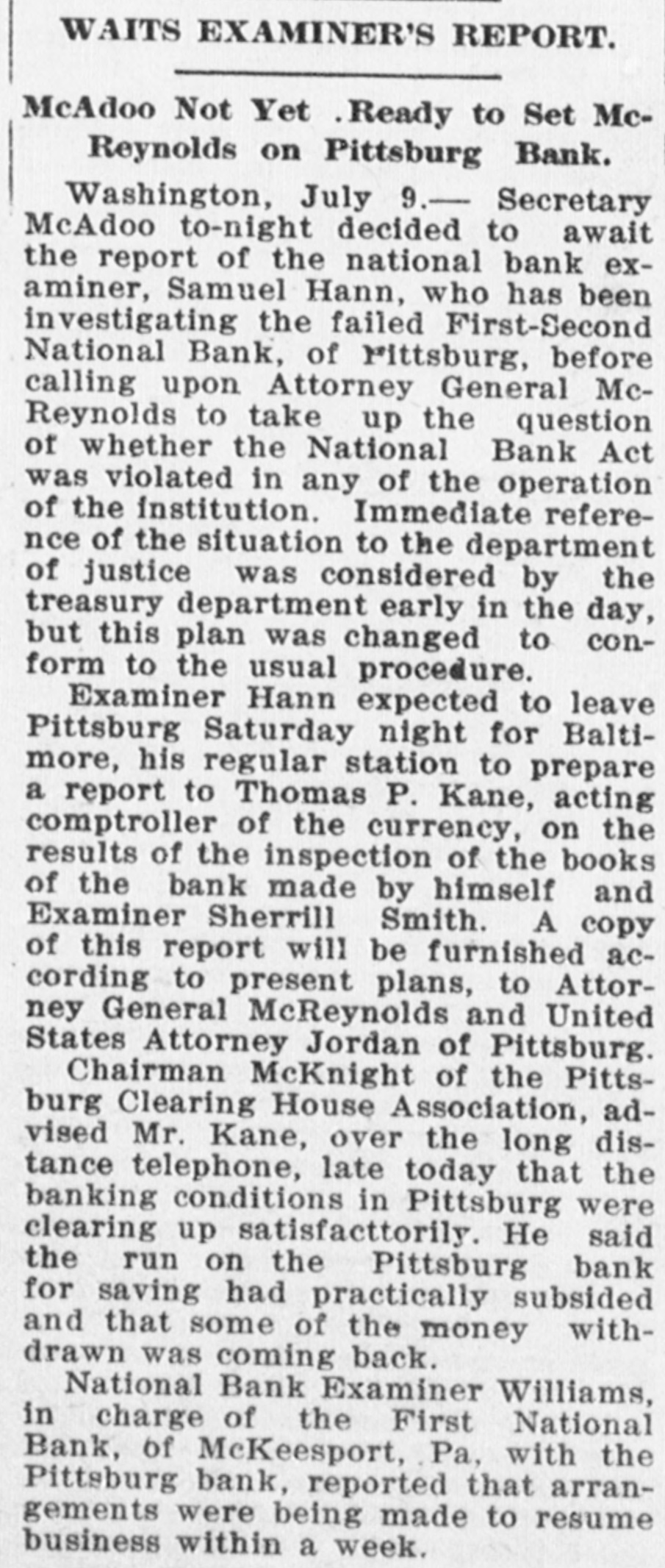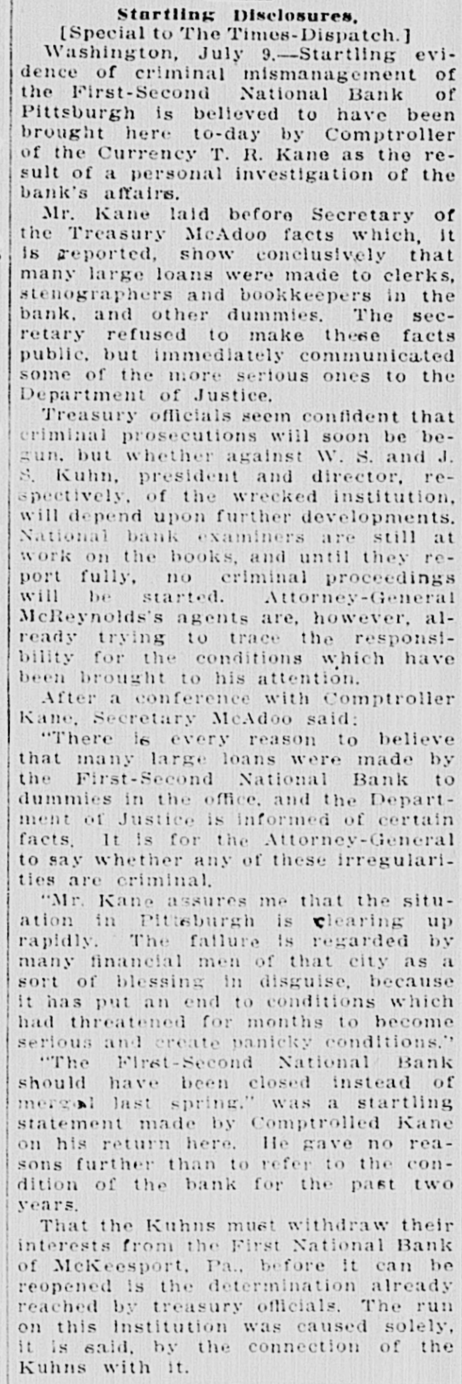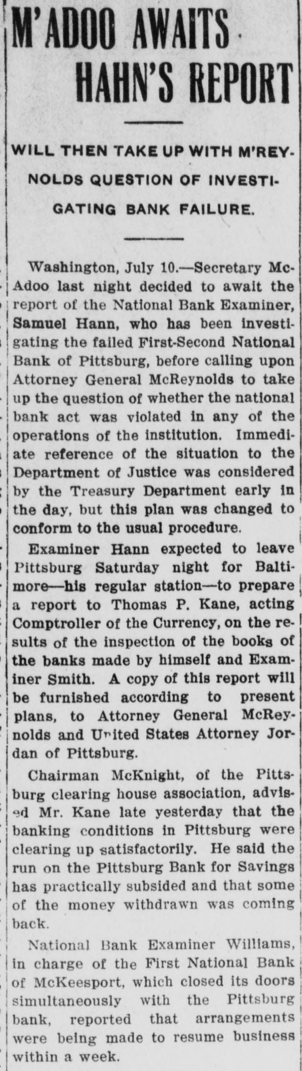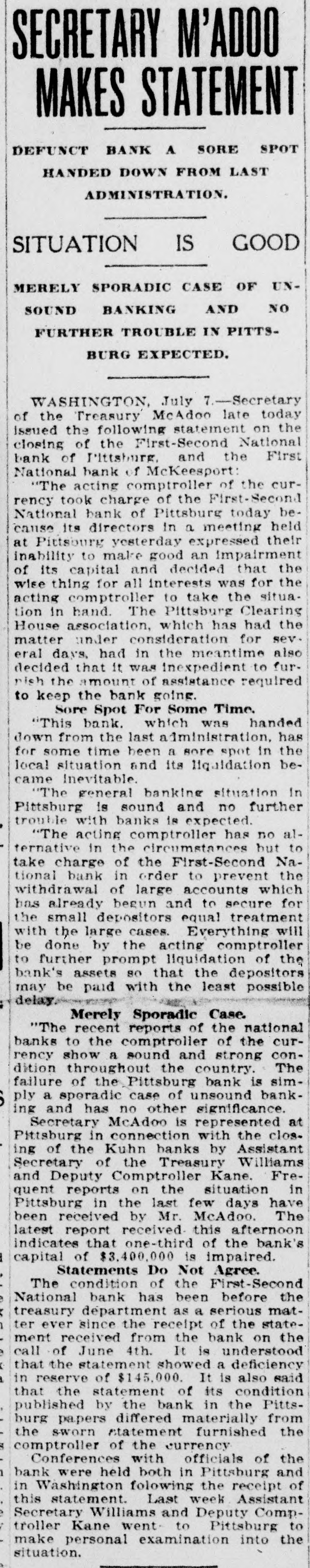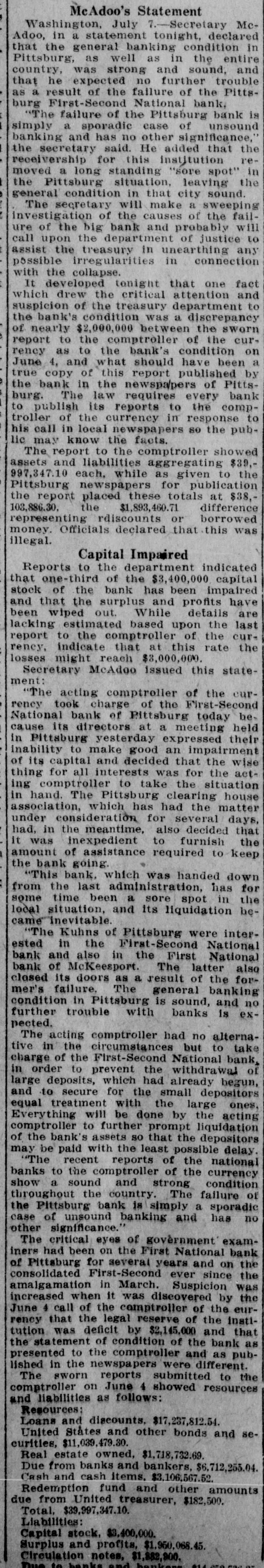 Washington, July 7. Secretary McAdoo, in a statement tonight, declared that the general banking condition in as well as in the entire was strong no country, that Pittsburg, he expected and further of sound, the trouble Pitts- and as a result of the failure burg First-Second National bank, 'The failure of the Pittsburg bank is simply a sporadic case of unsound banking and has no other significance," the secretary said. He added that the receivership for this institution removed a long standing "sore spot" in the Pittsburg situation, leaving the general condition in that city sound. The secretary will make a sweeping investigation of the causes of the failure of the big bank and probably will call upon the department of justice to assist the treasury in unearthing any possible irregularities in connection with the collapse. It developed tonight that one fact which drew the critical attention and suspicion of the treasury department to the bank's condition was a discrepancy of nearly $2,000,000 between the sworn report to the comptroller of the currency as to the bank's condition on June 4, and what should have been a true copy of this report published by the bank in the newspapers of Pittsburg. The law requires every bank to publish its reports to the comptroller of the currency in response to his call in local newspapers so the public may know the facts. The report to the comptroller showed assets and liabilities aggregating $39,997,347.10 each, while as given to the Pittsburg newspapers for publication the report placed these totals at $38,103,886.30, the $1,893,460.71 difference representing rdiscounts or borrowed money Officials declared that this was illegal. Capital Impaired Reports to the department indicated that one-third of the $3,400,000 capital stock of the bank has been impaired and that the surplus and profits have been wiped out. While details are lacking estimated based upon the last report to the comptroller of the curreney, indicate that at this rate the losses might reach $3,000,000. Secretary McAdoo issued this statement: "The acting comptroller of the curreney took charge of the First-Second National bank of Pittsburg today because its directors at a meeting held in Pittsburg yesterday expressed their inability to make good an impairment of its capital and decided that the wise thing for all interests was for the acting comptroller to take the situation in hand. The Pittsburg clearing house association, which has had the matter under consideration for several days, had, in the meantime, also decided that it was inexpedient to furnish the amount of assistance required to keep the bank going. "This bank. which was handed down from the last administration, has for some time been a sore spot in the local situation, and its liquidation became inevitable. "The Kuhns of Pittsburg were interested in the First-Second National bank and also in the First National bank of McKeesport. The latter also closed its doors as a result of the former's failure. The general banking condition in Pittsburg is sound, and no further trouble with banks is expected. The acting comptroller had no alternative in the circumstances but to take in charge of the First-Second National bank, order to prevent the withdrawal of large deposits, which had already begun, and to secure for the small depositors equal treatment with the large ones, Everything will be done by the acting comptroller to further prompt liquidation of the bank's assets so that the depositors may be paid with the least possible delay. 'The recent reports of the national banks to the comptroller of the currency show a sound and strong condition throughout the country. The failure of the Pittsburg bank is simply a sporadic case of unsound banking and has no other significance." The critical eyes of government examiners had been on the First National bank of Pittsburg for several years and on the consolidated First-Second ever since the amalgamation in March. Suspicion was increased when it was discovered by the 4 call of the comptroller of the eurJune that the legal reserve of the instirency was deficit by $2,145,000 and that tution statement of condition of the bank as presented the to the comptroller and as published in the newspapers were different. The sworn reports submitted to the comptroller on June 4 showed resources and liabilities as follows: Loans Resources: and discounts, $17,237,812.54. United States and other bonds and securities, $11,039,479.30 Real estate owned, $1,718,732.69 Due from banks and bankers, $6,712,255.04. Cash and cash items. $3,106,567.52. Redemption fund and other amounts due from United treasurer, $182,500. Total, $39,997,347.10. Liabilities: Capital stock. $3,400,000. Surplus and profits, $1,960,068.45 Circulation notes, $1,882,900. Due to hanks and hankora