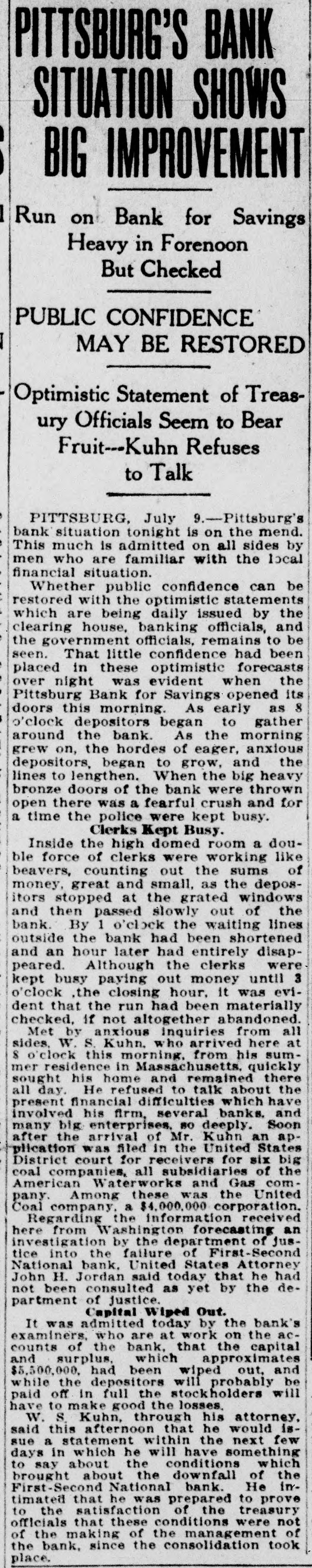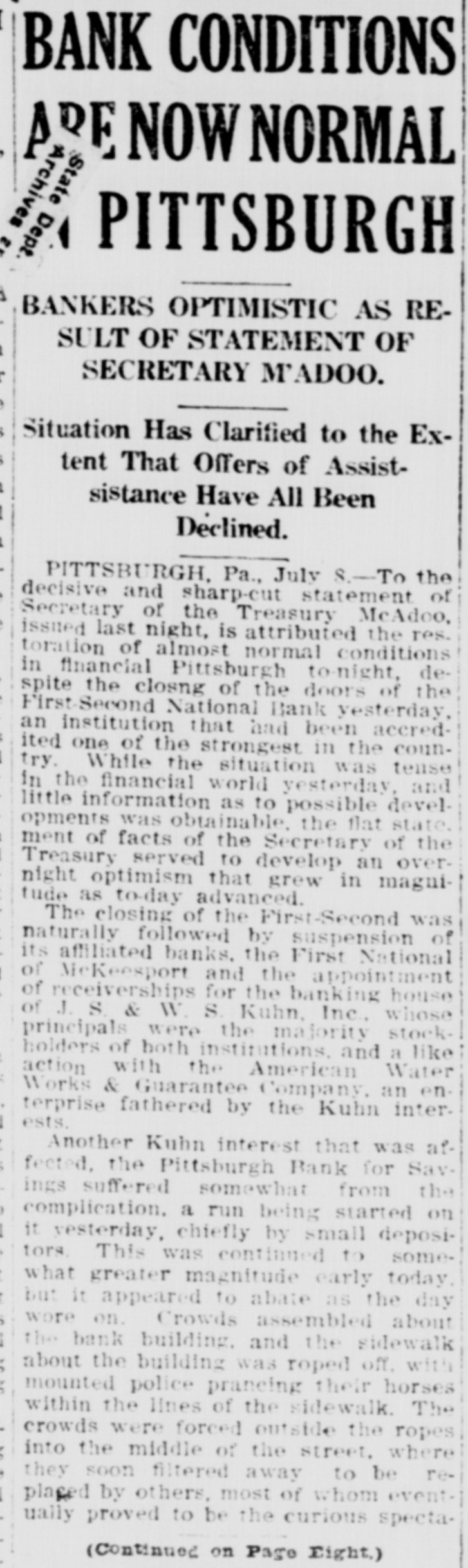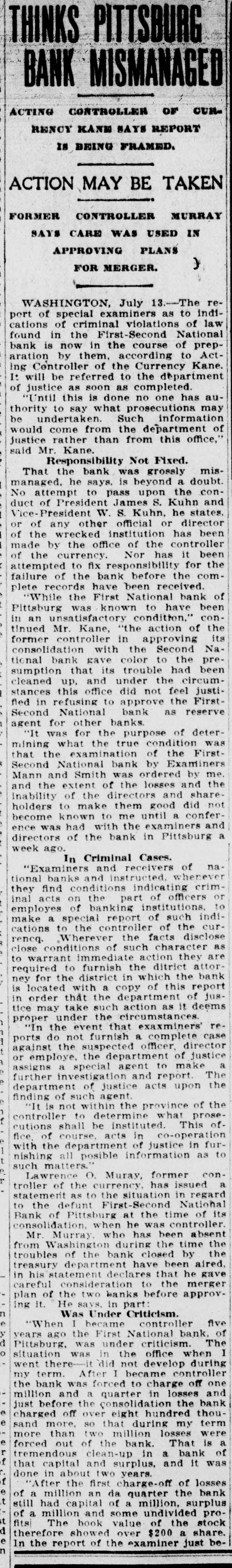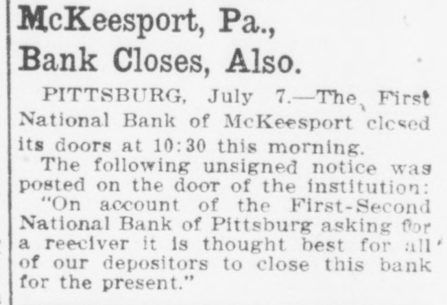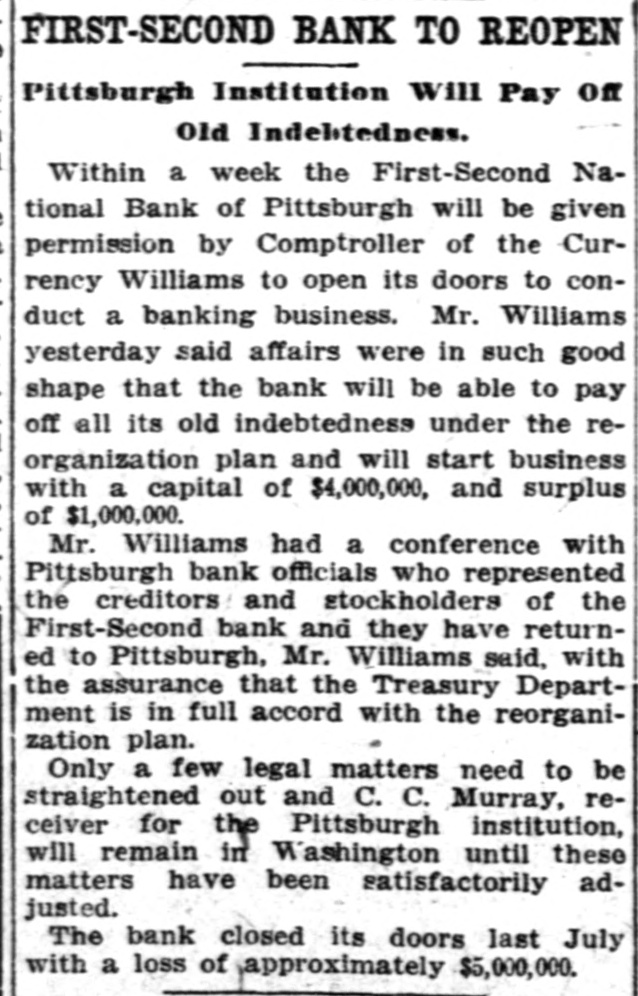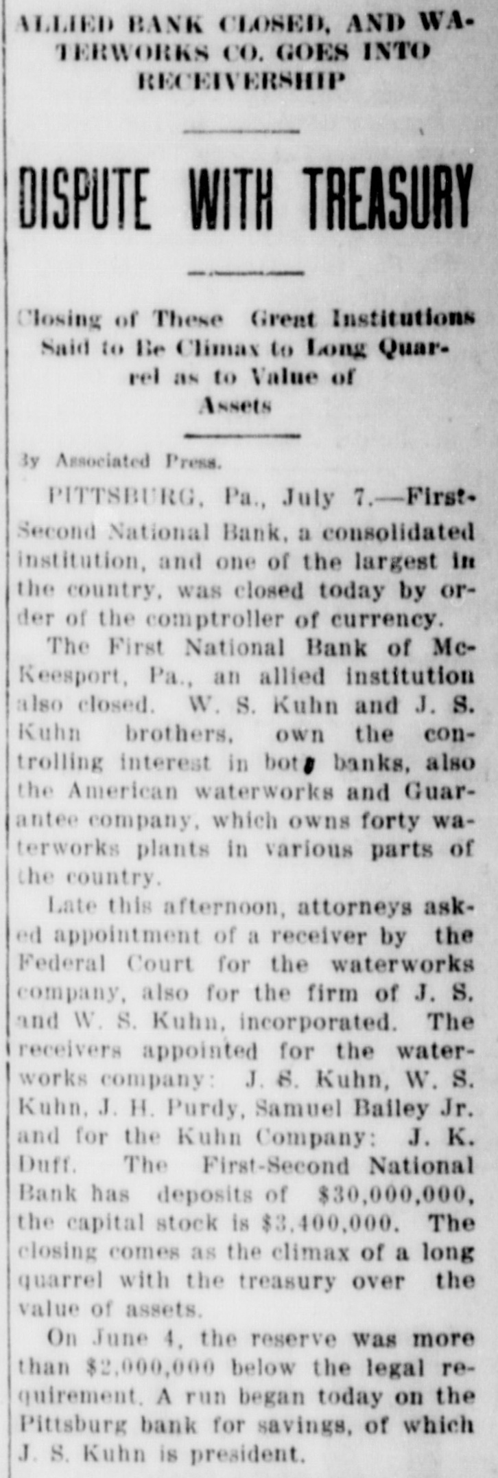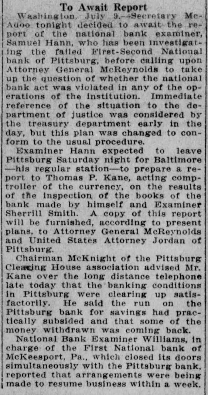 Washington, July 7. Secretary McAdoo, in a statement tonight, declared that the general banking condition in as well as in the entire was strong no country, that Pittsburg, he expected and further of sound, the trouble Pitts- and as a result of the failure burg First-Second National bank, 'The failure of the Pittsburg bank is simply a sporadic case of unsound banking and has no other significance," the secretary said. He added that the receivership for this institution removed a long standing "sore spot" in the Pittsburg situation, leaving the general condition in that city sound. The secretary will make a sweeping investigation of the causes of the failure of the big bank and probably will call upon the department of justice to assist the treasury in unearthing any possible irregularities in connection with the collapse. It developed tonight that one fact which drew the critical attention and suspicion of the treasury department to the bank's condition was a discrepancy of nearly $2,000,000 between the sworn report to the comptroller of the currency as to the bank's condition on June 4, and what should have been a true copy of this report published by the bank in the newspapers of Pittsburg. The law requires every bank to publish its reports to the comptroller of the currency in response to his call in local newspapers so the public may know the facts. The report to the comptroller showed assets and liabilities aggregating $39,997,347.10 each, while as given to the Pittsburg newspapers for publication the report placed these totals at $38,103,886.30, the $1,893,460.71 difference representing rdiscounts or borrowed money Officials declared that this was illegal. Capital Impaired Reports to the department indicated that one-third of the $3,400,000 capital stock of the bank has been impaired and that the surplus and profits have been wiped out. While details are lacking estimated based upon the last report to the comptroller of the curreney, indicate that at this rate the losses might reach $3,000,000. Secretary McAdoo issued this statement: "The acting comptroller of the curreney took charge of the First-Second National bank of Pittsburg today because its directors at a meeting held in Pittsburg yesterday expressed their inability to make good an impairment of its capital and decided that the wise thing for all interests was for the acting comptroller to take the situation in hand. The Pittsburg clearing house association, which has had the matter under consideration for several days, had, in the meantime, also decided that it was inexpedient to furnish the amount of assistance required to keep the bank going. "This bank. which was handed down from the last administration, has for some time been a sore spot in the local situation, and its liquidation became inevitable. "The Kuhns of Pittsburg were interested in the First-Second National bank and also in the First National bank of McKeesport. The latter also closed its doors as a result of the former's failure. The general banking condition in Pittsburg is sound, and no further trouble with banks is expected. The acting comptroller had no alternative in the circumstances but to take in charge of the First-Second National bank, order to prevent the withdrawal of large deposits, which had already begun, and to secure for the small depositors equal treatment with the large ones, Everything will be done by the acting comptroller to further prompt liquidation of the bank's assets so that the depositors may be paid with the least possible delay. 'The recent reports of the national banks to the comptroller of the currency show a sound and strong condition throughout the country. The failure of the Pittsburg bank is simply a sporadic case of unsound banking and has no other significance." The critical eyes of government examiners had been on the First National bank of Pittsburg for several years and on the consolidated First-Second ever since the amalgamation in March. Suspicion was increased when it was discovered by the 4 call of the comptroller of the eurJune that the legal reserve of the instirency was deficit by $2,145,000 and that tution statement of condition of the bank as presented the to the comptroller and as published in the newspapers were different. The sworn reports submitted to the comptroller on June 4 showed resources and liabilities as follows: Loans Resources: and discounts, $17,237,812.54. United States and other bonds and securities, $11,039,479.30 Real estate owned, $1,718,732.69 Due from banks and bankers, $6,712,255.04. Cash and cash items. $3,106,567.52. Redemption fund and other amounts due from United treasurer, $182,500. Total, $39,997,347.10. Liabilities: Capital stock. $3,400,000. Surplus and profits, $1,960,068.45 Circulation notes, $1,882,900. Due to hanks and hankora