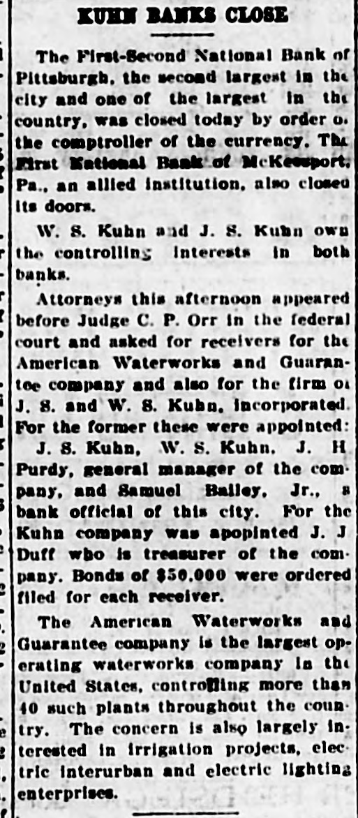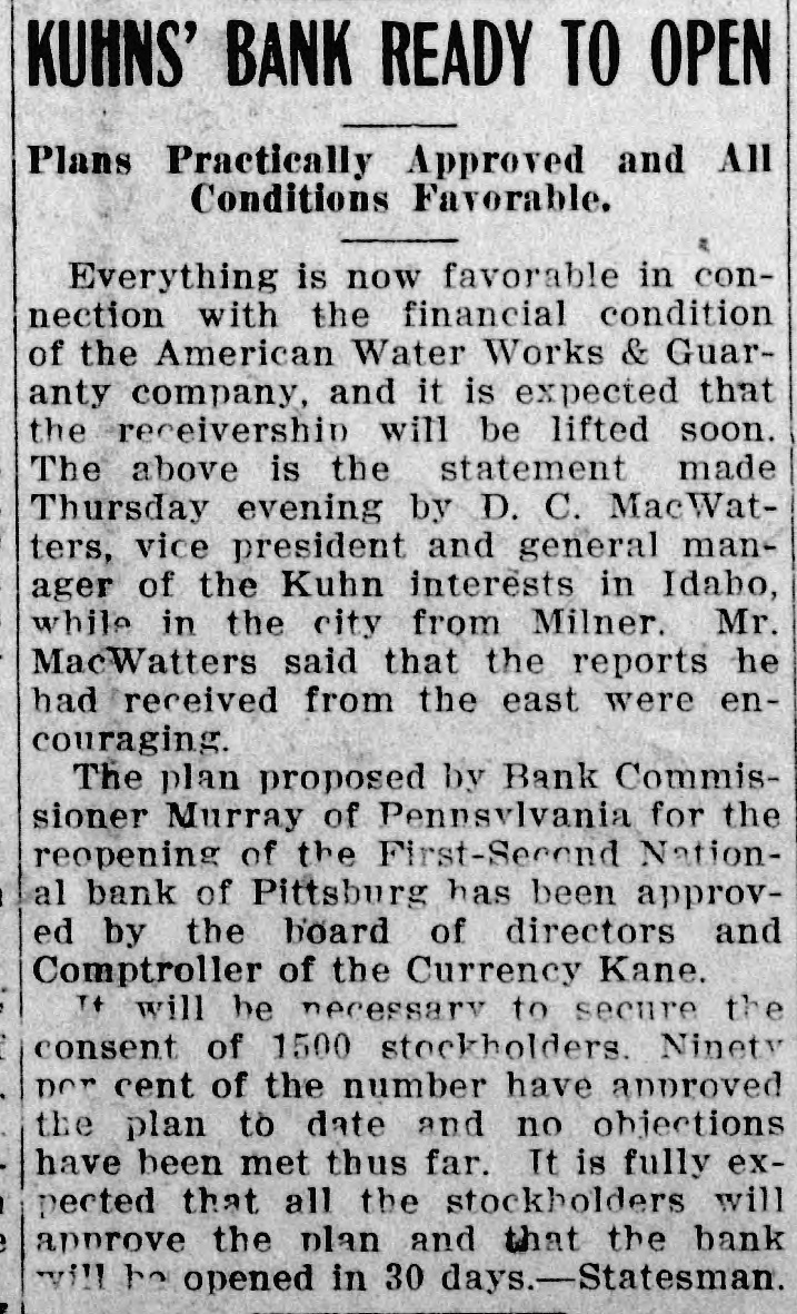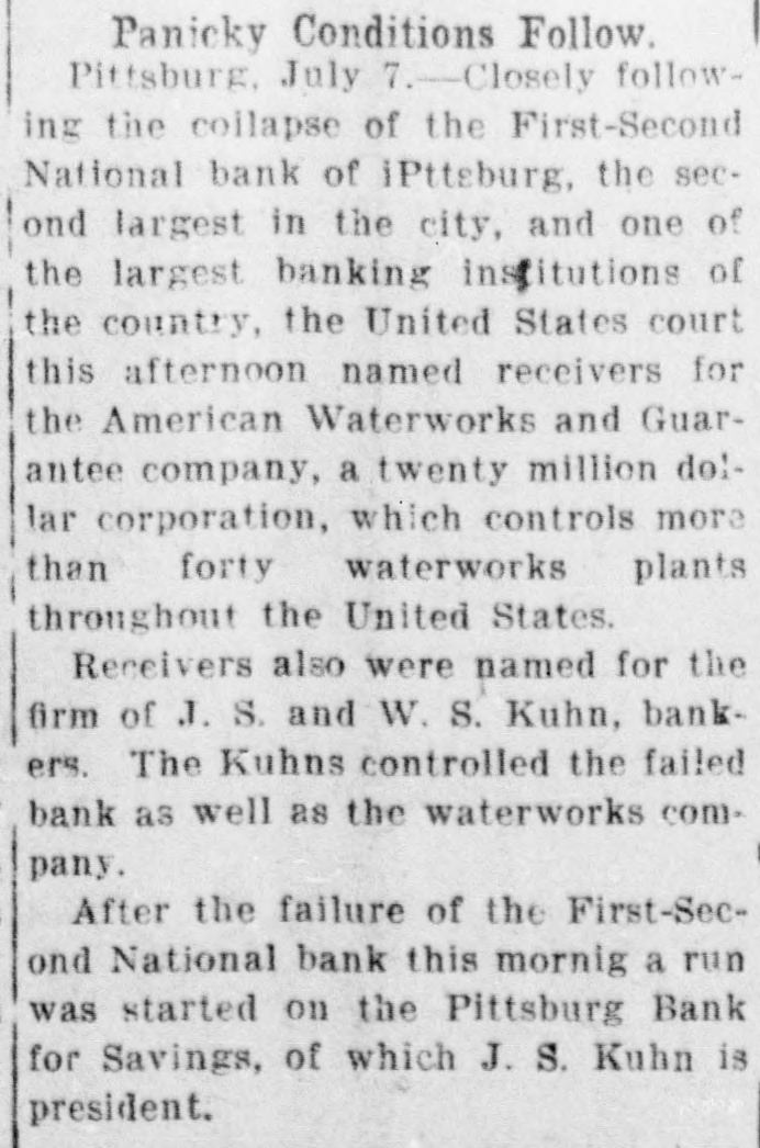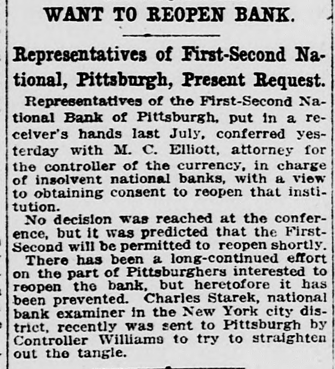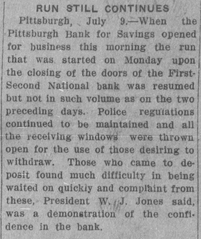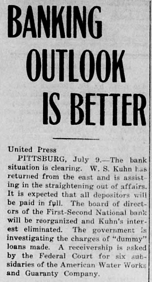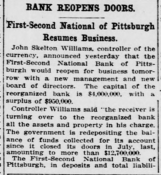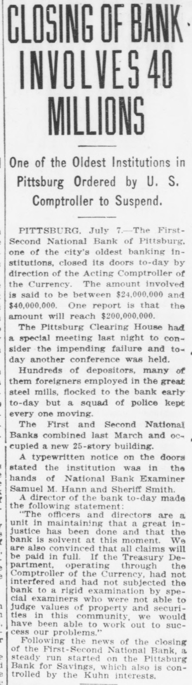 Washington, July 7. Secretary McAdoo, in a statement tonight, declared that the general banking condition in as well as in the entire was strong no country, that Pittsburg, he expected and further of sound, the trouble Pitts- and as a result of the failure burg First-Second National bank, 'The failure of the Pittsburg bank is simply a sporadic case of unsound banking and has no other significance," the secretary said. He added that the receivership for this institution removed a long standing "sore spot" in the Pittsburg situation, leaving the general condition in that city sound. The secretary will make a sweeping investigation of the causes of the failure of the big bank and probably will call upon the department of justice to assist the treasury in unearthing any possible irregularities in connection with the collapse. It developed tonight that one fact which drew the critical attention and suspicion of the treasury department to the bank's condition was a discrepancy of nearly $2,000,000 between the sworn report to the comptroller of the currency as to the bank's condition on June 4, and what should have been a true copy of this report published by the bank in the newspapers of Pittsburg. The law requires every bank to publish its reports to the comptroller of the currency in response to his call in local newspapers so the public may know the facts. The report to the comptroller showed assets and liabilities aggregating $39,997,347.10 each, while as given to the Pittsburg newspapers for publication the report placed these totals at $38,103,886.30, the $1,893,460.71 difference representing rdiscounts or borrowed money Officials declared that this was illegal. Capital Impaired Reports to the department indicated that one-third of the $3,400,000 capital stock of the bank has been impaired and that the surplus and profits have been wiped out. While details are lacking estimated based upon the last report to the comptroller of the curreney, indicate that at this rate the losses might reach $3,000,000. Secretary McAdoo issued this statement: "The acting comptroller of the curreney took charge of the First-Second National bank of Pittsburg today because its directors at a meeting held in Pittsburg yesterday expressed their inability to make good an impairment of its capital and decided that the wise thing for all interests was for the acting comptroller to take the situation in hand. The Pittsburg clearing house association, which has had the matter under consideration for several days, had, in the meantime, also decided that it was inexpedient to furnish the amount of assistance required to keep the bank going. "This bank. which was handed down from the last administration, has for some time been a sore spot in the local situation, and its liquidation became inevitable. "The Kuhns of Pittsburg were interested in the First-Second National bank and also in the First National bank of McKeesport. The latter also closed its doors as a result of the former's failure. The general banking condition in Pittsburg is sound, and no further trouble with banks is expected. The acting comptroller had no alternative in the circumstances but to take in charge of the First-Second National bank, order to prevent the withdrawal of large deposits, which had already begun, and to secure for the small depositors equal treatment with the large ones, Everything will be done by the acting comptroller to further prompt liquidation of the bank's assets so that the depositors may be paid with the least possible delay. 'The recent reports of the national banks to the comptroller of the currency show a sound and strong condition throughout the country. The failure of the Pittsburg bank is simply a sporadic case of unsound banking and has no other significance." The critical eyes of government examiners had been on the First National bank of Pittsburg for several years and on the consolidated First-Second ever since the amalgamation in March. Suspicion was increased when it was discovered by the 4 call of the comptroller of the eurJune that the legal reserve of the instirency was deficit by $2,145,000 and that tution statement of condition of the bank as presented the to the comptroller and as published in the newspapers were different. The sworn reports submitted to the comptroller on June 4 showed resources and liabilities as follows: Loans Resources: and discounts, $17,237,812.54. United States and other bonds and securities, $11,039,479.30 Real estate owned, $1,718,732.69 Due from banks and bankers, $6,712,255.04. Cash and cash items. $3,106,567.52. Redemption fund and other amounts due from United treasurer, $182,500. Total, $39,997,347.10. Liabilities: Capital stock. $3,400,000. Surplus and profits, $1,960,068.45 Circulation notes, $1,882,900. Due to hanks and hankora
