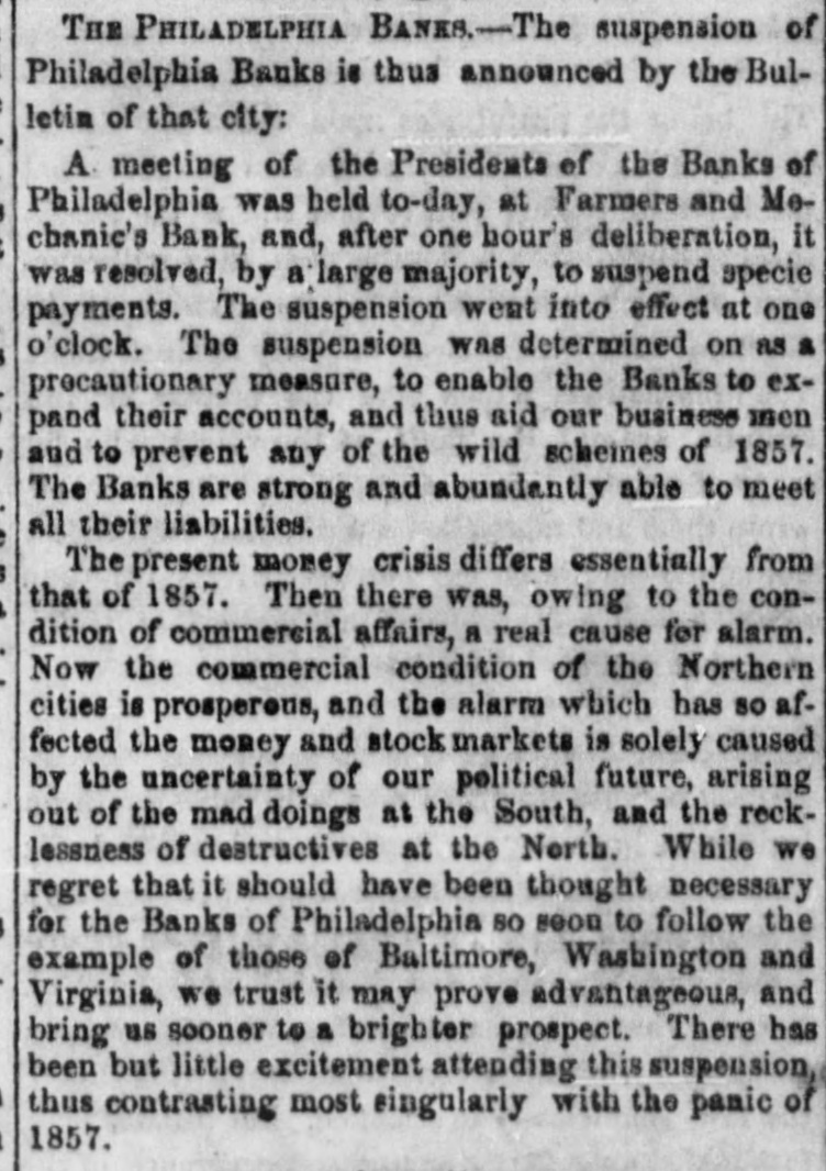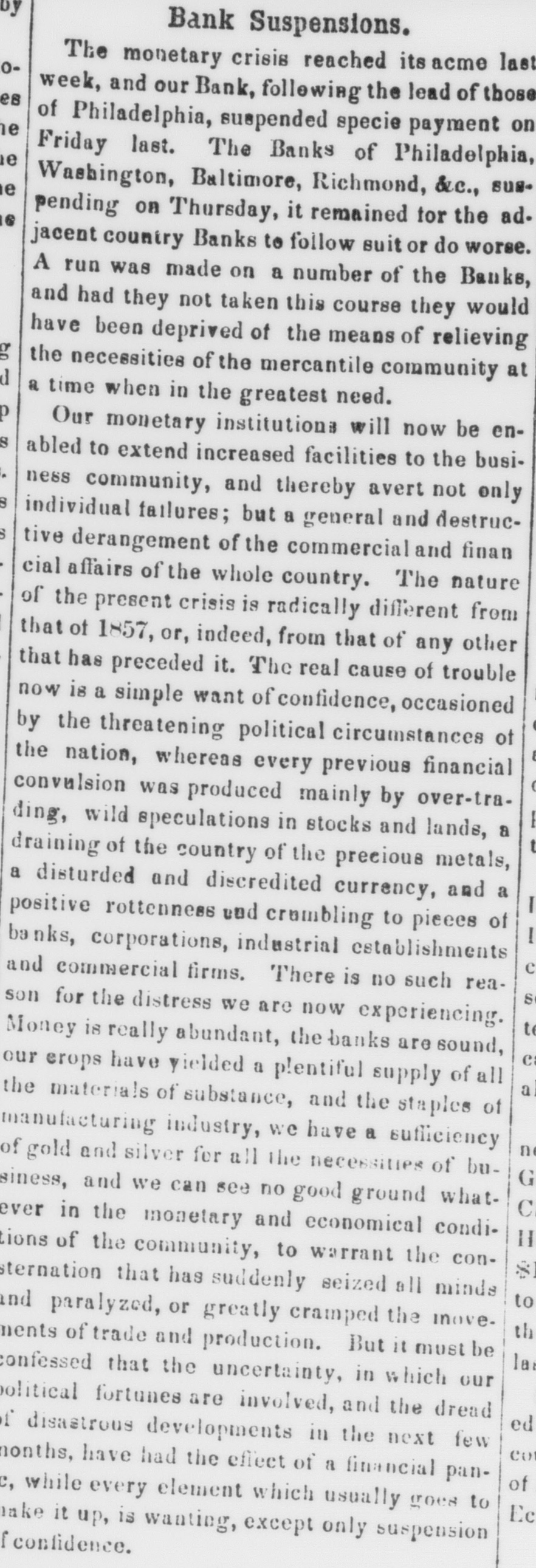 by Bank Suspensions. The monetary crisis reached itsacme last oes week, and our Bank, following the lead of those e of Philadelphia, suspended specie payment on e Friday last. The Banks of Philadelphia, e Washington, Baltimore, Richmond, &c., SUNpending on Thursday, it remained for the ad. 16 jacent country Banks to follow suit or do worse. A run was made on a number of the Banks, and had they not taken this course they would have been deprived of the means of relieving the necessities of the mercantile community at a time when in the greatest need. p Our monetary institutiona will now be enS abled to extend increased facilities to the business community, and thereby avert not only S individual failures; but a general and destructive derangement of the commercial and finan cial affairs of the whole country. The nature of the present crisis is radically different from that of 1857, or, indeed, from that of any other that has preceded it. The real cause of trouble now is a simple want of confidence, occasioned by the threatening political circumstances of the nation, whereas every previous financial convulsion was produced mainly by over-trading, wild speculations in stocks and lands, a draining of the country of the precious metals, a disturded and discredited currency, and a positive rottenness end crumbling to pieces of banks, corporations, industrial establishments e and commercial firms. There is no such reaS son for the distress we are now experiencing. te Money is really abundant, the banks are sound, C our erops have yielded a plentiful supply of all a the materials of substance, and the staples of manufacturing industry, we have a sufficiency ne of gold and silver for all the necessities of buG siness, and we can see no good ground whatC ever in the monetary and economical conditions of the community, to warrant the consternation that has suddenly seized all minds to and paralyzed, or greatly cramped the move. th nents of trade and production. But it must be la confessed that the uncertainty, in which our political fortunes are involved, and the dread ed if disastrous developments in the next few cot months, have had the effect of a financial panof c, while every element which usually goes to Ec lake it up, is wanting, except only suspension f confidence.