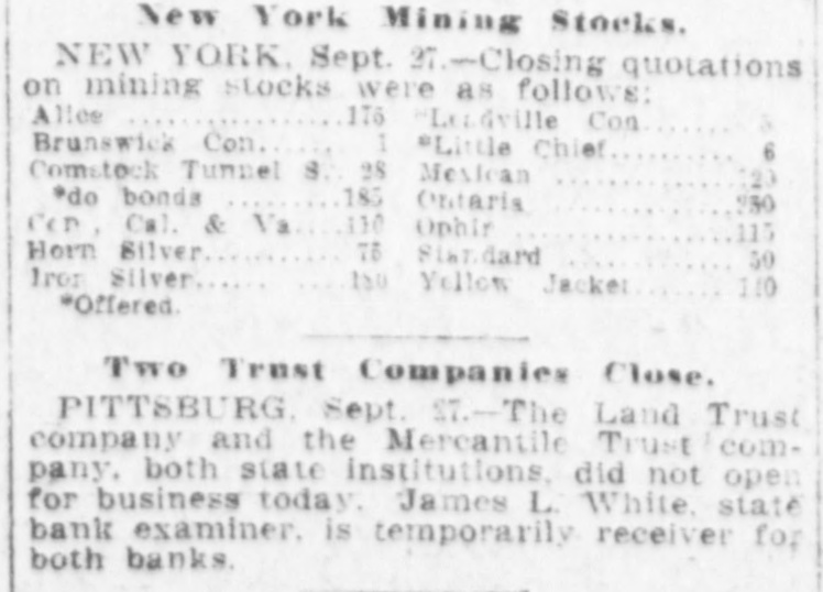 New York Mining Stocks. NEW YORK. Sept. 37.-Closing quotations on mining stocks were as follows: Allee 176 "Leadville Con Brunswick Con 1 "Little Chief 6 Comstock Tunnel 8. 28 Mexican 23 *do bonds 185 Ontaria 750 Cen, Cal. & Va 110 Ophir 115 Horn Silver 75 Sist.dard 50 Iron Silver too Yellow Jacket 110 *Offered. Two Trust Companies Close. PITTSBURG, Sept. ST.-The Land Trust company and the Mercantile Trust/company. both state institutions, did not open for business today. James L. White state bank examiner. is temporarily receiver for both banks.
