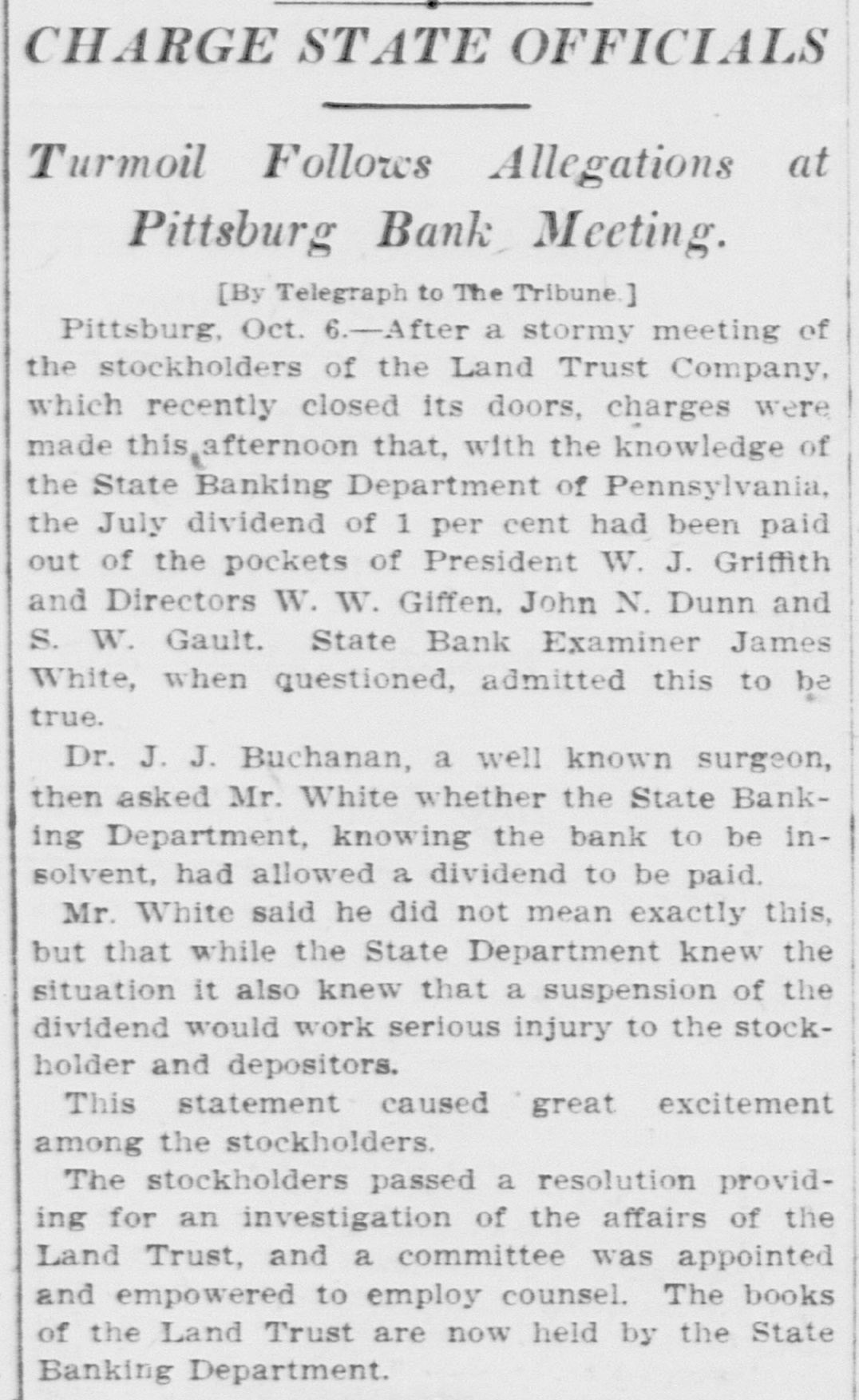 CHARGE STATE OFFICIALS Turmoil Follows Allegations at Pittsburg Bank Meeting. [By Telegraph to The Tribune.] Pittsburg, Oct. 6.-After a stormy meeting of the stockholders of the Land Trust Company, which recently closed its doors, charges were made this afternoon that, with the knowledge of the State Banking Department of Pennsylvania, the July dividend of 1 per cent had been paid out of the pockets of President W. J. Griffith and Directors W. W. Giffen, John N. Dunn and S. W. Gault. State Bank Examiner James White, when questioned, admitted this to be true. Dr. J. J. Buchanan, a well known surgeon, then asked Mr. White whether the State Banking Department, knowing the bank to be insolvent, had allowed a dividend to be paid. Mr. White said he did not mean exactly this, but that while the State Department knew the situation it also knew that a suspension of the dividend would work serious injury to the stockholder and depositors. This statement caused great excitement among the stockholders. The stockholders passed a resolution providing for an investigation of the affairs of the Land Trust, and a committee was appointed and empowered to employ counsel. The books of the Land Trust are now held by the State Banking Department.