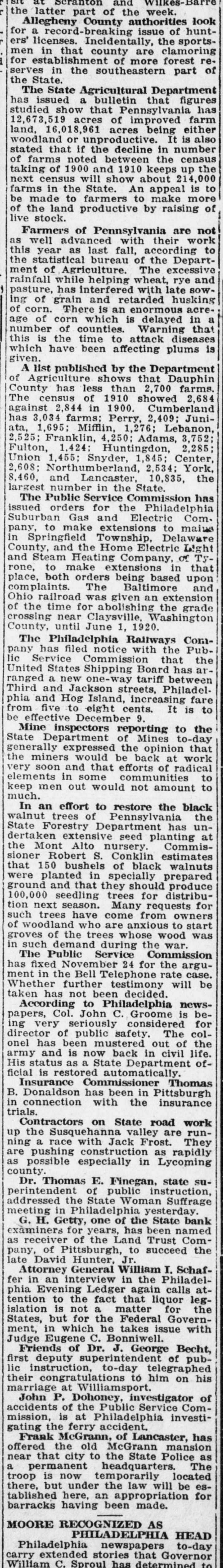 pure 12 the latter part of the week. Allegheny County authorities look for a record-breaking issue of hunters' licenses. Incidentally, the sportsmen in that county are clamoring for establishment of more forest reserves in the southeastern part of the State. The State Agricultural Department has issued a bulletin that figures studied show that Pennsylvania has 12,673,519 acres of improved farm land, 16,018,961 acres being either woodland or unproductive. It is also stated that if the decline in number of farms noted between the census taking of 1900 and 1910 keeps up the next census will show about 214,000 farms in the State. An appeal is to be made to farmers to make more of the land productive by raising of live stock. Farmers of Pennsylvania are not as well advanced with their work this year as last fall, according to the statistical bureau of the Department of Agriculture. The excessive rainfall while helping wheat, rye and pasture, has interfered with late sowIng of grain and retarded husking of corn. There is an enormous acreB up delayed st which corn JO est number of counties. Warning that this is the time to attack diseases which have been affecting plums is A given. list published by the Department of Agriculture shows that Dauphin County has less than 2,700 farms. The census of 1910 showed 2,684 against 2,844 in 1900. Cumberland has 3,034 farms; Perry. 2,409; Juniata, 1,695; Mifflin, 1,276; Lebanon, 2,525; Franklin, 1,250; Adams, 3,752; Fulton, 1.424: Huntingdon, 2,285; Union 1,455; Snyder, 1,845; Center, 2,608; Northumberland, 2.534: York, 8,460, and Lancaster, 10,835, the largest number in the State. The Public Service Commission has issued orders for the Philadelphia Suburban Gas and Electric Com. pany, to make extensions to mains in Springfield Township, Delaware County, and the Home Electric Light and Steam Heating Company, of Tyrone, to make extensions in that place, both orders being based upon complaints. The Baltimore and Ohio railroad was given an extension of the time for abolishing the grade crossing near Claysville, Washington County, until June 1, 1920. The Philadelphia Railways Company has filed notice with the Public Service Commission that the United States Shipping Board has arranged a new one-way tariff between Third and Jackson streets, Philadelphia and Hog Island, increasing fare 01 SI 71 cents. etath 01 every mo.i be effective December 9. Mine inspectors reporting to the State Department of Mines to-day generally expressed the opinion that the miners would be back at work very soon and that efforts of radical elements in some communities to keep men out would not amount to much. In an effort to restore the black walnut trees of Pennsylvania the State Forestry Department has undertaken extensive seed planting at the Mont Alto nursery. Commissioner Robert S. Conklin estimates that 150 bushels of black walnuts were planted in specially prepared ground and that they should produce 100,000 seedling trees for distribution next season. Many requests for such trees have come from owners of woodland who are anxious to start groves of the trees whose wood was in such demand during the war. The Public Service Commission has fixed November 24 for the argument in the Bell Telephone rate case. Whether further testimony will be taken has not been decided. According to Philadelphia newspapers, Col. John C. Groome is being very seriously considered for director of public safety. The colonel has been mustered out of the up back Mou SI put Amer His status as a State Department official is restored automatically Insurance Commissioner Thomas B. Donaldson has been in Pittsburgh in connection with the insurance trials. Contractors on State road work up the Susquehanna valley are running a race with Jack Frost. They are pushing construction as rapidly as possible especially in Lycoming county. Dr. Thomas E. Finegan, state superintendent of public instruction, addressed the State Woman Suffrage meeting in Philadelphia yesterday. G. H. Getty, one of the State bank examiners for years, has been named as receiver of the Land Trust Company, of Pittsburgh, to succeed the late David Hunter, Jr. Attorney General William I. Schaffer in an interview in the Philadelphia Evening Ledger again calls attention to the fact that liquor legislation is not a matter for the States, but for the Federal Government, in which he takes issue with Judge Eugene C. Bonniwell. Friends of Dr. J. George Becht, first deputy superintendent of public instruction, to-day telegraphed their congratulations tó him on his marriage at Williamsport. John P. Dohoney, investigator of accidents of the Public Service Commission, is at Philadelphia investigating the ferry accident. Frank McGrann, of Lancaster, has offered the old McGrann mansion near that city to the State Police as a permanent headquarters. The troop is now temporarily located there, but under the law will be established here, an appropriation for barracks having been made.