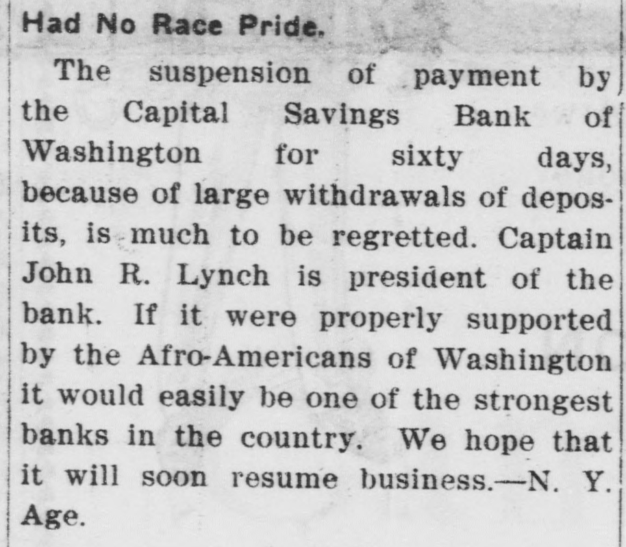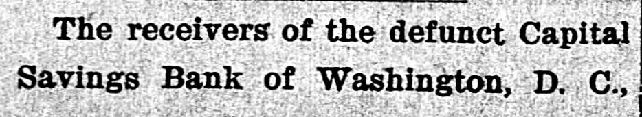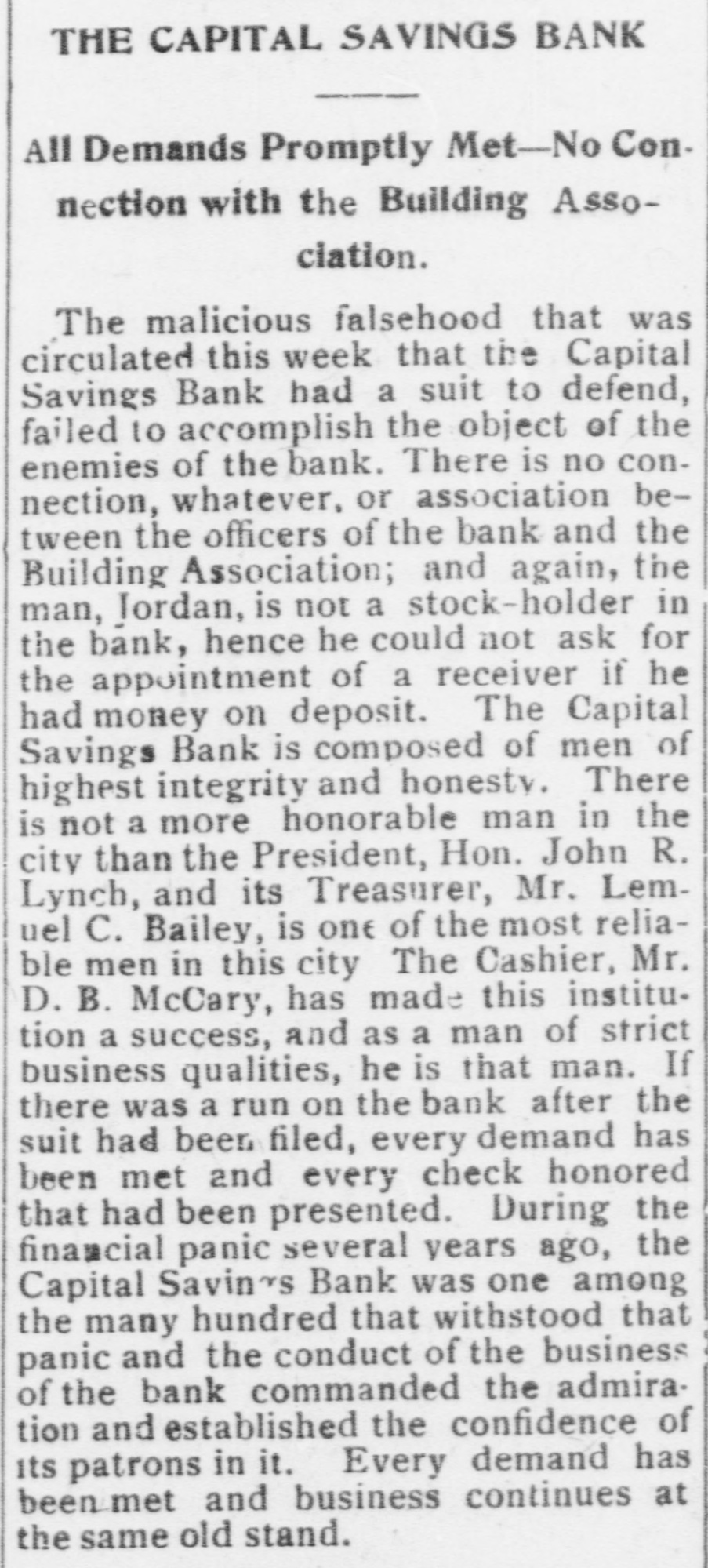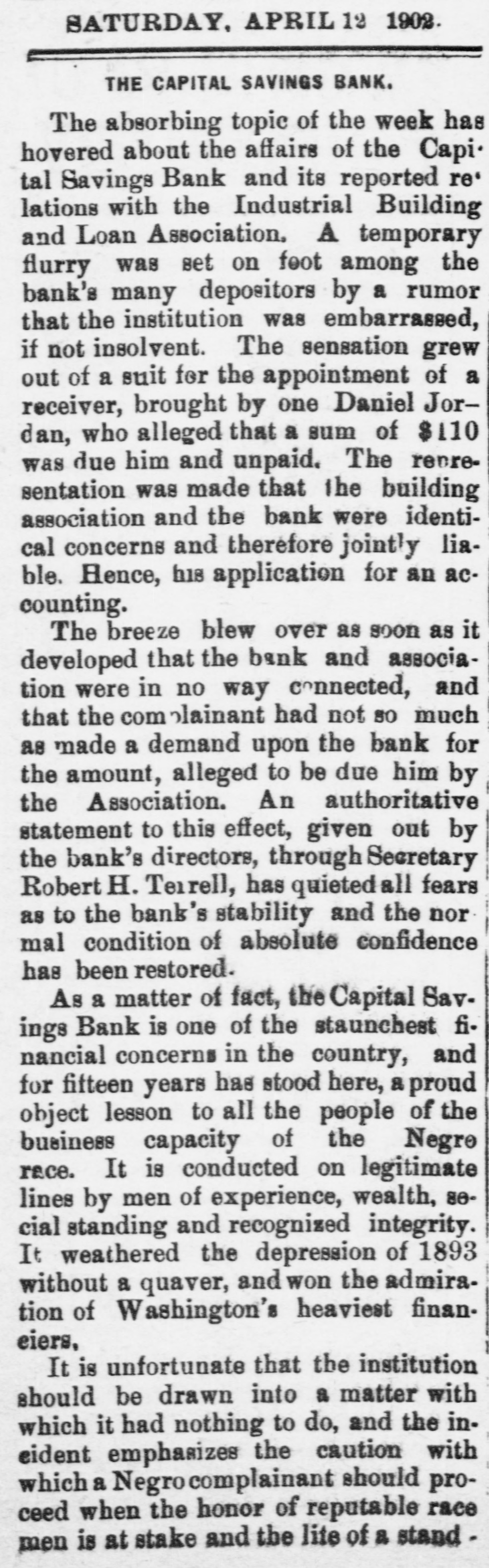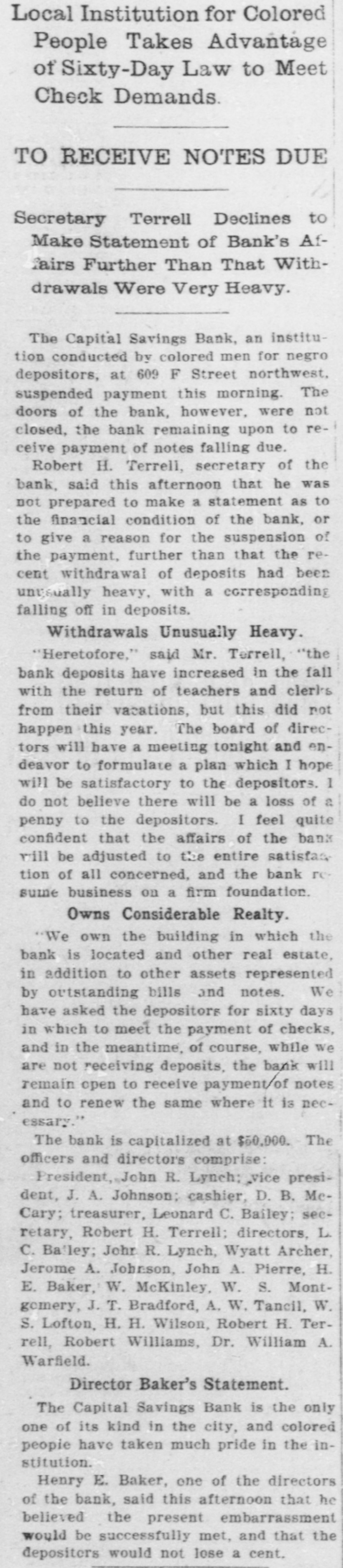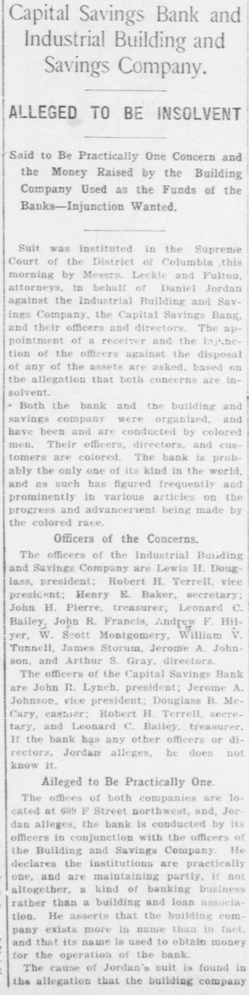 Capital Savings Bank and Industrial Building and Savings Company. ALLEGED TO BE INSOLVENT Said to Be Practically One Concern and the Money Raised by the Building Company Used as the Funds of the Banks-Injunction Wanted. Suit was instituted in the Supremie Court of the District of Columbia this morning by Messrs. Leckie and Fulton, attorneys, in behalf of Daniel Jordan against the Industrial Building and Savings Company, the Capital Savings Bang, and their officers and directors. The appointment of a receiver and the injunetion of the officers against the disposal of any of the assets are asked, based on the allegation that both concerns are insolvent. . Both the bank and the building and savings company were organized, and have been and are conducted by colored men. Their officers, directors, and customers are colored. The bank is probably the only one of its kind in the world, and as such has figured frequently and prominently in various articles on the progress and advancement being made by the colored race. Officers of the Concerns. The officers of the Industrial Building and Savings Company are Lewis H. Douglass, president: Robert H. Terrell, vice president; Henry E. Baker, secretary; John H. Pierre, treasurer; Leonard C. Bailey, John R. Francis, Andrew F. Hilyer, W. Scott Montgomery, William V. Tunnell, James Storum, Jerome A. Johnson, and Arthur S. Gray, directors. The officers of the Capital Savings Bank are John R. Lynch, president; Jerome A. Johnson, vice president; Douglass B. MeCary, cashier; Robert H. Terrell, secretary, and Leonard C. Bailey treasurer. If the bank has any other officers or directors, Jordan alleges, he does not know it. Aileged to Be Practically One. The offices of both companies are 10cated at 609 F Street northwest, and, Jordan alleges, the bank is conducted by its officers in conjunction with the officers of the Building and Savings Company He declares the institutions are practically one, and are maintaining partly, if not altogether, a kind of banking business rather than a building and loan association. He asserts that the building company exists more in name than in fact, and that its name is used to obtain money for the operation of the bank. The cause of Jordan's suit is found in the allegation that the building company