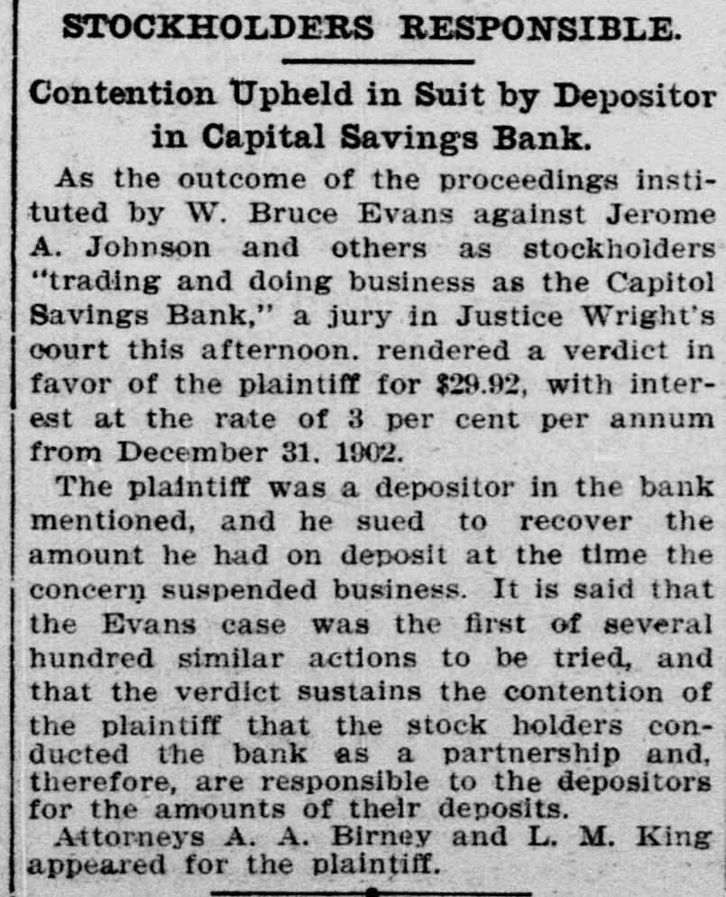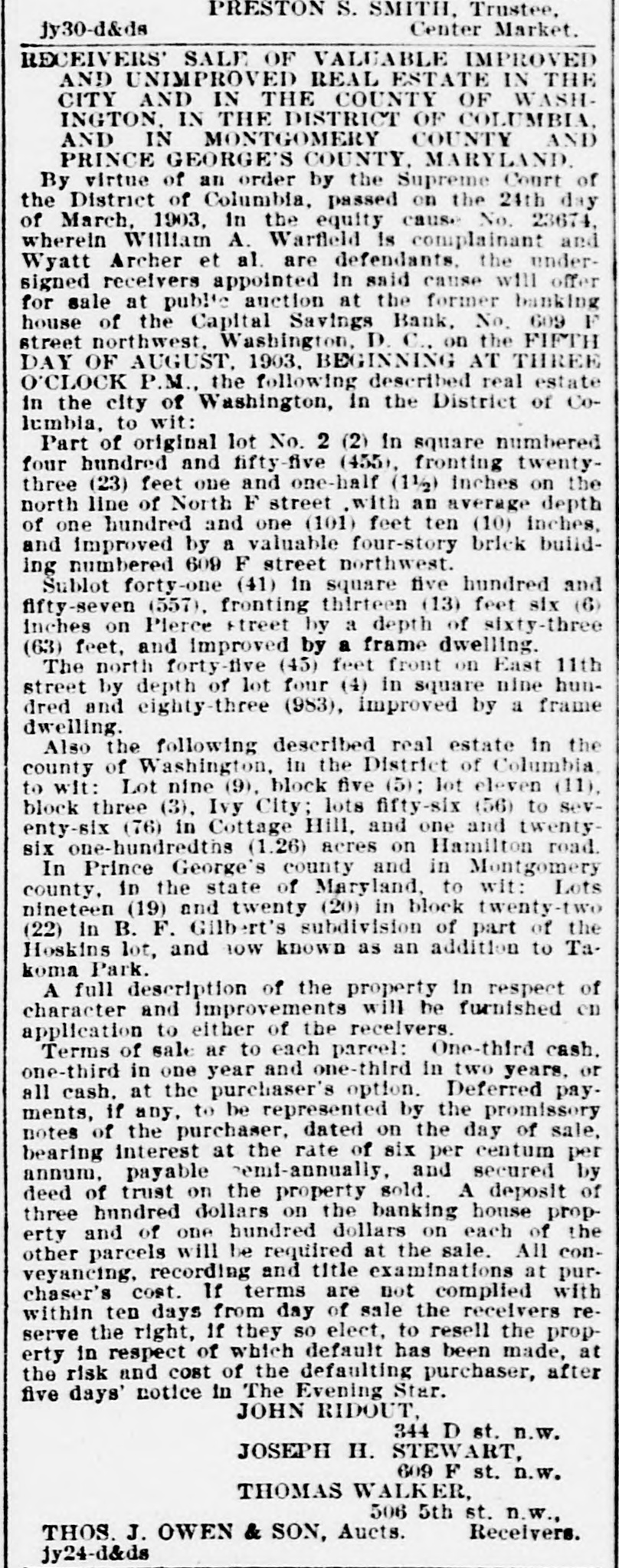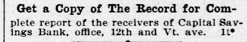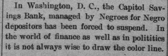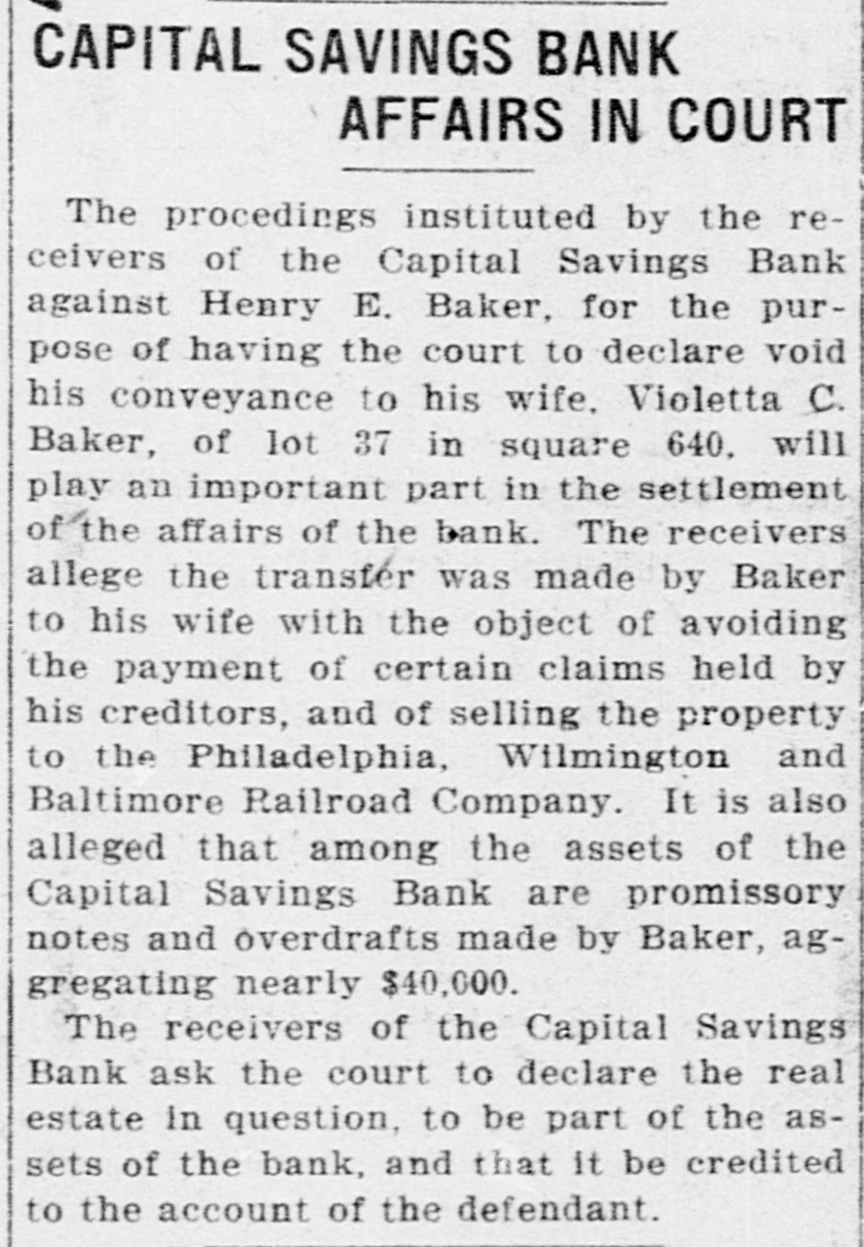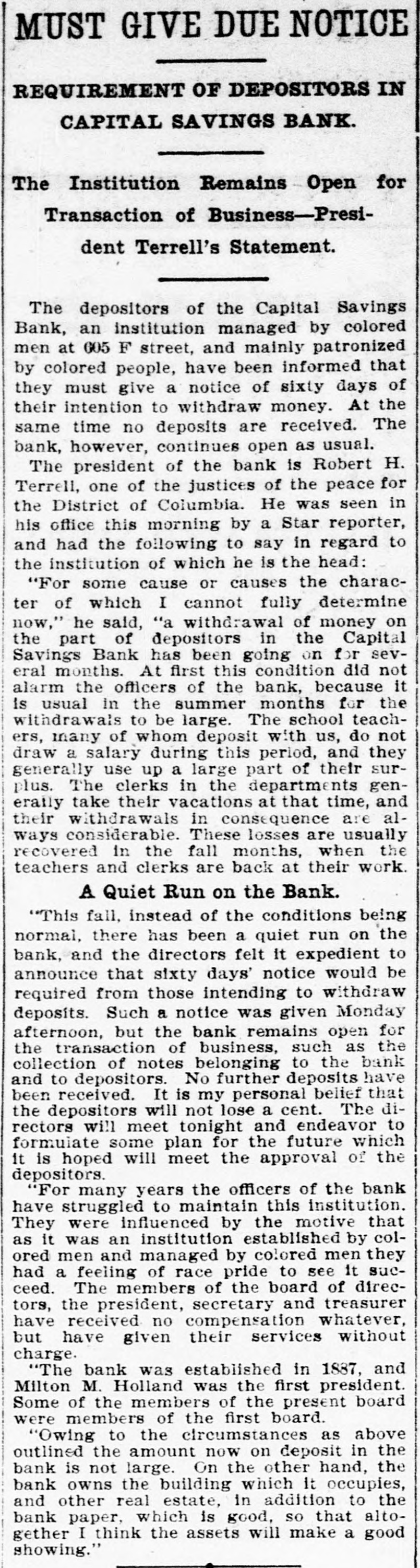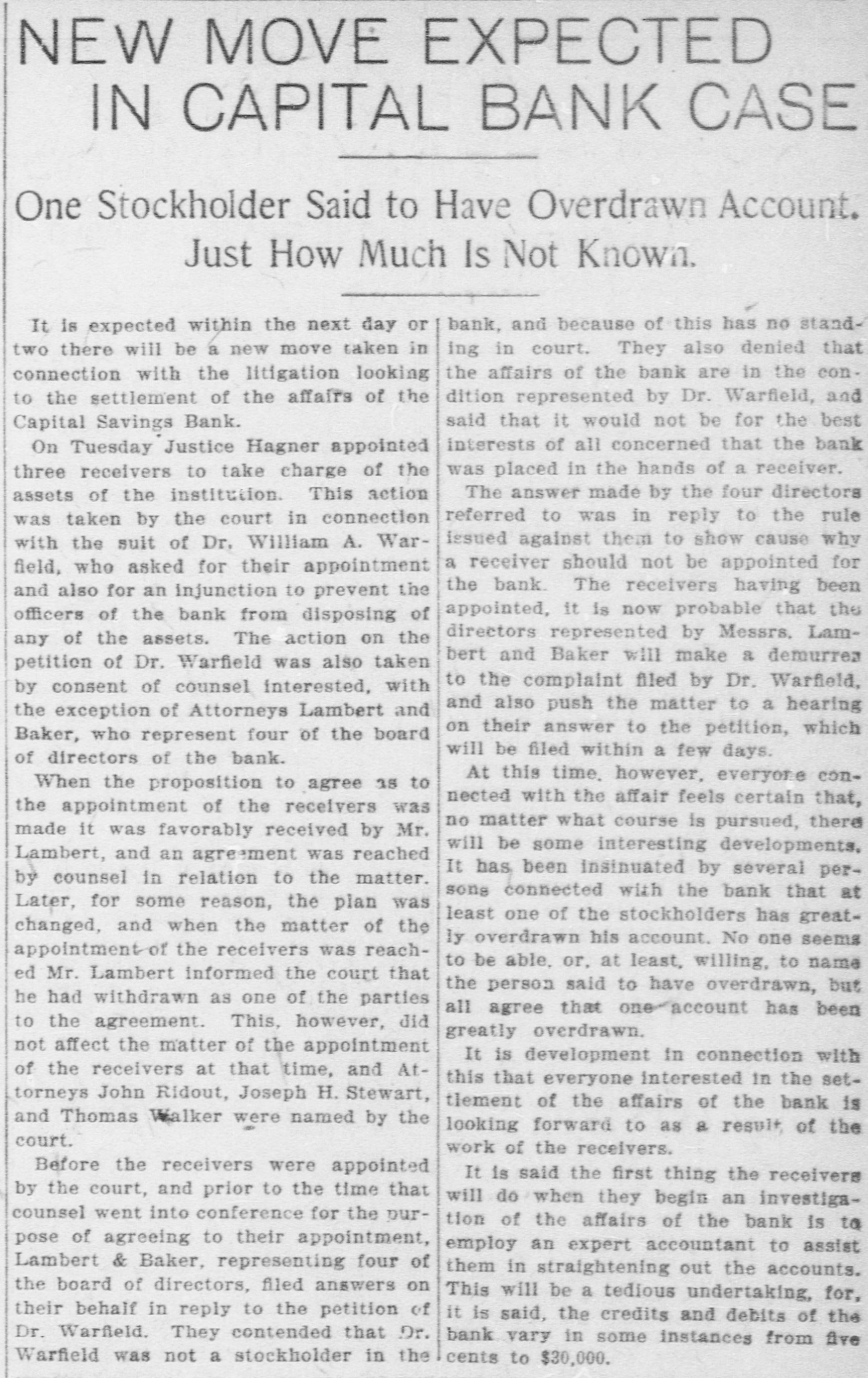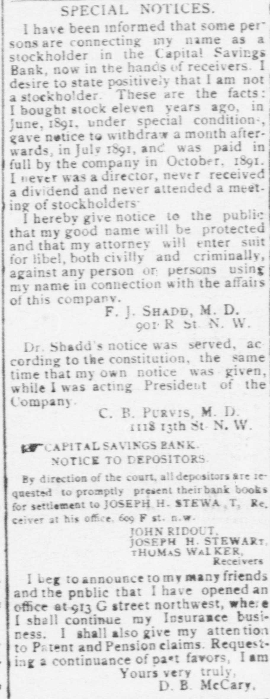 Capital Savings Bank and Industrial Building and Savings Company. ALLEGED TO BE INSOLVENT Said to Be Practically One Concern and the Money Raised by the Building Company Used as the Funds of the Banks-Injunction Wanted. Suit was instituted in the Supremie Court of the District of Columbia this morning by Messrs. Leckie and Fulton, attorneys, in behalf of Daniel Jordan against the Industrial Building and Savings Company, the Capital Savings Bang, and their officers and directors. The appointment of a receiver and the injunetion of the officers against the disposal of any of the assets are asked, based on the allegation that both concerns are insolvent. . Both the bank and the building and savings company were organized, and have been and are conducted by colored men. Their officers, directors, and customers are colored. The bank is probably the only one of its kind in the world, and as such has figured frequently and prominently in various articles on the progress and advancement being made by the colored race. Officers of the Concerns. The officers of the Industrial Building and Savings Company are Lewis H. Douglass, president: Robert H. Terrell, vice president; Henry E. Baker, secretary; John H. Pierre, treasurer; Leonard C. Bailey, John R. Francis, Andrew F. Hilyer, W. Scott Montgomery, William V. Tunnell, James Storum, Jerome A. Johnson, and Arthur S. Gray, directors. The officers of the Capital Savings Bank are John R. Lynch, president; Jerome A. Johnson, vice president; Douglass B. MeCary, cashier; Robert H. Terrell, secretary, and Leonard C. Bailey treasurer. If the bank has any other officers or directors, Jordan alleges, he does not know it. Aileged to Be Practically One. The offices of both companies are 10cated at 609 F Street northwest, and, Jordan alleges, the bank is conducted by its officers in conjunction with the officers of the Building and Savings Company He declares the institutions are practically one, and are maintaining partly, if not altogether, a kind of banking business rather than a building and loan association. He asserts that the building company exists more in name than in fact, and that its name is used to obtain money for the operation of the bank. The cause of Jordan's suit is found in the allegation that the building company