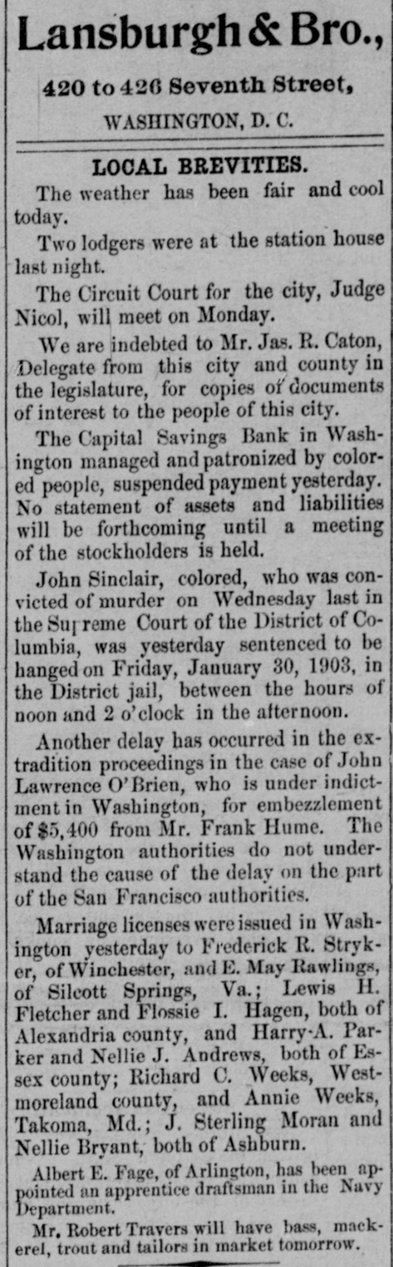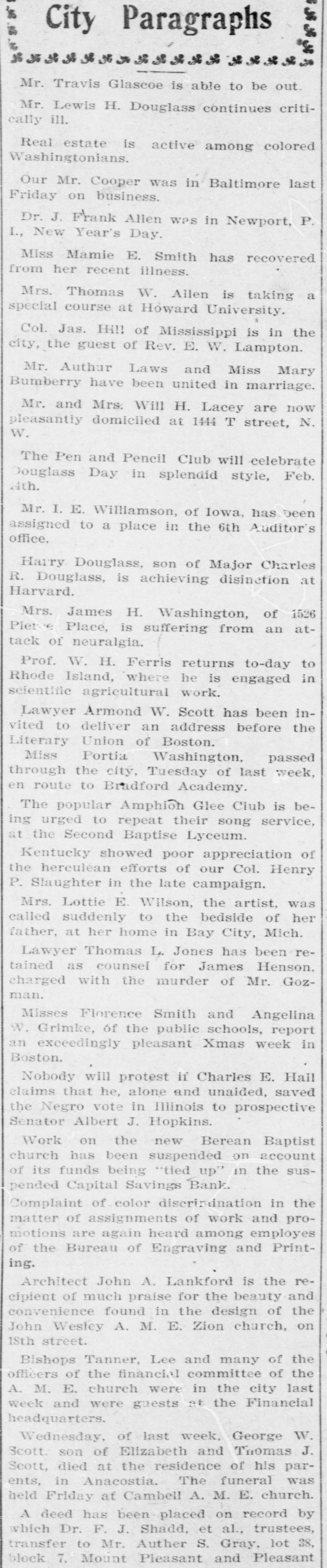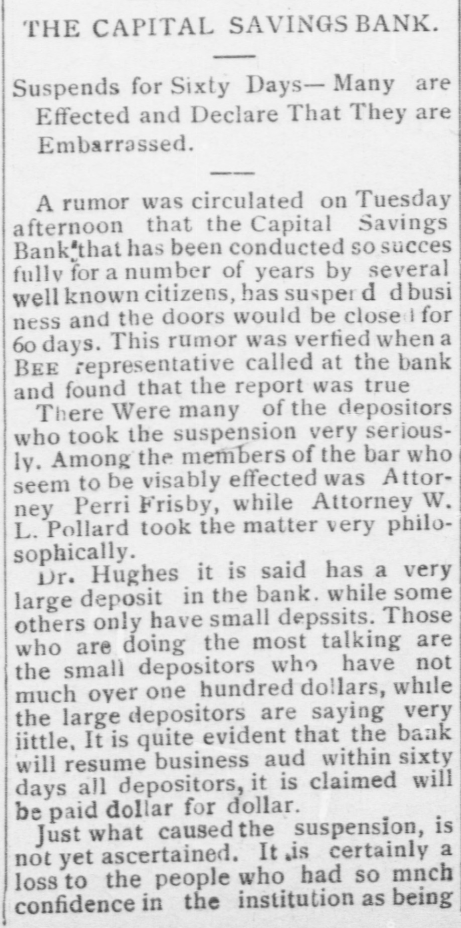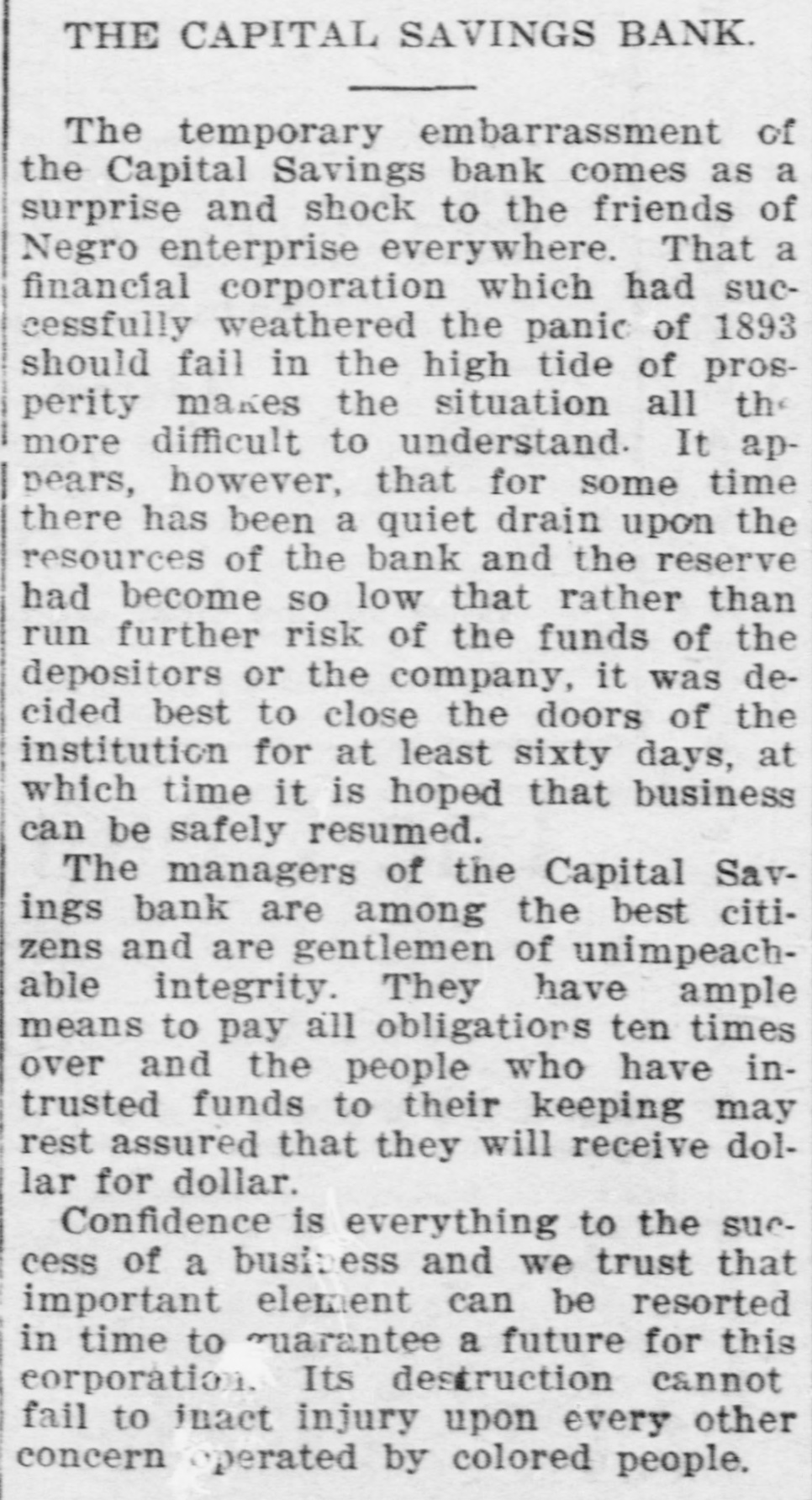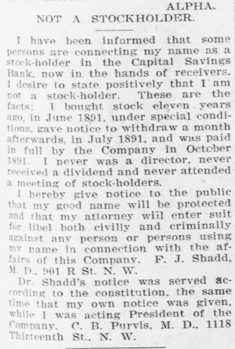 Capital Savings Bank and Industrial Building and Savings Company. ALLEGED TO BE INSOLVENT Said to Be Practically One Concern and the Money Raised by the Building Company Used as the Funds of the Banks-Injunction Wanted. Suit was instituted in the Supremie Court of the District of Columbia this morning by Messrs. Leckie and Fulton, attorneys, in behalf of Daniel Jordan against the Industrial Building and Savings Company, the Capital Savings Bang, and their officers and directors. The appointment of a receiver and the injunetion of the officers against the disposal of any of the assets are asked, based on the allegation that both concerns are insolvent. . Both the bank and the building and savings company were organized, and have been and are conducted by colored men. Their officers, directors, and customers are colored. The bank is probably the only one of its kind in the world, and as such has figured frequently and prominently in various articles on the progress and advancement being made by the colored race. Officers of the Concerns. The officers of the Industrial Building and Savings Company are Lewis H. Douglass, president: Robert H. Terrell, vice president; Henry E. Baker, secretary; John H. Pierre, treasurer; Leonard C. Bailey, John R. Francis, Andrew F. Hilyer, W. Scott Montgomery, William V. Tunnell, James Storum, Jerome A. Johnson, and Arthur S. Gray, directors. The officers of the Capital Savings Bank are John R. Lynch, president; Jerome A. Johnson, vice president; Douglass B. MeCary, cashier; Robert H. Terrell, secretary, and Leonard C. Bailey treasurer. If the bank has any other officers or directors, Jordan alleges, he does not know it. Aileged to Be Practically One. The offices of both companies are 10cated at 609 F Street northwest, and, Jordan alleges, the bank is conducted by its officers in conjunction with the officers of the Building and Savings Company He declares the institutions are practically one, and are maintaining partly, if not altogether, a kind of banking business rather than a building and loan association. He asserts that the building company exists more in name than in fact, and that its name is used to obtain money for the operation of the bank. The cause of Jordan's suit is found in the allegation that the building company