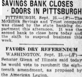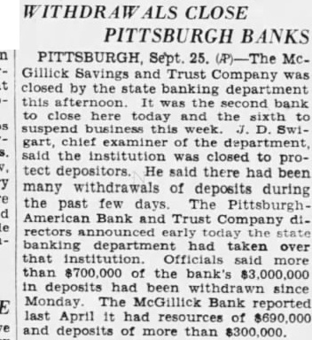 SIX PITTSBURGH BANKS IN CRASH 10 Banks Closed With $60,000,000 Lost PITTSBURGH, Pa., Sept. 28.-With six banks cosed over the week-end. the total of insolvent banks here within the last two weeks total ten with lost deposits estimated at $60,000.000. The Pittsburgh-American, Bank and Trust Co. and the McGillick Savings and Trust Co. were closed Friday by the State Banking Department. A run on the former bank withdrew $700,000 of the $3,000,000 deposits. it was reported. The lost McGillick bank deposits total $300,000. Declarations to the effect that the depositors would receive a full return on their lost money is in line with the usual promises to forestall immediate mass action of the depositors. Four other banks, the Bloomfield Trust Co., the Garfield Bank, the Hamilton State Bank and the Pennsylvania Bank and Trust Co. were closed Saturday. The deposits of the crashed banks in the order named are: $1,463,000, $422,000; $253,000, and $2,822,000. No promise of return on the deposits were made by officials of the above four banks.