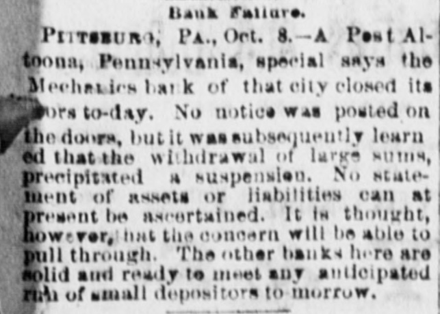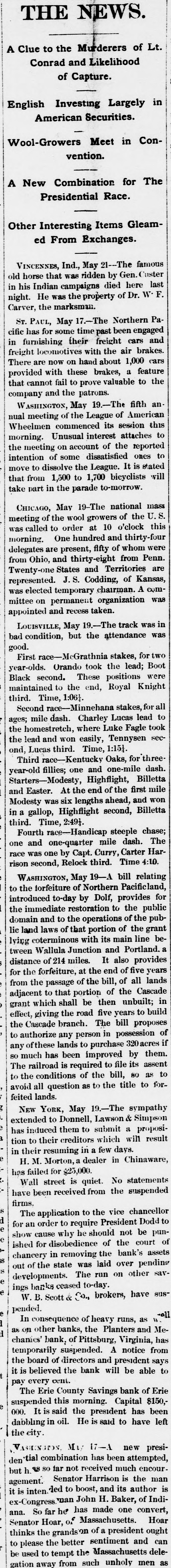 THE NEWS. Lt. A Clue to the Murderers of Conrad and Likelihood of Capture. in Largely Investing English American Securities. in ConMeet Wool-Growers vention. The A New Combination for Presidential Race. Other Interesting Items Gleamed From Exchanges. The famous VINCENNES, Ind., ridden May 21 by Gen. Custer last old horse that campaigns was died here W.F. Carver, the night. in his Indian He was marksman. the property of Dr. PaNorthern for has freight ST. PAUL, some May 17. time The been cars engaged and cific in furnishing locomotives their with about the air 1,000 brakes. ears freight on hand a feature There provided cannot are with now fail these to prove brakes, valuable to the an The fifth that and the patrons. 19.of session company WASHINGTON, May the League of American this Unusual Wheelmen nual meeting commenced interest its attaches reported morning. on account dissatisfied of the ones the intention meeting of some the League It is stated will move to dissolve to 1,700 bicyclists part take that from in 1,500 the parade to-morrow. mass national CHICAGO, May 19 growers The of the U.S. this of the wool 10 o'clock meeting order at thirty- -four was called to hundred and whom were morning. are One present, fifty of from Penn. delegates from Ohio, and thirty-enretritories and Kansas, are was Twenty-one States J.S. Codding, of A compermanent represented elected temporary chairman. organization was mittee on and recess taken. in was bad condition, appointed LOUISVILLE, May but the The attendance track was two McGrathnia stakes, lead; for Boot good. First race- took the were Orando positions Knight raceSecond year-olds. maintained Black second. to the These end, Royal for all Charley third. Time, 1:06} Minnehana Lucas stakes, lead to took Fagle the homestretch, mile dash. where easily, Luke Tennysen sec three the lead and third. won Time, 1:15} for fillies; ond, Third Lucas race- Kentucky one and Oaks, one-mile Billetta dash. Highflight, mile At the ahead, year-old Starters- Modesty, end of the first and won and Easter. was six lengths second, Billetta Modesty gallop, Highflight 2:49 chase; steeple third. in Time, Handicap The dash. mile HarFourth and one-quarter Curry, Carter 4:10. rison second, bill May race one was one by Relock Capt. third. Time relating forfeiture Pacificland WASHINGTON, of Northern provides for to the to-day by Dolf, to the public pubintroduced restoration of the the immediate and to the operations portion of the grant bedomain laws of that its main line Wallula It lic land coterminous with and Portland. lying Junction also provides years tween of 214 miles. the end of five lands passage distance forfeiture, at bill, of all for the of the of the Cascade in from the portion unbuilt; adjacent which to that shall be five then years proposes to build grant effect, giving branch. the road The bill possession the Cascade any person in 320 acres any ofthese is to authorize lands to improved purchase by assent them all avoid so much railroad has been required the bill, file its 80 to as forto The the conditions question of as to the title gympathy to extended to them submit feited NEW lands. YORK, Donnell, May Lawson The & a Simpson proposiwill to which result in has has induced their creditors few days. Chinaware, for tion in their resuming Morton, dealer in H.M. $25,000. statements Wall received from has failed been street is quiet. vice the No suspended chancellor have firms. The application to to should the President not be Dodd pun- of bank's for an cause order why he of the court assets ished show for in gobedience removing was jaid the over other pending say chancery out of the state The run on W. -oll as ings development ban B. ks Scott & can to-day. brokers, have BUST pended. consequence of the heavy Planters runs, and Me has In banks, Virginia from as on other of Pittsburg, notice is believed every cent. chanies' temporarily the board bank, of suspended. directors the bank and will A president be able says of Erie bank Savings $150, pay The Erie this County morning. Capital has been left president have dabbling suspended 000. It is in said oil. the He s aaid to the city M new presibeen attempted, Senator VISION combination has much the encour- man its den tial so tar not Harrison is author IndiCongress has ana. but h. agement. it is inten. ded nan to boost, John made and H. Baker, one convert, of Hoar of Hoar, Senator of a the thinks grands ex-Congre So far he Massachusette: president ought can and sentiment better delebe Massachusett away from to please used to the tempt the such unholy men as