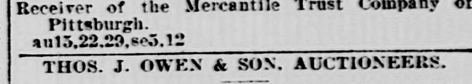 Receiver of the Mercantile Trust Company or Pittsburgh. au15,22,29,se5.12 THOS. J. OWEN & SON. AUCTIONEERS.