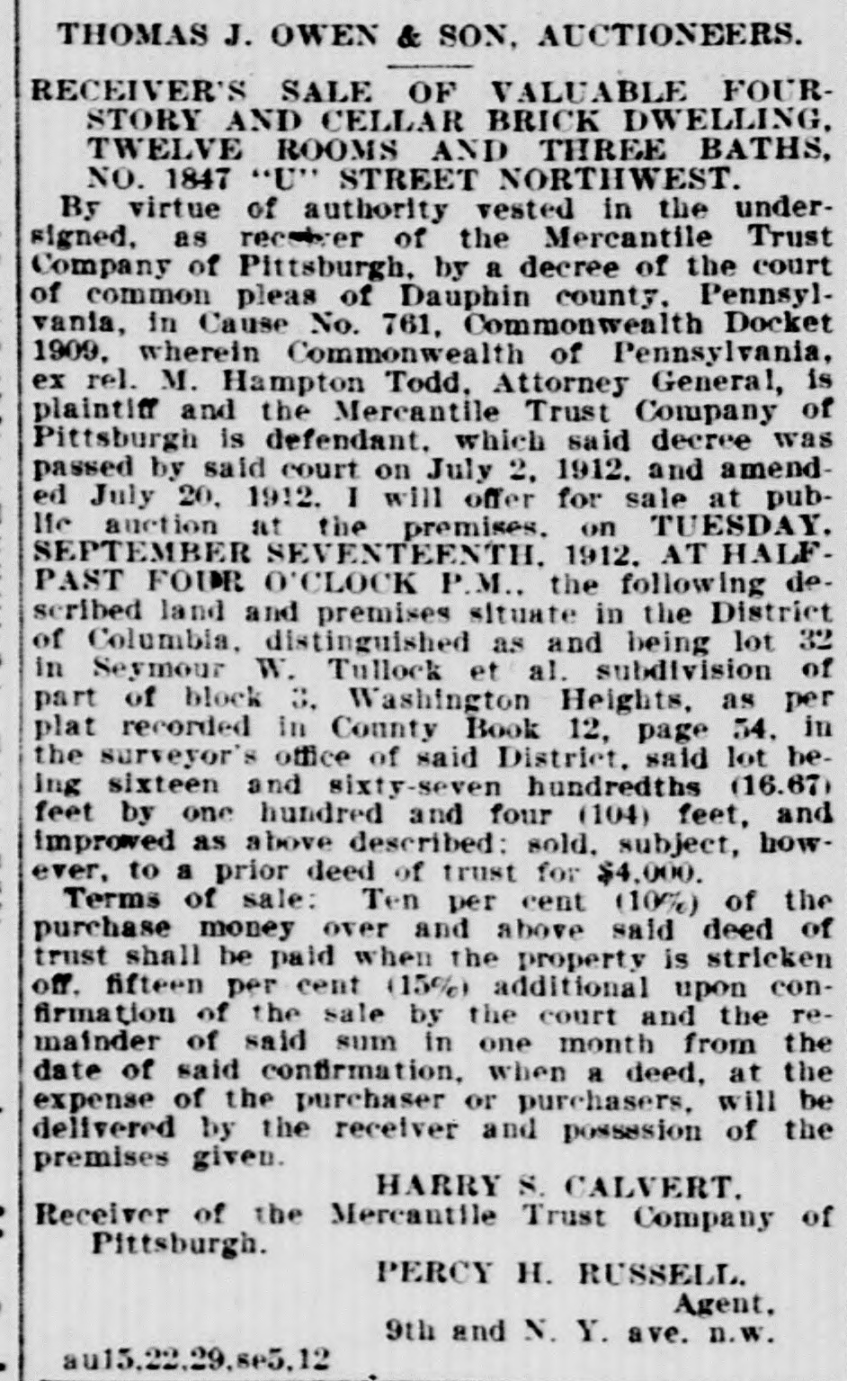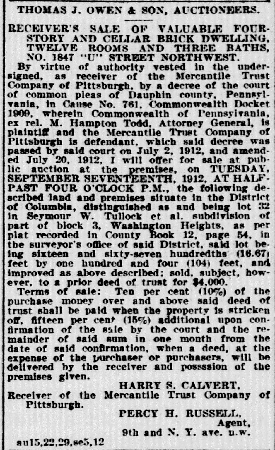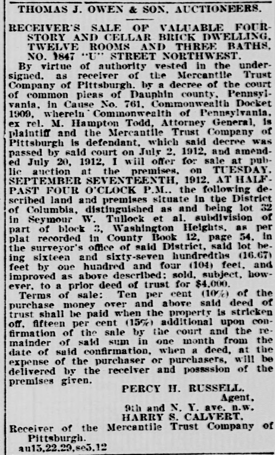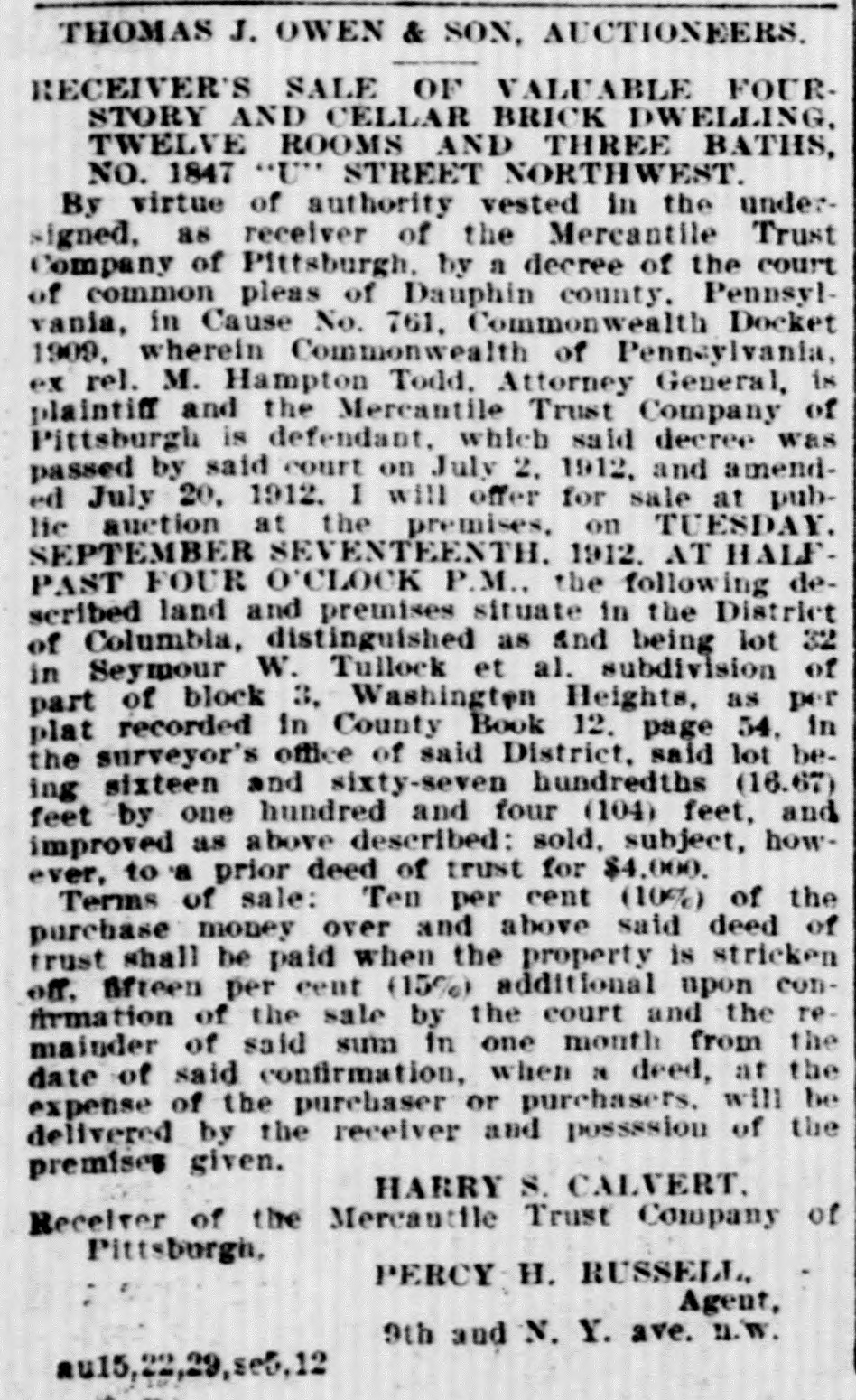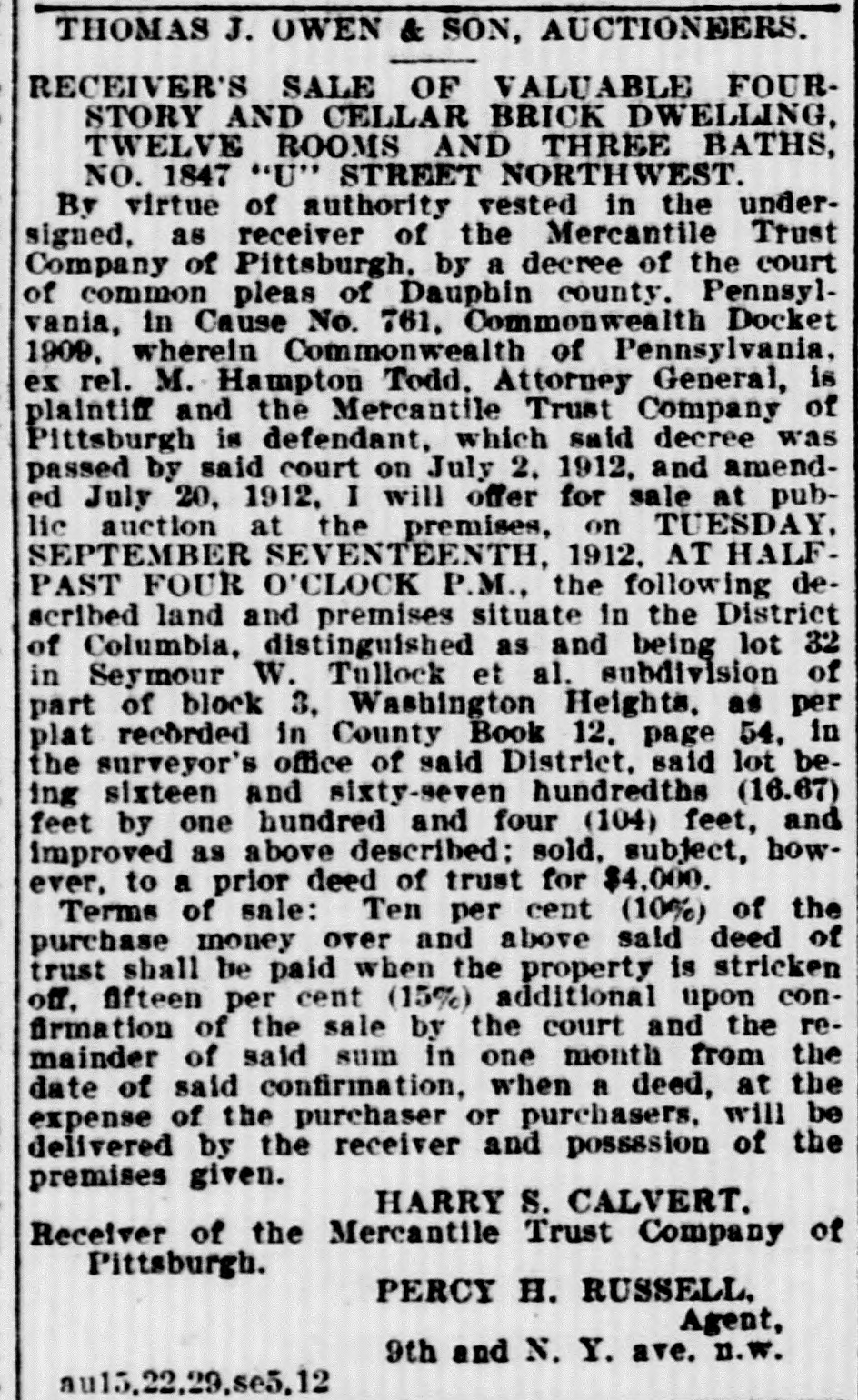 THOMAS J. OWEN & SON, AUCTIONEERS. RECEIVER'S SALE OF VALUABLE FOURSTORY AND CELLAR BRICK DWELLING, TWELVE ROOMS AND THREE BATHS, NO. 1847 "U" STREET NORTHWEST. By virtue of authority vested in the undersigned, as receiver of the Mercantile Trust Company of Pittsburgh, by a decree of the court of common pleas of Dauphin county, Pennsylvania, in Cause No. 761, Commonwealth Docket 1909, wherein Commonwealth of Pennsylvania, ex rel. M. Hampton Todd, Attorney General, is plaintiff and the Mercantile Trust Company of Pittsburgh is defendant. which said decree was passed by said court on July 2, 1912. and amended July 20, 1912. I will offer for sale at public auction at the premises. on TUESDAY. SEPTEMBER SEVENTEENTH. 1912. AT HALFPAST FOUR O'CLOCK P.M., the following described land and premises situate in the District of Columbia, distinguished as and being lot 32 in Seymour W. Tullock et al. subdivision of part of block 3. Washington Heights, as per plat recorded in County Book 12, page 54, in the surveyor's office of said District, said lot beIng sixteen and sixty-seven hundredths (16.67) feet by one hundred and four (104) feet, and improwed as above described: sold. subject, however, to a prior deed of trust for $4,000. Terms of sale: Ten per cent (10%) of the purchase money over and above said deed of trust shall be paid when the property is stricken off. fifteen per cent (15%) additional upon confirmation of the sale by the court and the remainder of said sum in one month from the date of said confirmation, when a deed, at the expense of the purchaser or purchasers, will be delivered by the receiver and possssion of the premises given. HARRY S. CALVERT. Receiver of the Mercantile Trust Company of Pittsburgh. PERCY H. RUSSELL. Agent, 9th and N. Y. ave. n.w. au15.22,29.se5,12