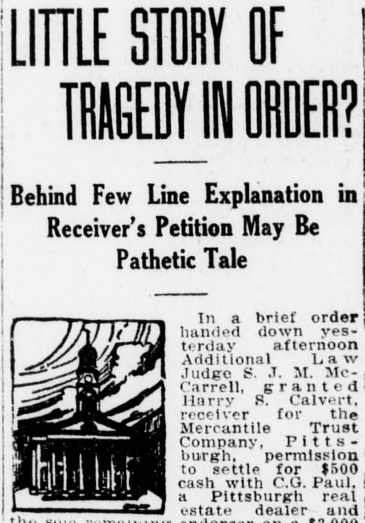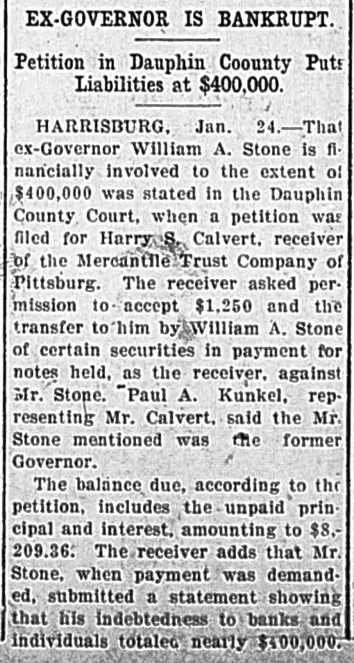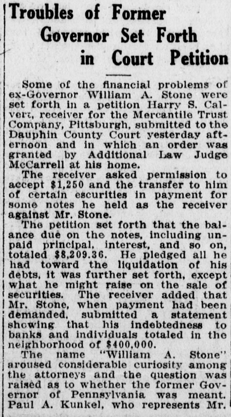 Troubles of Former Governor Set Forth in Court Petition Some of the financial problems of ex-Governor William A. Stone were set forth in a petition Harry S. Calvert, receiver for the Mercantile Trust Company, Pittsburgh, submitted to the Dauphin County Court yesterday afternoon and in which an order was granted by Additional Law Judge McCarrell at his home. The receiver asked permission to accept $1,250 and the transfer to him of certain escurities in payment for some notes he held as the receiver against Mr. Stone. The petition set forth that the balance due on the notes, including unpaid principal, interest, and so on, totaled $8,209.36. He pledged all he had toward the liquidation of his debts, it was further set forth, except what he might raise on the sale of securities. The receiver added that Mr. Stone, when payment had been demanded, submitted a statement showing that his indebtedness to banks and individuals totaled in the neighborhood of $400,000. The name "William A. Stone" aroused considerable curiosity among the attorneys and the question was raised as to whether the former Governor of Pennsylvania was meant. Paul A. Kunkel, who represents Mr.
