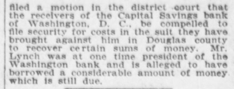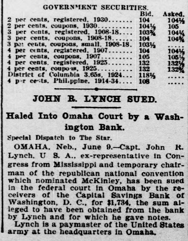 GOVERNMENT SECURITIES. Bid. Asked. 104 2 per cents, registered, 1930 1041/2 105 2 per cents, coupons, 1930 104½ 3 per cents, registered. 1908-18 1044 103% 104 3 per cents, coupons, 1908-18 104% 3 per cents, coupons, small. 1908-18. 103½ 104 4 per cents, registered. 1907 1041/2 105 4 per cents, coupons, 1907 105% 132 4 per cents. registered. 1923 1321/ 132 4 per cents, coupons, 1925 132% District of Columbia 3.65s, 1924 118½ 108 4 per cests, Philippine. 1914-34 JOHN R. LYNCH SUED. Haled Into Omaha Court by a Washington Bank. Special Dispatch to The Star. OMAHA, Neb., June 9.-Capt. John R. Lynch, U. S. A., ex-representative in Congress from Mississippi and temporary chairman of the republican national convention which nominated McKinley, has been sued in the federal court in Omaha by the receivers of the Capital Savings Bank of Washington, D. C., for $1,734, the sum alleged to have been obtained from the bank by Lynch and for which he gave notes. Lynch is a paymaster of the United States army at the headquarters in Omaha.