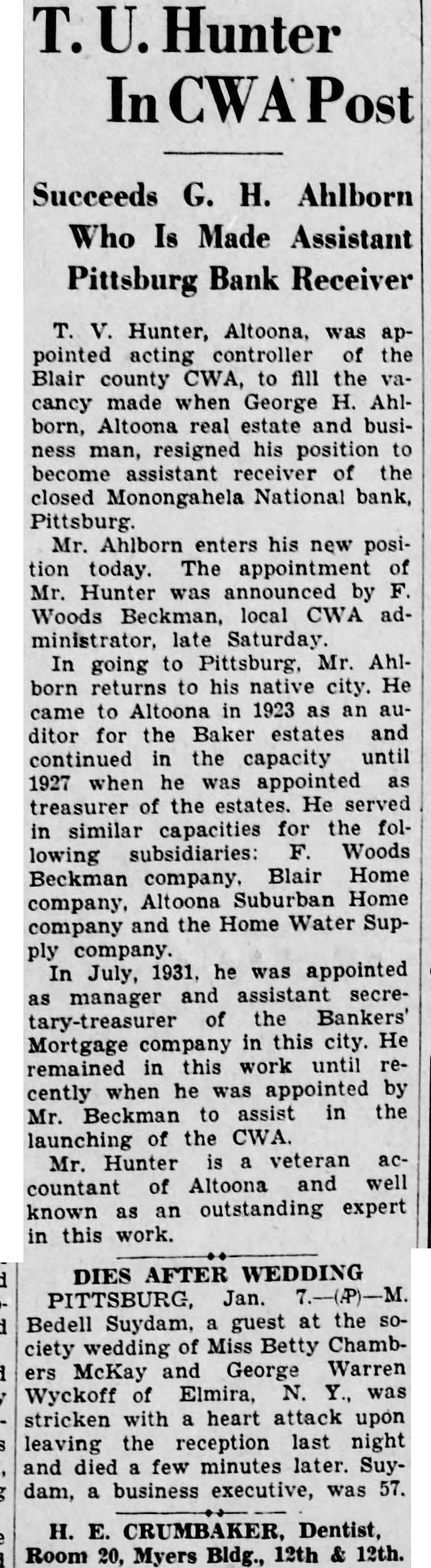 Hunter, Altoona, was appointed controller the Blair county CWA, fill the cancy made when George H. Ahlborn, Altoona real estate and business man, resigned his position become assistant receiver the closed Monongahela National bank, Mr. Ahlborn enters his new position today. The Mr. Hunter announced by Woods Beckman, local CWA administrator, Saturday In going to Pittsburg, Mr. Ahlborn returns to his city. He came Altoona 1923 an ditor for the Baker estates and continued in the capacity until when was appointed treasurer of the estates. He served in similar capacities for the following subsidiaries: Woods Beckman company. Blair Home Altoona Home company and the Home Water SupIn July, 1931, he was appointed manager and assistant secretary-treasurer the Bankers' Mortgage company this city. He remained in this work until recently when he was appointed by Beckman assist in the Mr. launching of the CWA. Mr. Hunter veteran accountant Altoona known as an outstanding expert in this work.