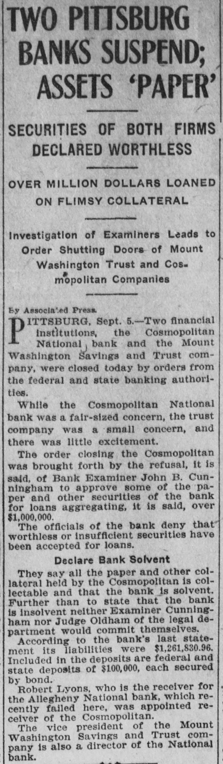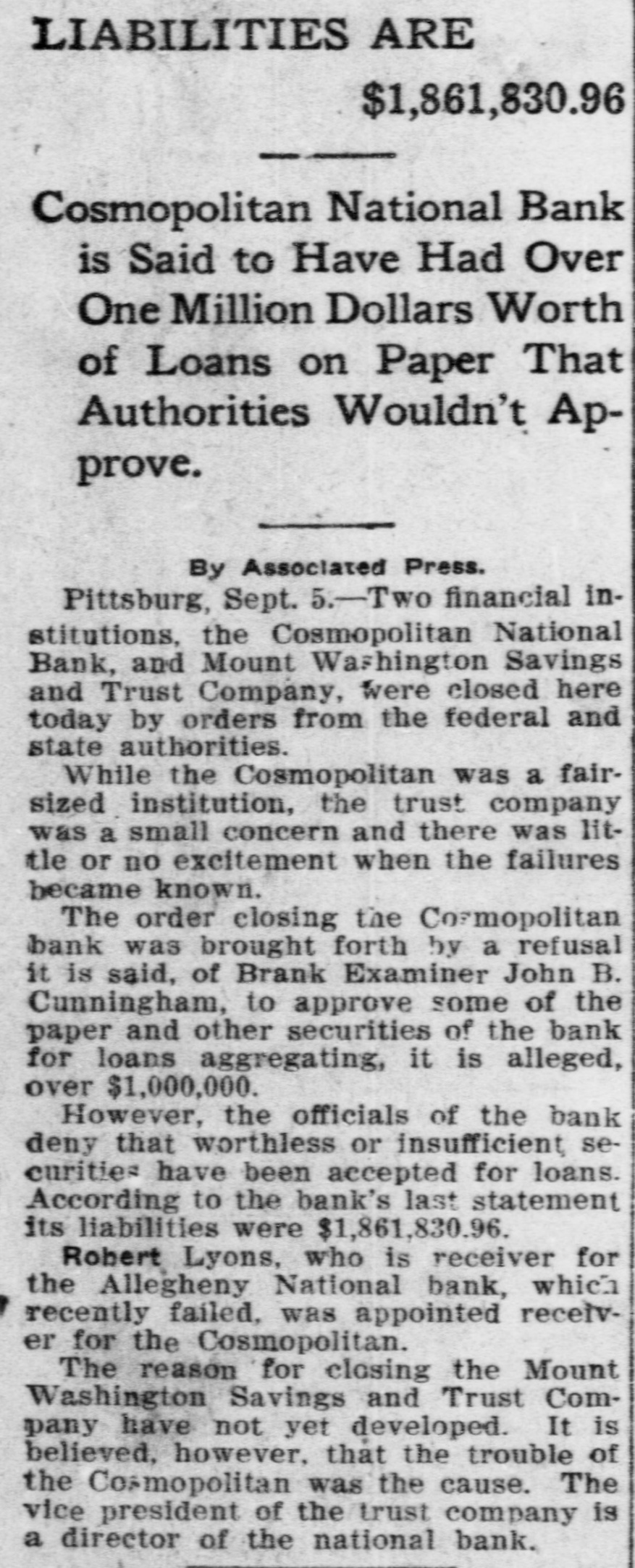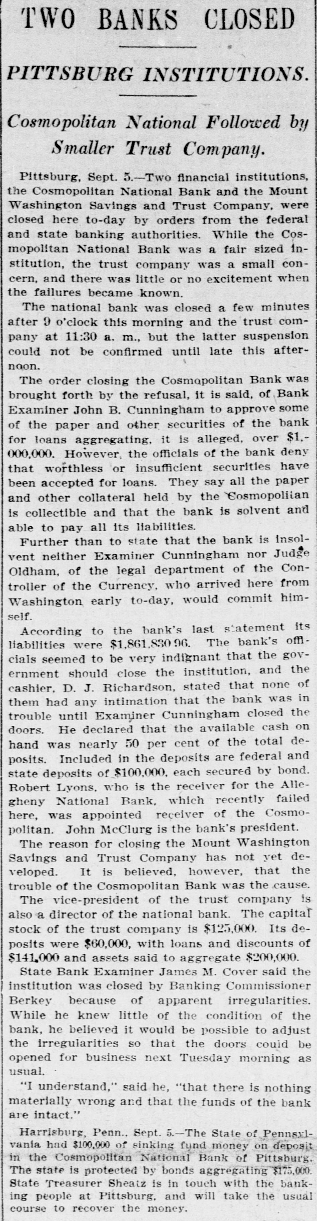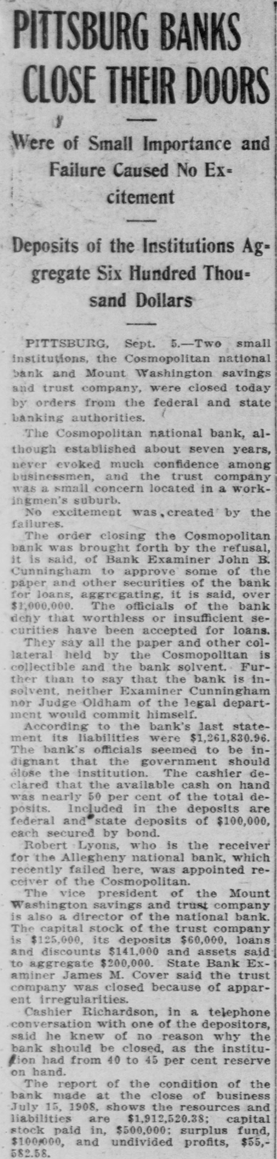 PITTSBURG BANKS CLOSE THEIR DOORS Were of Small Importance and Failure Caused No Ex= citement Deposits of the Institutions Ag= gregate Six Hundred Thou= sand Dollars PITTSBURG, Sept. 5.-Two small institutions, the Cosmopolitan national bank and Mount Washington savings and trust company, were closed today by orders from the federal and state banking authorities. The Cosmopolitan national bank, although established about seven years, never evoked much confidence among businessmen, and the trust company was a small concern located in a workingmen's suburb. No excitement was. created by the failures. The order closing the Cosmopolitan bank was brought forth by the refusal, it is said, of Bank Examiner John B. Cunningham to approve some of the paper and other securities of the bank for loans, aggregating, it is said, over $1,000,000. The officials of the bank deny that worthless or insufficient securities have been accepted for loans. They say all the paper and other collateral held by the Cosmopolitan is collectible and the bank solvent. Further than to say that the bank is insolvent, neither Examiner Cunningham nor Judge Oldham of the legal department would commit himself. According to the bank's last statement its liabilities were $1,261,830.96. The bank's officials seemed to be indignant that the government should élose the institution. The cashier declared that the available cash on hand was nearly 50 per cent of the total deposits. Included in the deposits are federal and state deposits of $100,000, each secured by bond. Robert Lyons, who is the receiver for the Allegheny national bank, which recently failed here, was appointed receiver of the Cosmopolitan. The vice president of the Mount Washington savings and trust company is also a director of the national bank. The capital stock of the trust company is $125,000. its deposits $60,000, loans and discounts $141,000 and assets said to aggregate $200,000. State Bank Examiner James M. Cover said the trust company was closed because of apparent irregularities. Cashier Richardson, in a telephone conversation with one of the depositors, said he knew of no reason why the bank should be closed, as the institulion had from 40 to 45 per cent reserve on hand. The report of the condition of the bank made at the close of business July 15, 1908, shows the resources and liabilities are $1,912,520.38; capital stock paid in, $500,000; surplus fund, $100,000, and undivided profits, $55,582.58.