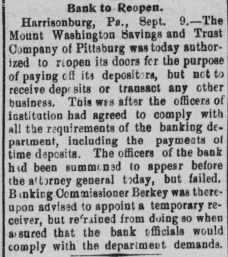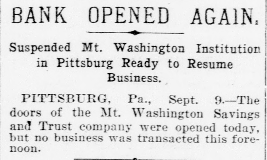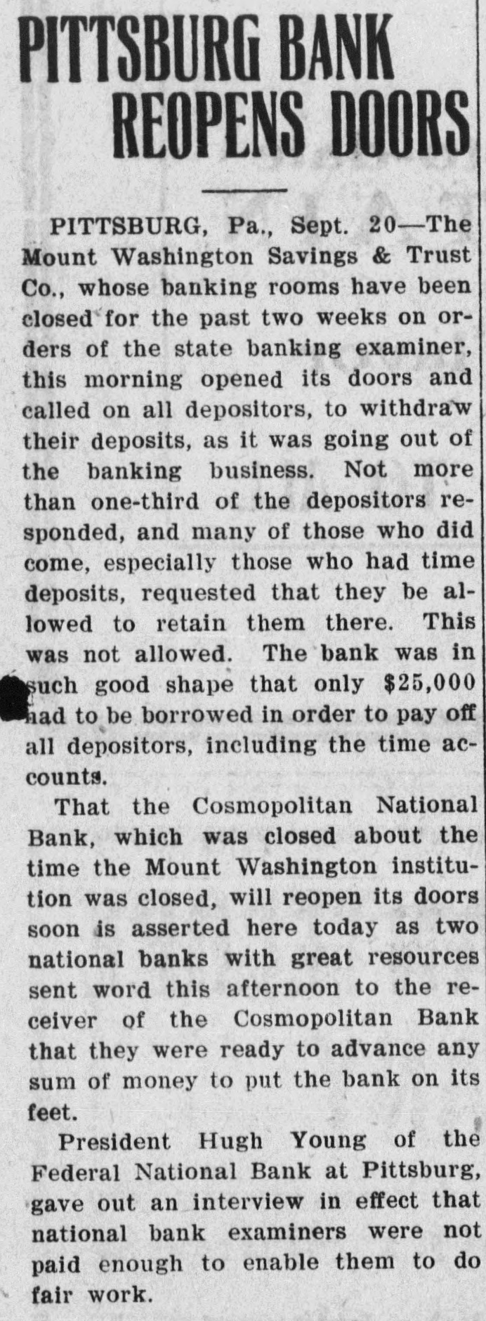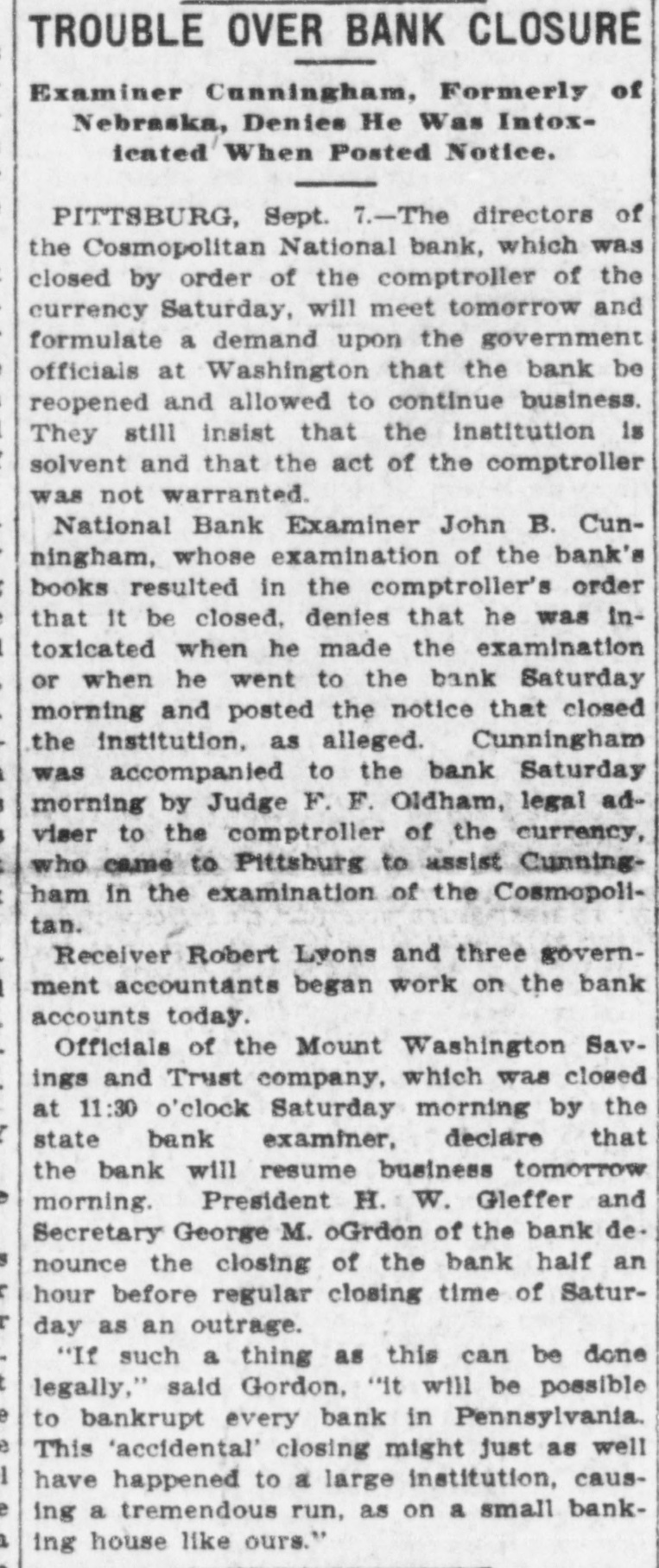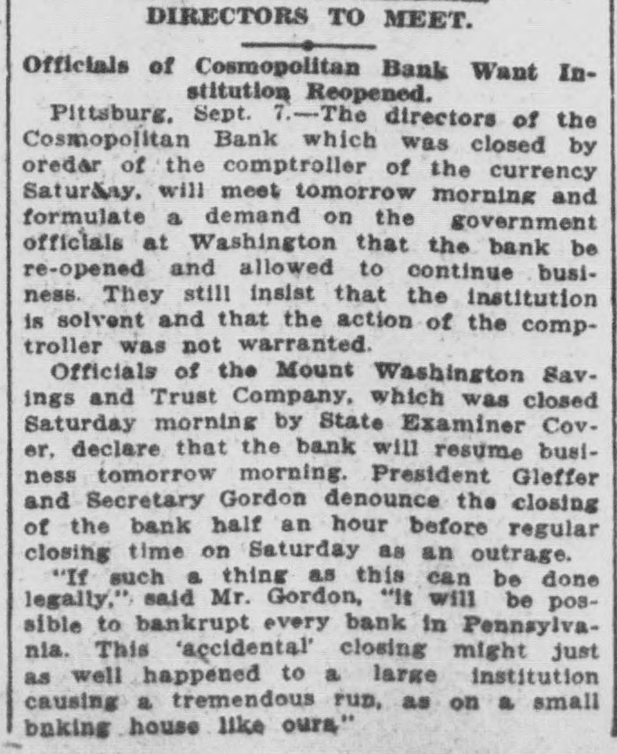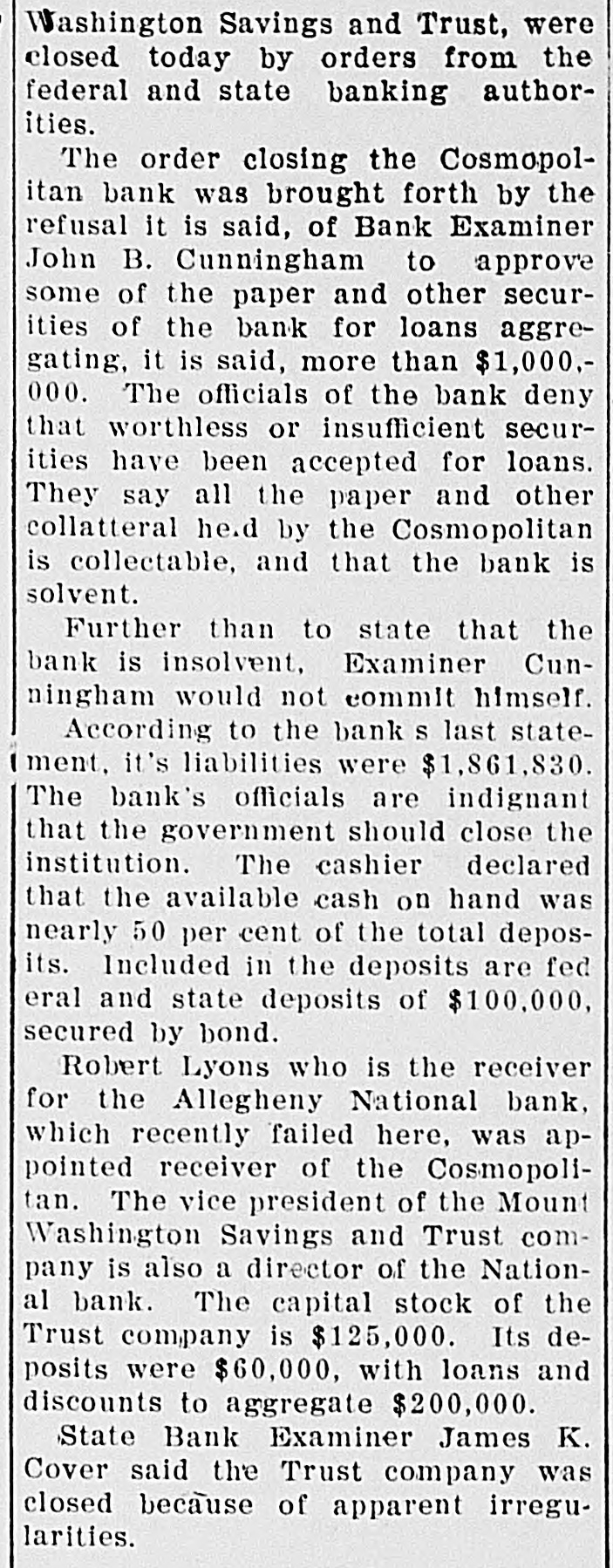 PITTSBURG BANKS CLOSE THEIR DOORS Were of Small Importance and Failure Caused No Ex= citement Deposits of the Institutions Ag= gregate Six Hundred Thou= sand Dollars PITTSBURG, Sept. 5.-Two small institutions, the Cosmopolitan national bank and Mount Washington savings and trust company, were closed today by orders from the federal and state banking authorities. The Cosmopolitan national bank, although established about seven years, never evoked much confidence among businessmen, and the trust company was a small concern located in a workingmen's suburb. No excitement was. created by the failures. The order closing the Cosmopolitan bank was brought forth by the refusal, it is said, of Bank Examiner John B. Cunningham to approve some of the paper and other securities of the bank for loans, aggregating, it is said, over $1,000,000. The officials of the bank deny that worthless or insufficient securities have been accepted for loans. They say all the paper and other collateral held by the Cosmopolitan is collectible and the bank solvent. Further than to say that the bank is insolvent, neither Examiner Cunningham nor Judge Oldham of the legal department would commit himself. According to the bank's last statement its liabilities were $1,261,830.96. The bank's officials seemed to be indignant that the government should élose the institution. The cashier declared that the available cash on hand was nearly 50 per cent of the total deposits. Included in the deposits are federal and state deposits of $100,000, each secured by bond. Robert Lyons, who is the receiver for the Allegheny national bank, which recently failed here, was appointed receiver of the Cosmopolitan. The vice president of the Mount Washington savings and trust company is also a director of the national bank. The capital stock of the trust company is $125,000. its deposits $60,000, loans and discounts $141,000 and assets said to aggregate $200,000. State Bank Examiner James M. Cover said the trust company was closed because of apparent irregularities. Cashier Richardson, in a telephone conversation with one of the depositors, said he knew of no reason why the bank should be closed, as the institulion had from 40 to 45 per cent reserve on hand. The report of the condition of the bank made at the close of business July 15, 1908, shows the resources and liabilities are $1,912,520.38; capital stock paid in, $500,000; surplus fund, $100,000, and undivided profits, $55,582.58.