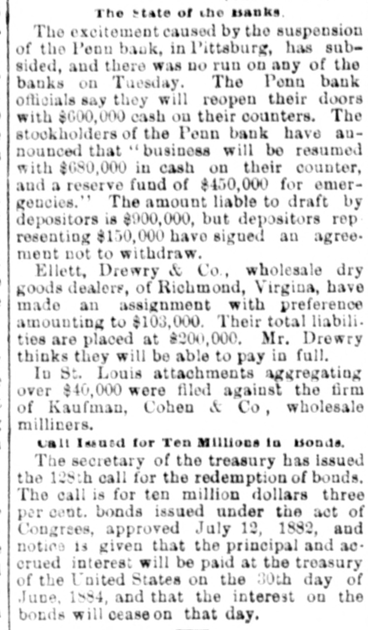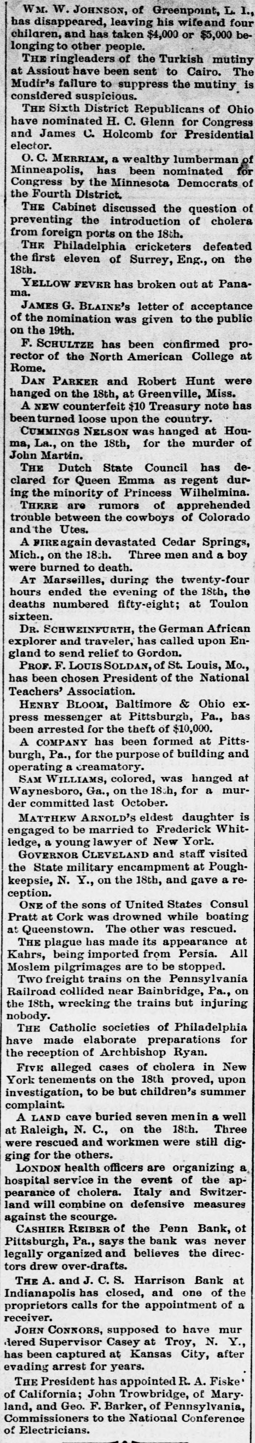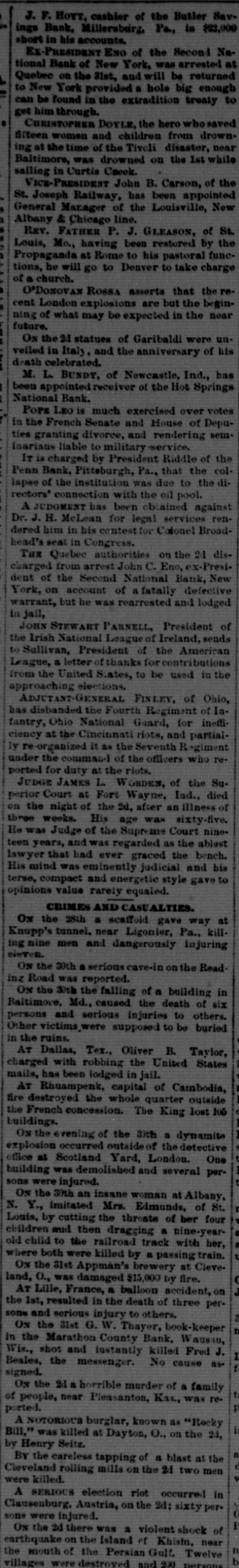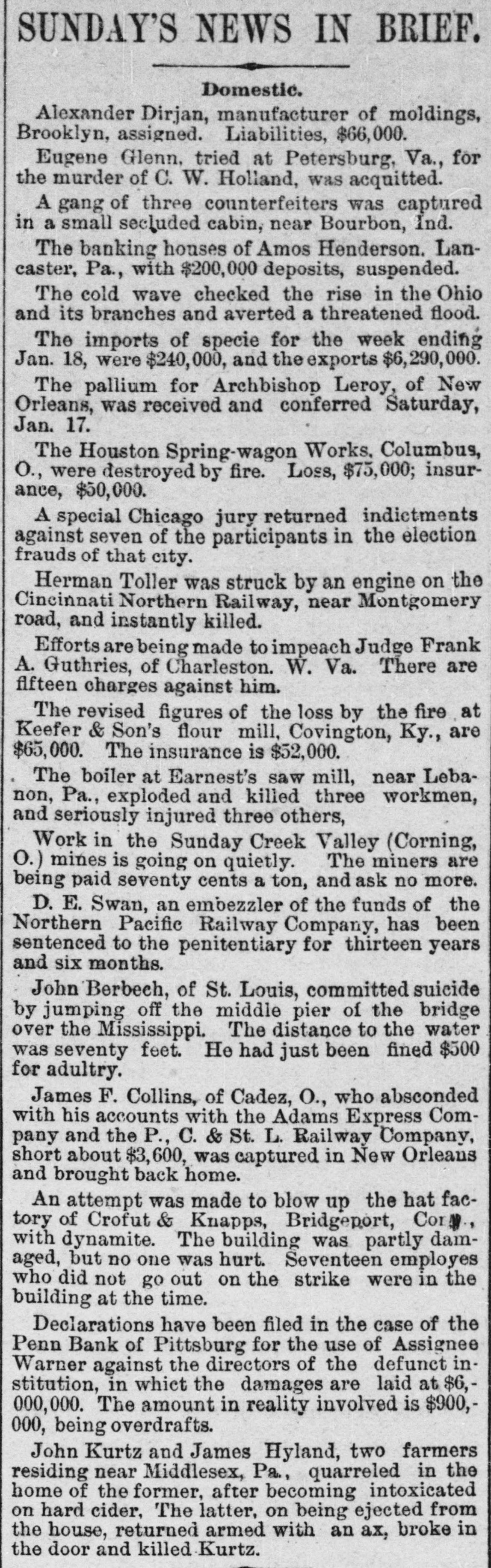 SUNDAY'S NEWS IN BRIEF. Domestic. Alexander Dirjan, manufacturer of moldings, Brooklyn, assigned. Liabilities, $66,000. Eugene Glenn, tried at Petersburg, Va., for the murder of C. W. Holland, was acquitted. A gang of three counterfeiters was captured in a small secluded cabin, near Bourbon, Ind. The banking houses of Amos Henderson. Lancaster, Pa., with $200,000 deposits, suspended. The cold wave checked the rise in the Ohio and its branches and averted a threatened flood. The imports of specie for the week ending Jan. 18, were $240,000, and the exports $6,290,000. The pallium for Archbishop Leroy, of New Orleans, was received and conferred Saturday, Jan. 17. The Houston Spring-wagon Works. Columbus, O., were destroyed by fire. Loss, $75,000; insurance, $50,000. A special Chicago jury returned indictments against seven of the participants in the election frauds of that city. Herman Toller was struck by an engine on the Cincinnati Northern Railway, near Montgomery road, and instantly killed. Efforts are being made to impeach Judge Frank A. Guthries, of Charleston. W. Va. There are flfteen charges against him. The revised figures of the loss by the fire at Keefer & Son's flour mill, Covington, Ky., are $65,000. The insurance is $52,000. The boiler at Earnest's saw mill, near Lebanon, Pa., exploded and killed three workmen, and seriously injured three others, Work in the Sunday Creek Valley (Corning, 0.) mines is going on quietly. The miners are being paid seventy cents a ton, and ask no more. D. E. Swan, an embezzler of the funds of the Northern Pacific Railway Company, has been sentenced to the penitentiary for thirteen years and six months. John Berbech, of St. Louis, committed suicide by jumping off the middle pier of the bridge over the Mississippi. The distance to the water was seventy feet. He had just been fined $500 for adultry. James F. Collins, of Cadez, O., who absconded with his accounts with the Adams Express Company and the P., C. & St. L. Railway Company, short about $3,600, was captured in New Orleans and brought back home. An attempt was made to blow up the hat factory of Crofut & Knapps, Bridgeport, Cor with dynamite. The building was partly damaged, but no one was hurt. Seventeen employes who did not go out on the strike were in the building at the time. Declarations have been filed in the case of the Penn Bank of Pittsburg for the use of Assignee Warner against the directors of the defunct institution, in whict the damages are laid at $6,000,000. The amount in reality involved is $900,000, being overdrafts. John Kurtz and James Hyland, two farmers residing near Middlesex, Pa, quarreled in the home of the former, after becoming intoxicated on hard cider, The latter, on being ejected from the house, returned armed with an ax, broke in the door and killed Kurtz.