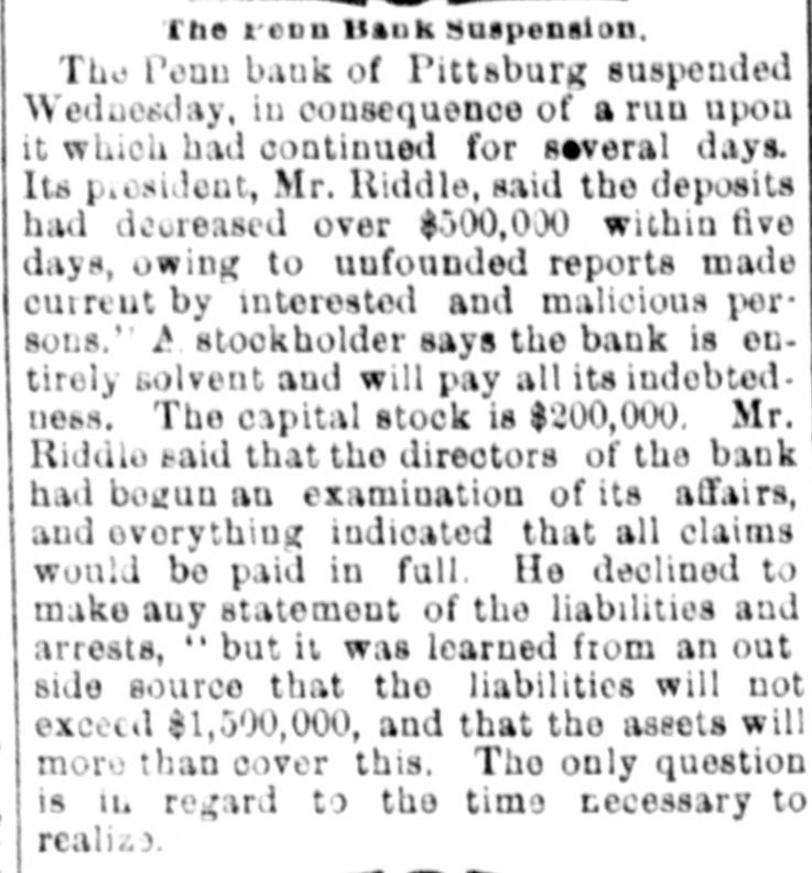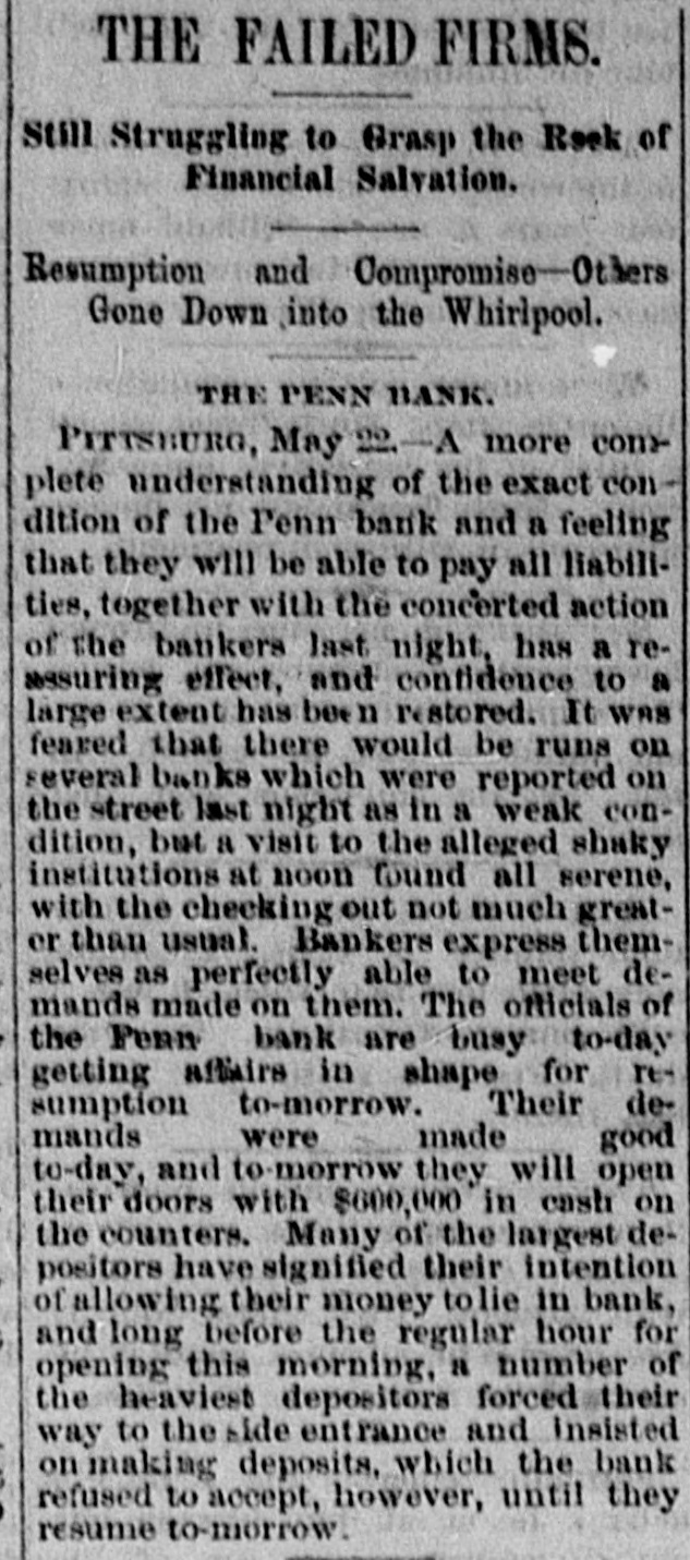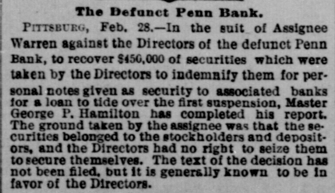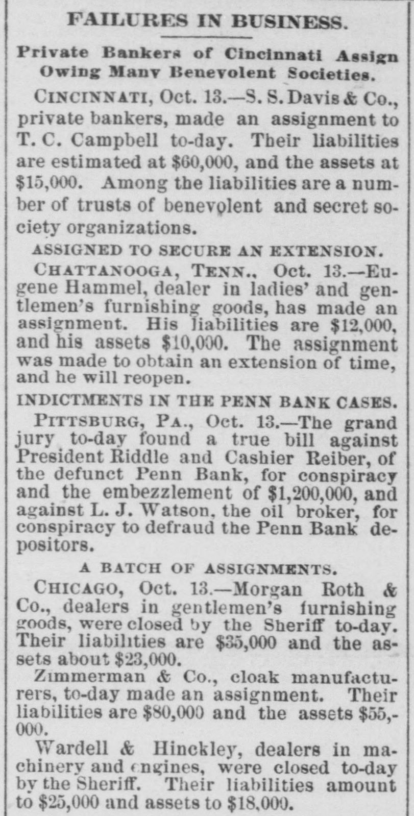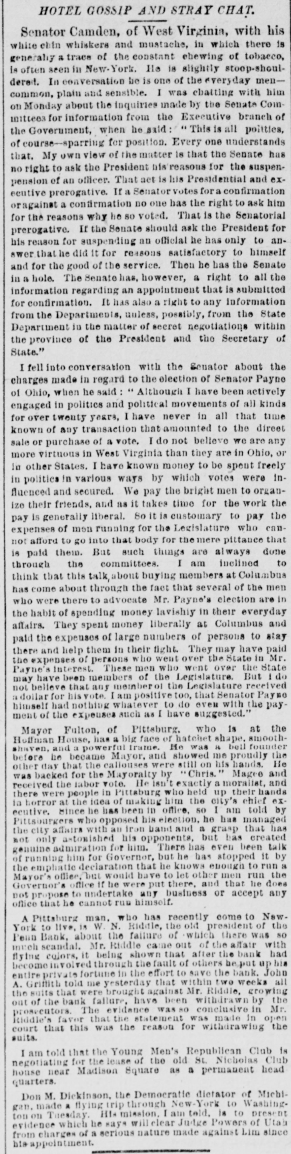 SUNDAY'S NEWS IN BRIEF. Domestic. Alexander Dirjan, manufacturer of moldings, Brooklyn, assigned. Liabilities, $66,000. Eugene Glenn, tried at Petersburg, Va., for the murder of C. W. Holland, was acquitted. A gang of three counterfeiters was captured in a small secluded cabin, near Bourbon, Ind. The banking houses of Amos Henderson. Lancaster, Pa., with $200,000 deposits, suspended. The cold wave checked the rise in the Ohio and its branches and averted a threatened flood. The imports of specie for the week ending Jan. 18, were $240,000, and the exports $6,290,000. The pallium for Archbishop Leroy, of New Orleans, was received and conferred Saturday, Jan. 17. The Houston Spring-wagon Works. Columbus, O., were destroyed by fire. Loss, $75,000; insurance, $50,000. A special Chicago jury returned indictments against seven of the participants in the election frauds of that city. Herman Toller was struck by an engine on the Cincinnati Northern Railway, near Montgomery road, and instantly killed. Efforts are being made to impeach Judge Frank A. Guthries, of Charleston. W. Va. There are flfteen charges against him. The revised figures of the loss by the fire at Keefer & Son's flour mill, Covington, Ky., are $65,000. The insurance is $52,000. The boiler at Earnest's saw mill, near Lebanon, Pa., exploded and killed three workmen, and seriously injured three others, Work in the Sunday Creek Valley (Corning, 0.) mines is going on quietly. The miners are being paid seventy cents a ton, and ask no more. D. E. Swan, an embezzler of the funds of the Northern Pacific Railway Company, has been sentenced to the penitentiary for thirteen years and six months. John Berbech, of St. Louis, committed suicide by jumping off the middle pier of the bridge over the Mississippi. The distance to the water was seventy feet. He had just been fined $500 for adultry. James F. Collins, of Cadez, O., who absconded with his accounts with the Adams Express Company and the P., C. & St. L. Railway Company, short about $3,600, was captured in New Orleans and brought back home. An attempt was made to blow up the hat factory of Crofut & Knapps, Bridgeport, Cor with dynamite. The building was partly damaged, but no one was hurt. Seventeen employes who did not go out on the strike were in the building at the time. Declarations have been filed in the case of the Penn Bank of Pittsburg for the use of Assignee Warner against the directors of the defunct institution, in whict the damages are laid at $6,000,000. The amount in reality involved is $900,000, being overdrafts. John Kurtz and James Hyland, two farmers residing near Middlesex, Pa, quarreled in the home of the former, after becoming intoxicated on hard cider, The latter, on being ejected from the house, returned armed with an ax, broke in the door and killed Kurtz.