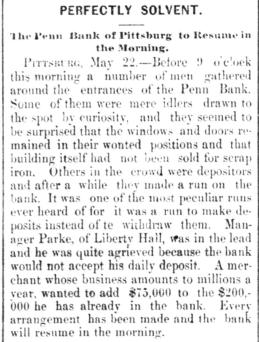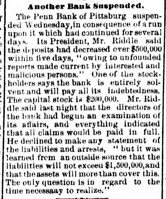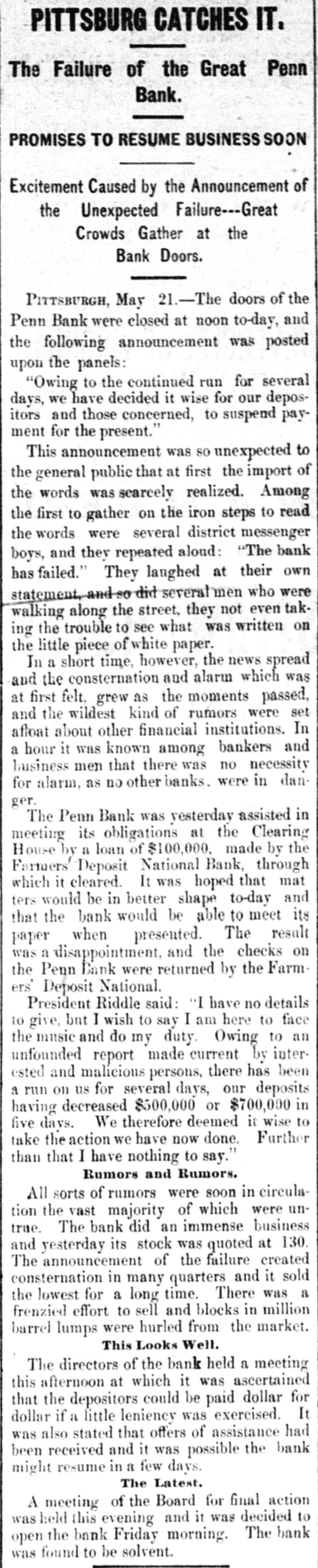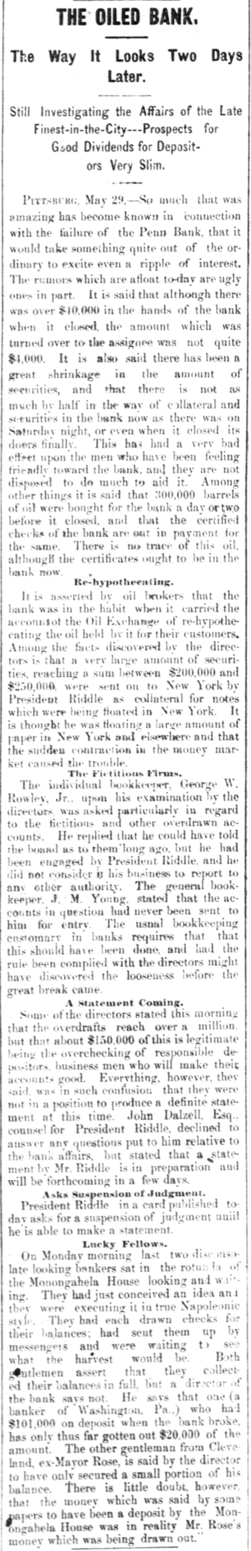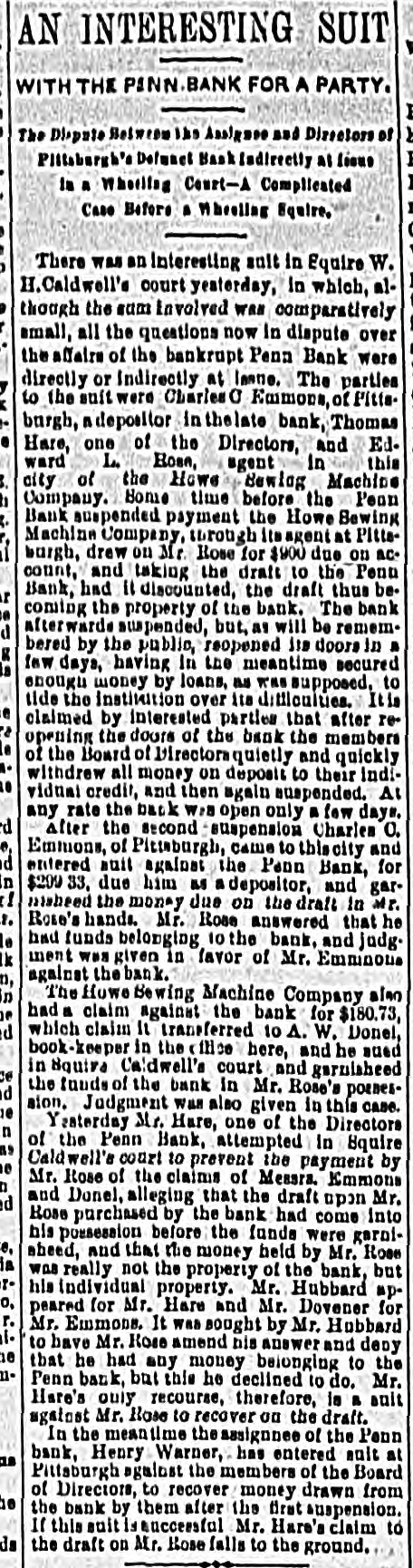 SUNDAY'S NEWS IN BRIEF. Domestic. Alexander Dirjan, manufacturer of moldings, Brooklyn, assigned. Liabilities, $66,000. Eugene Glenn, tried at Petersburg, Va., for the murder of C. W. Holland, was acquitted. A gang of three counterfeiters was captured in a small secluded cabin, near Bourbon, Ind. The banking houses of Amos Henderson. Lancaster, Pa., with $200,000 deposits, suspended. The cold wave checked the rise in the Ohio and its branches and averted a threatened flood. The imports of specie for the week ending Jan. 18, were $240,000, and the exports $6,290,000. The pallium for Archbishop Leroy, of New Orleans, was received and conferred Saturday, Jan. 17. The Houston Spring-wagon Works. Columbus, O., were destroyed by fire. Loss, $75,000; insurance, $50,000. A special Chicago jury returned indictments against seven of the participants in the election frauds of that city. Herman Toller was struck by an engine on the Cincinnati Northern Railway, near Montgomery road, and instantly killed. Efforts are being made to impeach Judge Frank A. Guthries, of Charleston. W. Va. There are flfteen charges against him. The revised figures of the loss by the fire at Keefer & Son's flour mill, Covington, Ky., are $65,000. The insurance is $52,000. The boiler at Earnest's saw mill, near Lebanon, Pa., exploded and killed three workmen, and seriously injured three others, Work in the Sunday Creek Valley (Corning, 0.) mines is going on quietly. The miners are being paid seventy cents a ton, and ask no more. D. E. Swan, an embezzler of the funds of the Northern Pacific Railway Company, has been sentenced to the penitentiary for thirteen years and six months. John Berbech, of St. Louis, committed suicide by jumping off the middle pier of the bridge over the Mississippi. The distance to the water was seventy feet. He had just been fined $500 for adultry. James F. Collins, of Cadez, O., who absconded with his accounts with the Adams Express Company and the P., C. & St. L. Railway Company, short about $3,600, was captured in New Orleans and brought back home. An attempt was made to blow up the hat factory of Crofut & Knapps, Bridgeport, Cor with dynamite. The building was partly damaged, but no one was hurt. Seventeen employes who did not go out on the strike were in the building at the time. Declarations have been filed in the case of the Penn Bank of Pittsburg for the use of Assignee Warner against the directors of the defunct institution, in whict the damages are laid at $6,000,000. The amount in reality involved is $900,000, being overdrafts. John Kurtz and James Hyland, two farmers residing near Middlesex, Pa, quarreled in the home of the former, after becoming intoxicated on hard cider, The latter, on being ejected from the house, returned armed with an ax, broke in the door and killed Kurtz.