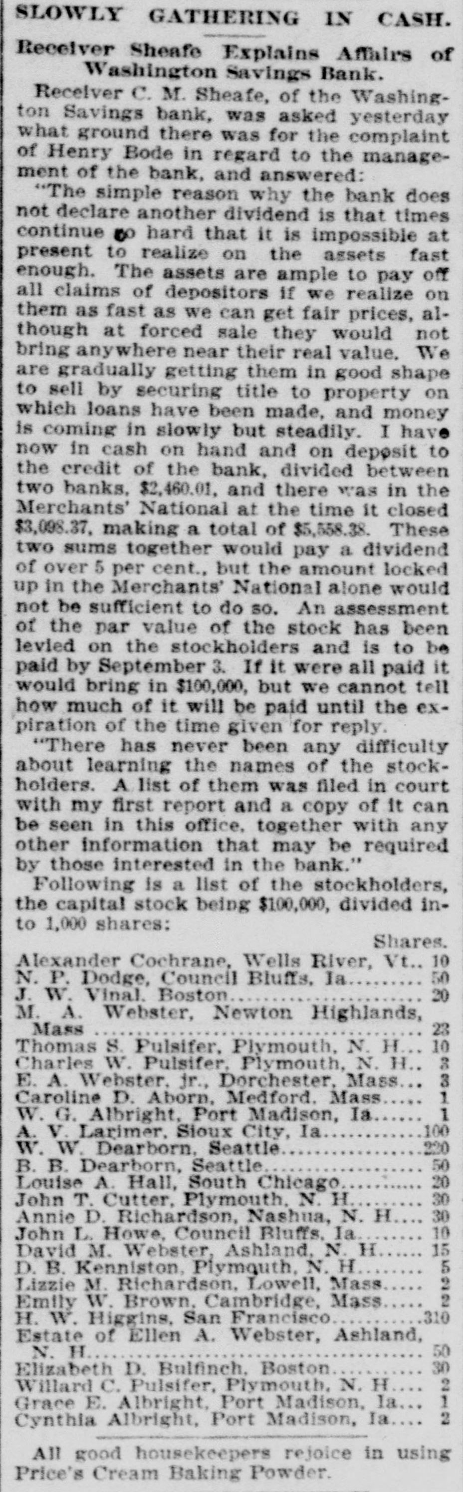 Totals. $684,134 93 $474,676 18 Of this amount in suspended banks the city will be able to realize approximately $40,000, as the Traders' and the Washington National will probably pay dollar for dollar in the long run, and the Merchants' National will probably pay from 40 to 50 per cent. In accounting for his balances, Mr. Boggs tendered the bank books of the suspended banks. This was on the ground that the city, having failed to name depositories, was responsible for the deposits as placed by the city treasurer. When the States Savings bank closed, the city at once began to take vigorous action, under the direction of Mayor Orr, to recover the $5,000 held there in the form of city warrants. By a recent decision of the superior court the city secured the warrants, and it was during the trial of this case that Mr. Boggs, on the witness stand, made the admissions upon which it was proposed to arrest him on a criminal charge. Chairman Cavender, of the financial committee, can speak on this point. He says: "If Boggs had only returned to the city the warrants which he had at the time he went out of office, we would have been willing to have accepted the same, and have reduced the accounts of the banks just that much, But I understand he was afraid to do so, on the ground that it was not legal to buy warrants out of their order, and that he feared certain citizens, who were taking an interest in the financial matter, might prosecute him on an alleged criminal offense. So he placed the warrants in bank as cash, $212,000 in all at that time, according to his report just before he went out, In other words, he reported $212,000 on hand, held as cash in warrants. That was just before he went out of office, and, when he turned over the office, there wasn't a warrant there. On the stand in the State Savings bank case he testified that he had deposited these warrants as cash, but there is no telling what the number of the warrants were, and if they were returned today I guess the city would be willing to credit the banks with them in reducing their account." Now as to the specific counts: "It appears that Boggs rendered himself liable in buying the warrants as he did, and I'm afraid he rendered himself liable by disposing of them as he did, At any rate, the test in this matter is to be made on a $7,000 note given by his clerk, Hill, and indorsed by himself, another note given by Bair & Loomis and an item for campaign purposes' of $5,000, all of which he deposited as cash for the city. The notes were not cash, of course, and the campaign fund item is not cash, of course." Mr. Boggs is charged by the finance committee with having control of the State Bavings bank and using it as & place to deposit worthless paper. For instance, it is cisimed the Bair-Loomis note came from the Bair-Loomis banking institution, and that that was the amount of city money reported on hand there at one time. Later, however, it is understood that the amount was lost in the townsite of Des Noines, and the amount in the form of a bote came into the possession of Mr. Boggs and was deposited as cash. One member of the committee says: "Boggs, no doubt, used the State SavIngs bank to cover up his shortages. The Hill note laid him open to a criminal action, The campaign fund item, of course, was placed in the bank to cover up ashort. age and in my opinion It was a very foolish way in which to cuver up a leak. When the city council tried to secure interest on the deposits in the banks, Baggs agreed to pay 5 per cent. interest, or rather secured an agreement of the banks to pay it. This amounted to $1,200 per month, and was paid in full for only a short time, when several of the banks failed