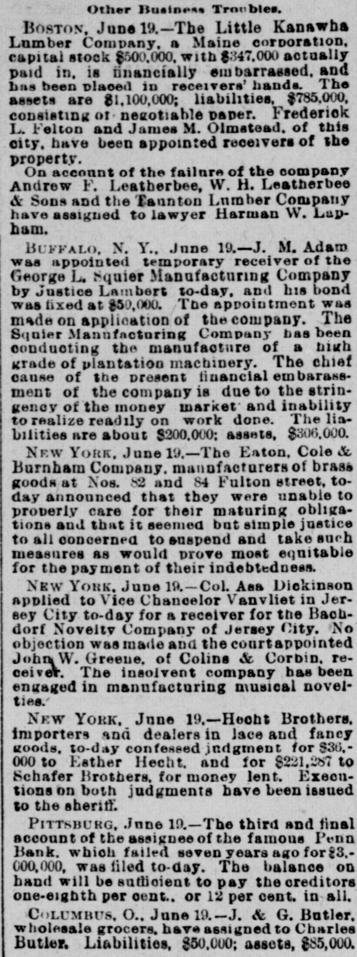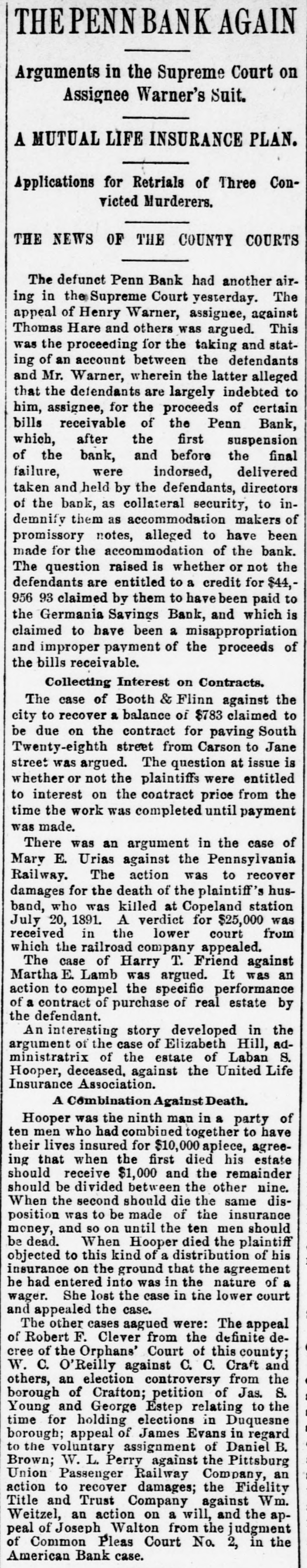 THEPENNI BANK AGAIN Arguments in the Supreme Court on Assignee Warner's Suit. A MUTUAL LIFE INSURANCE PLAN. Applications for Retrials of Three Convicted Murderers. THE NEWS OF THE COUNTY COURTS The defunct Penn Bank had another airing in the Supreme Court yesterday. The appeal of Henry Warner, assignee, against Thomas Hare and others was argued. This was the proceeding for the taking and stating of an account between the defendants and Mr. Warner, wherein the latter alleged that the defendants are largely indebted to him, assignee, for the proceeds of certain bills receivable of the Penn Bank, which, after the first suspension of the bank, and before the final failure, were indorsed, delivered taken and held by the defendants, directors of the bank, as collateral security, to indemnify them as accommodation makers of promissory notes, alleged to have been made for the accommodation of the bank. The question raised is whether or not the defendants are entitled to a credit for $44,956 93 claimed by them to have been paid to the Germania Savings Bank, and which is claimed to have been a misappropriation and improper payment of the proceeds of the bills receivable. Collecting Interest on Contracts. The case of Booth & Flinn against the city to recover a balance of $783 claimed to be due on the contract for paving South Twenty-eighth street from Carson to Jane street was argued. The question at issue is whether or not the plaintiffs were entitled to interest on the contract price from the time the work was completed until payment was made. There was an argument in the case of Mary E. Urias against the Pennsylvania Railway. The action was to recover damages for the death of the plaintiff's husband, who was killed at Copeland station July 20, 1891. A verdict for $25,000 was received in the lower court from which the railroad company appealed. The case of Harry T. Friend against Martha E. Lamb was argued. It was an action to compel the specific performance of a contract of purchase of real estate by the defendant. An interesting story developed in the argument of the case of Elizabeth Hill, administratrix of the estate of Laban S. Hooper, deceased, against the United Life Insurance Association. A Combination Against Death. Hooper was the ninth man in a party of ten men who had combined together to have their lives insured for $10,000 apiece, agreeing that when the first died his estate should receive $1,000 and the remainder should be divided between the other nine. When the second should die the same disposition was to be made of the insurance money, and so on until the ten men should be dead. When Hooper died the plaintiff objected to this kind of a distribution of his insurance on the ground that the agreement he had entered into was in the nature of a wager. She lost the case in the lower court and appealed the case. The other cases aagued were: The appeal of Robert F. Clever from the definite decree of the Orphans' Court of this county; W. C. O'Reilly against C. C. Craft and others, an election controversy from the borough of Crafton; petition of Jas. S. Young and George Estep relating to the time for holding elections in Duquesne borough; appeal of James Evans in regard to the voluntary assignment of Daniel B. Brown; W. L. Perry against the Pittsburg Union Passenger Railway Company, an action to recover damages; the Fidelity Title and Trust Company against Wm. Weitzel, an action on a will, and the appeal of Joseph Walton from the judgment of Common Pleas Court No. 2, in the American Bank case.