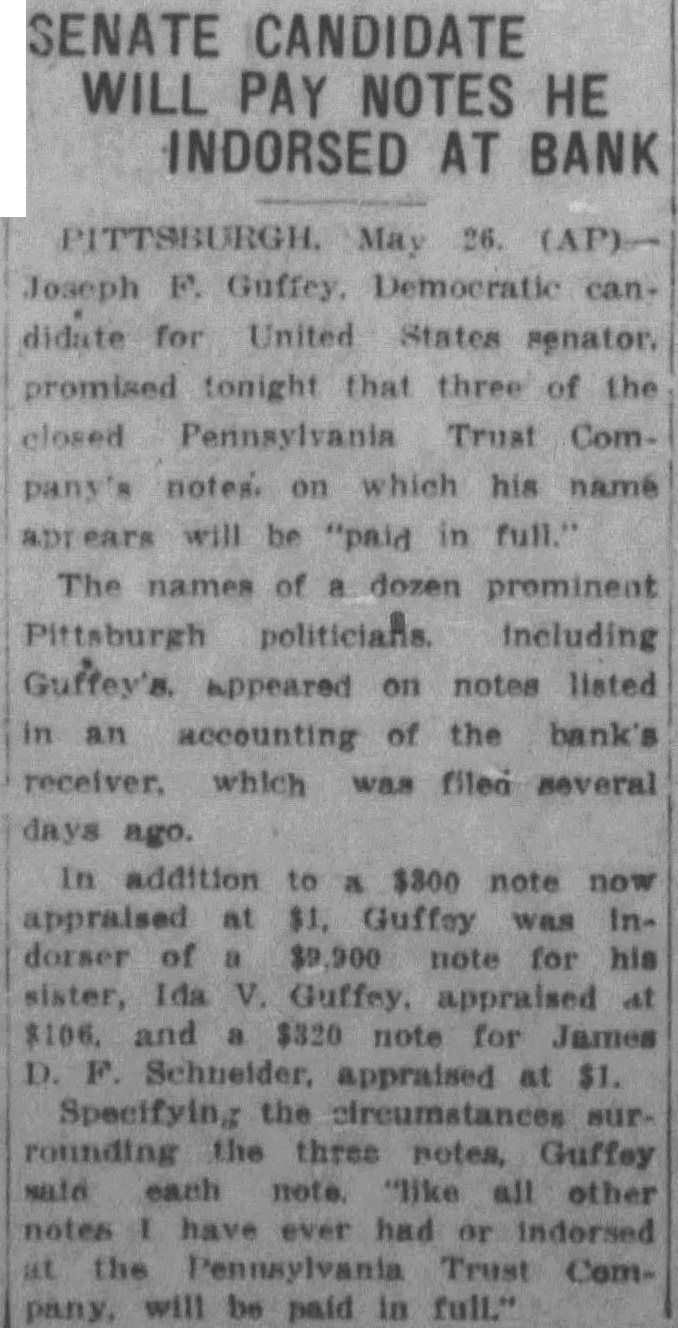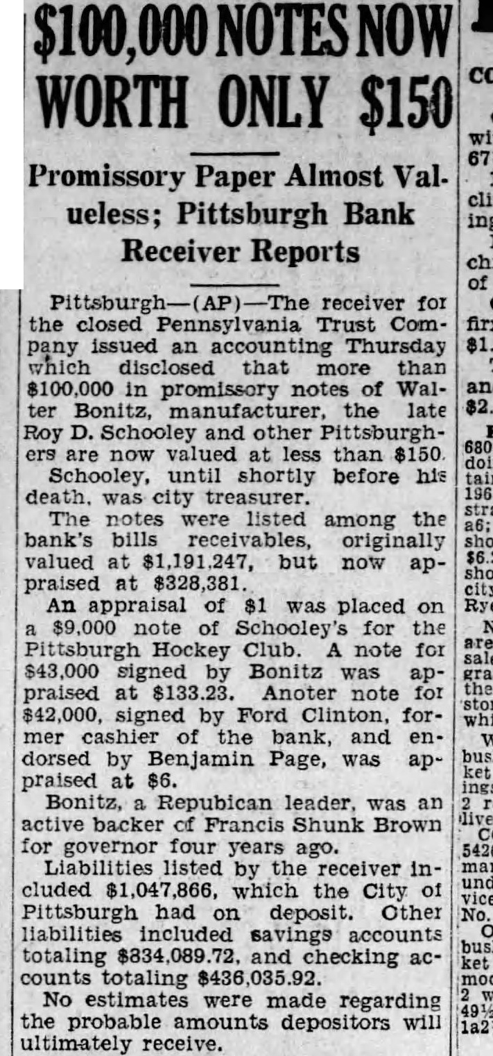 $100,000 NOTES NOW WORTH ONLY $150 Promissory Paper Almost Valueless; Pittsburgh Bank Receiver Reports The receiver for the closed Pennsylvania Trust Company an accounting Thursday which disclosed that than $100,000 in promissory notes of Walter Bonitz, manufacturer, the late Roy D. Schooley and other Pittsburgh ers are now valued at than Schooley, until shortly before his city The notes listed among the bank's bills valued at but now praised at $328,381 An appraisal of $1 was placed on $9,000 note of Schooley's Pittsburgh Hockey Club. note $43,000 signed Bonitz ap praised $133.23 Anoter $42,000, signed by Ford for mer cashier bank, and dorsed by Benjamin Page, was appraised at $6. Bonitz, Repubican leader, was an backer of Francis Shunk Brown for governor four years Liabilities listed by included which the City Pittsburgh had deposit Other liabilities included savings accounts totaling $834 72. and checking ac counts totaling $436,035.92 No estimates were made regarding the probable amounts depositors will ultimately receive