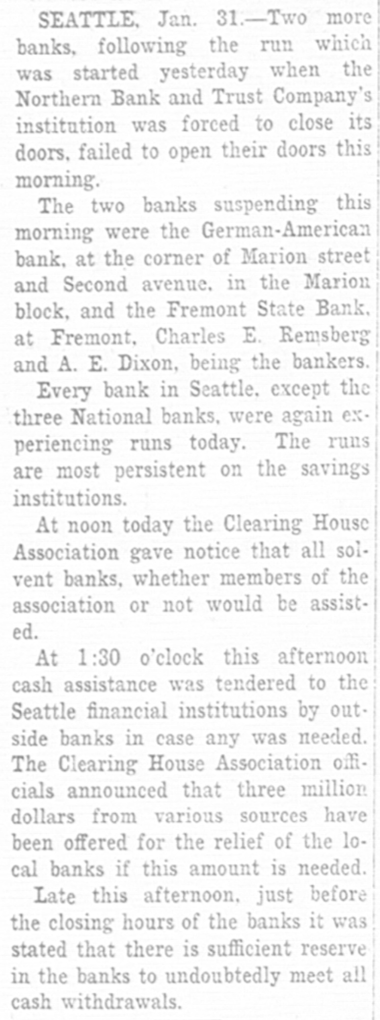 SEATTLE, Jan. 31.-Two more banks, following the run which was started yesterday when the Northern Bank and Trust Company's institution was forced to close its doors. failed to open their doors this morning. The two banks suspending this morning were the German-American bank, at the corner of Marion street and Second avenue. in the Marion block, and the Fremont State Bank, at Fremont. Charles E. Remsberg and A. E. Dixon, being the bankers. Every bank in Seattle. except the three National banks, were again experiencing runs today. The runs are most persistent on the savings institutions. At noon today the Clearing House Association gave notice that all solvent banks, whether members of the association or not would be assisted. At 1:30 o'clock this afternoon cash assistance was tendered to the Seattle financial institutions by out. side banks in case any was needed. The Clearing House Association officials announced that three million dollars from various sources have been offered for the relief of the local banks if this amount is needed. Late this afternoon. just before the closing hours of the banks it was stated that there is sufficient reserve in the banks to undoubtedly meet all cash withdrawals.