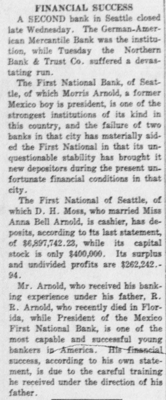 FINANCIAL SUCCESS A SECOND bank in Seattle closed late Wednesday. The German-American Mercantile Bank was the institution, while Tuesday the Northern Bank & Trust Co. suffered a devastating run. The First National Bank, of Seattle, of which Morris Arnold, a former Mexico boy is president, is one of the strongest institutions of its kind in this country, and the failure of two banks in that city has materially aided the First National in that its unquestionable stability has brought it new depositors during the present unfortunate financial conditions in that city. The First National of Seattle, of which D. H. Moss, who married Miss Anna Bell Arnold, is cashier, has deposits, according to its last statement, of $6,897,742.23, while its capital stock is only $400,000. Its surplus and undivided profits are $262,242.94. Mr. Arnold, who received his banking experience under his father, R. R. Arnold, who recently died in Florida, while President of the Mexico First National Bank, is one of the most capable and successful young bankers in America. His-financial success, according to his own statement, is due to the careful training he received under the direction of his father.