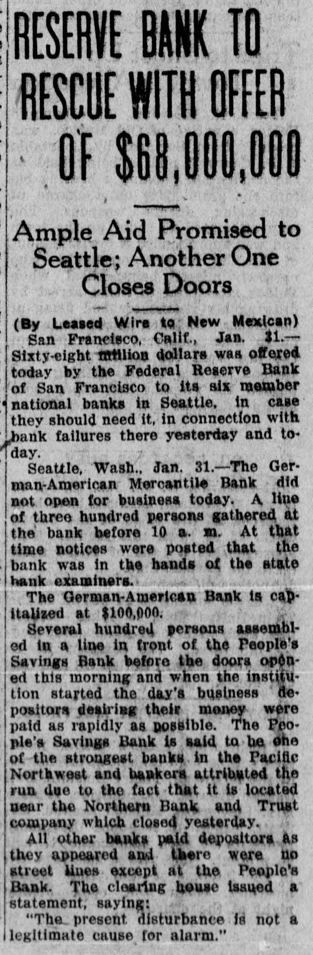 RESERVE BANK TO RESCUE WITH OFFER OF $68,000,000 Ample Aid Promised to Seattle; Another One Closes Doors (By Leased Wire to New Mexican) San Francisco, Calif., Jan. 31.Sixty-eight million dollars was offered today by the Federal Reserve Bank of San Francisco to its six member national banks in Seattle, in case they should need it, in connection with bank failures there yesterday and today. Seattle, Wash., Jan. 31.-The German-American Mercantile Bank did not open for business today. A line of three hundred persons gathered at the bank before 10 a. m. At that time notices were posted that the bank was in the hands of the state hank examiners. The German-American Bank is capitalized at $100,000. Several hundred persons assembled in a line in front of the People's Savings Bank before the doors opèned this morning and when the institution started the day's business depositors desiring their money were paid as rapidly as possible. The People's Savings Bank is said to be one of the strongest banks in the Pacific Northwest and bankers attributed the run due to the fact that it is located near the Northern Bank and Trust company which closed yesterday. All other banks paid depositors as they appeared and there were no street lines except at the People's Bank. The clearing house issued a statement, saying: "The present disturbance is not a legitimate cause for alarm."