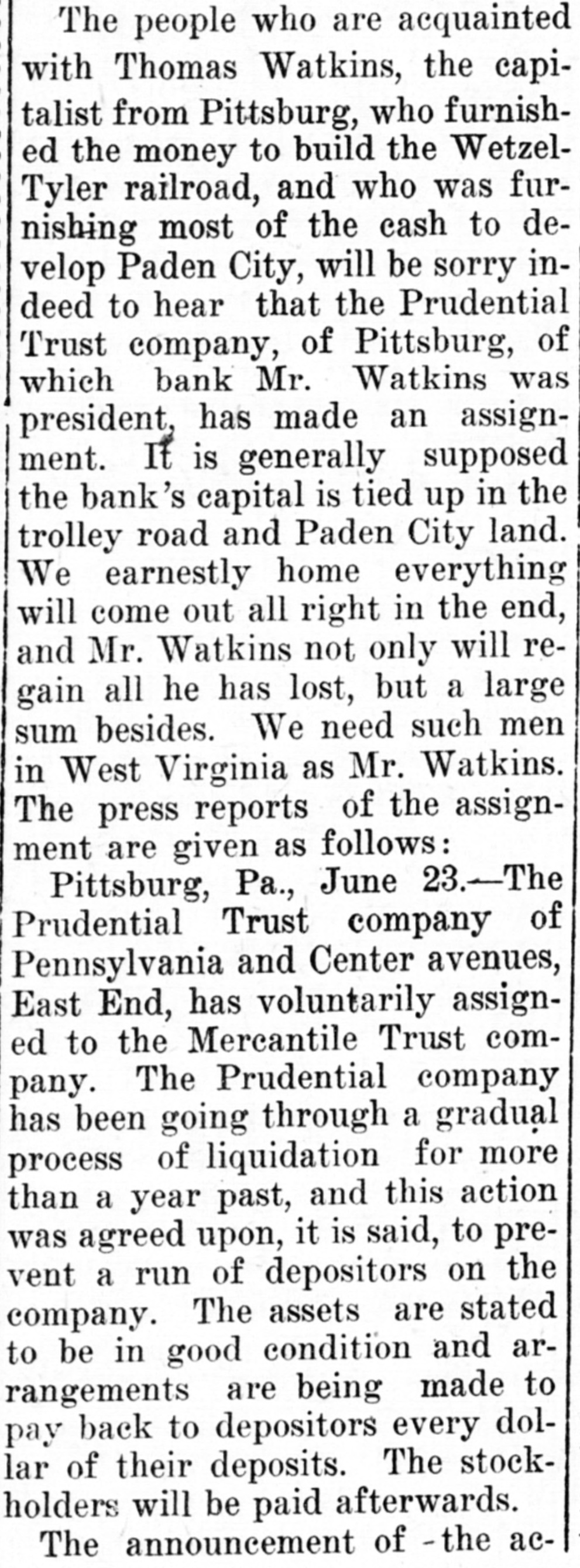 The people who are acquainted with Thomas Watkins, the capitalist from Pittsburg, who furnished the money to build the WetzelTyler railroad, and who was furnishing most of the cash to develop Paden City, will be sorry indeed to hear that the Prudential Trust company, of Pittsburg, of which bank Mr. Watkins was president, has made an assignment. It is generally supposed the bank's capital is tied up in the trolley road and Paden City land. We earnestly home everything will come out all right in the end, and Mr. Watkins not only will regain all he has lost, but a large sum besides. We need such men in West Virginia as Mr. Watkins. The press reports of the assignment are given as follows: Pittsburg, Pa., June 23.-The Prudential Trust company of Pennsylvania and Center avenues, East End, has voluntarily assignpany. ed to the The Mercantile Prudential Trust company comhas been going through a gradual process of liquidation for more than a year past, and this action was agreed upon, it is said, to prevent a run of depositors on the company. The assets are stated to be in good condition and arrangements are being made to pay back to depositors every dollar of their deposits. The stockholders will be paid afterwards. The announcement of - the ac-