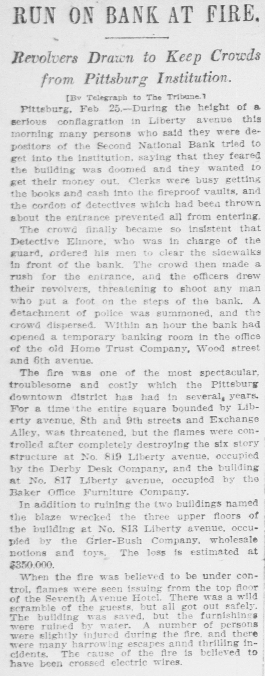 RUN ON BANK AT FIRE. Revolvers Drawn to Keep Crowds from Pittsburg Institution. [Bv Telegraph to The Tribune.) Pittsburg, Feb 25.-During the height of a serious conflagration in Liberty avenue this morning many persons who said they were depositors of the Second National Bank tried to get into the institution, saying that they feared the building was doomed and they wanted to get their money out. Clerks were busy getting the books and cash into the fireproof vaults, and the cordon of detectives which had been thrown about the entrance prevented all from entering. The crowd finally became so insistent that Detective Elmore, who was in charge of the guard, ordered his men to clear the sidewalks in front of the bank. The crowd then made a rush for the entrance, and the officers drew their revolvers, threatening to shoot any man who put a foot on the steps of the bank. A detachment of police was summoned, and the crowd dispersed. Within an hour the bank had opened a temporary banking room in the office of the old Home Trust Company, Wood street and 6th avenue. The fire was one of the most spectacular, troublesome and costly which the Pittsburg downtown district has had in several, years. For a time the entire square bounded by Liberty avenue, 8th and 9th streets and Exchange Alley, was threatened. but the flames were controlled after completely destroying the six story structure at No. 819 Liberty avenue, occupied by the Derby Desk Company, and the building at No. 817 Liberty avenue, occupied by the Baker Office Furniture Company. In addition to ruining the two buildings named the blaze wrecked the three upper floors of the building at No. 813 Liberty avenue, occupied by the Grier-Bush Company, wholesale notions and toys. The loss is estimated at $350,000. When the fire was believed to be under control, flames were seen issuing from the top floor of the Seventh Avenue Hotel. There was a wild scramble of the guests, but all got out safely. The building was saved, but the furnishings were ruined by water. A number of persons were slightly injured during the fire. and there were many harrowing escapes annd thrilling incidents. The cause of the fire is believed to have been crossed electric wires.
