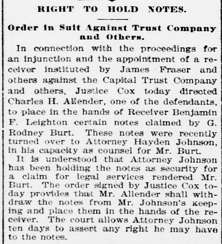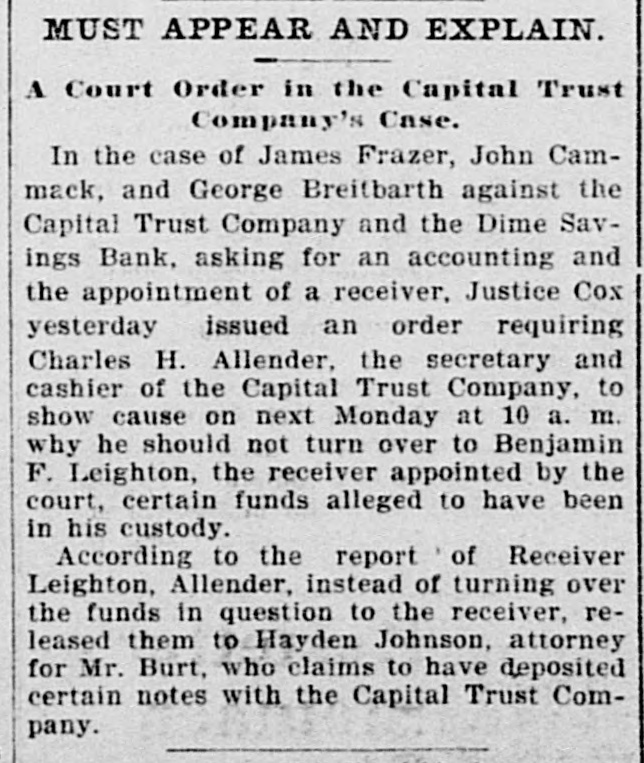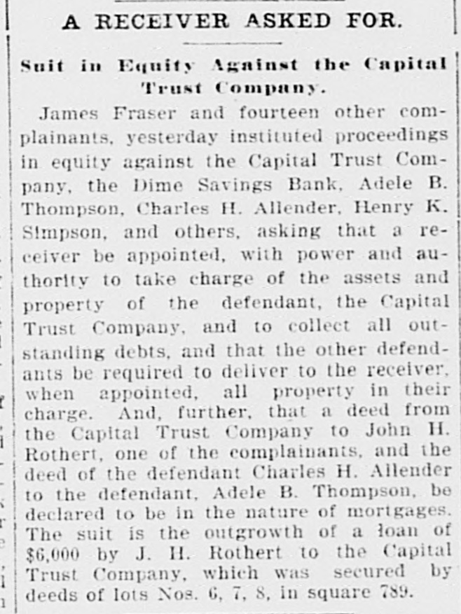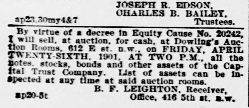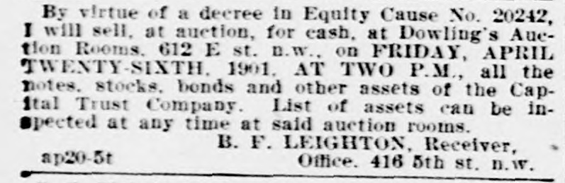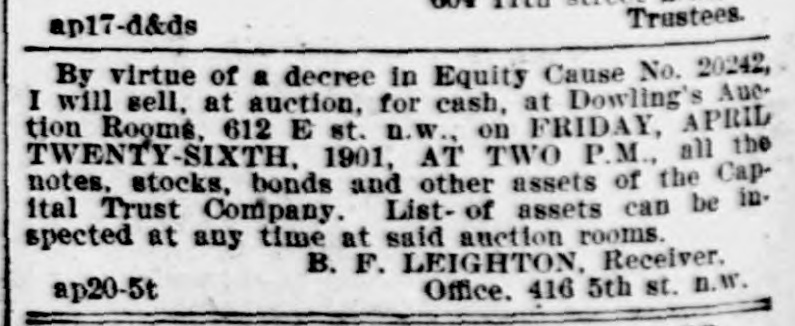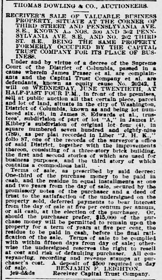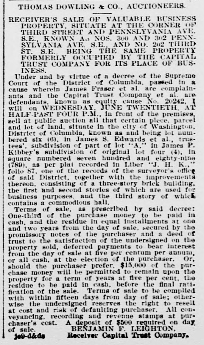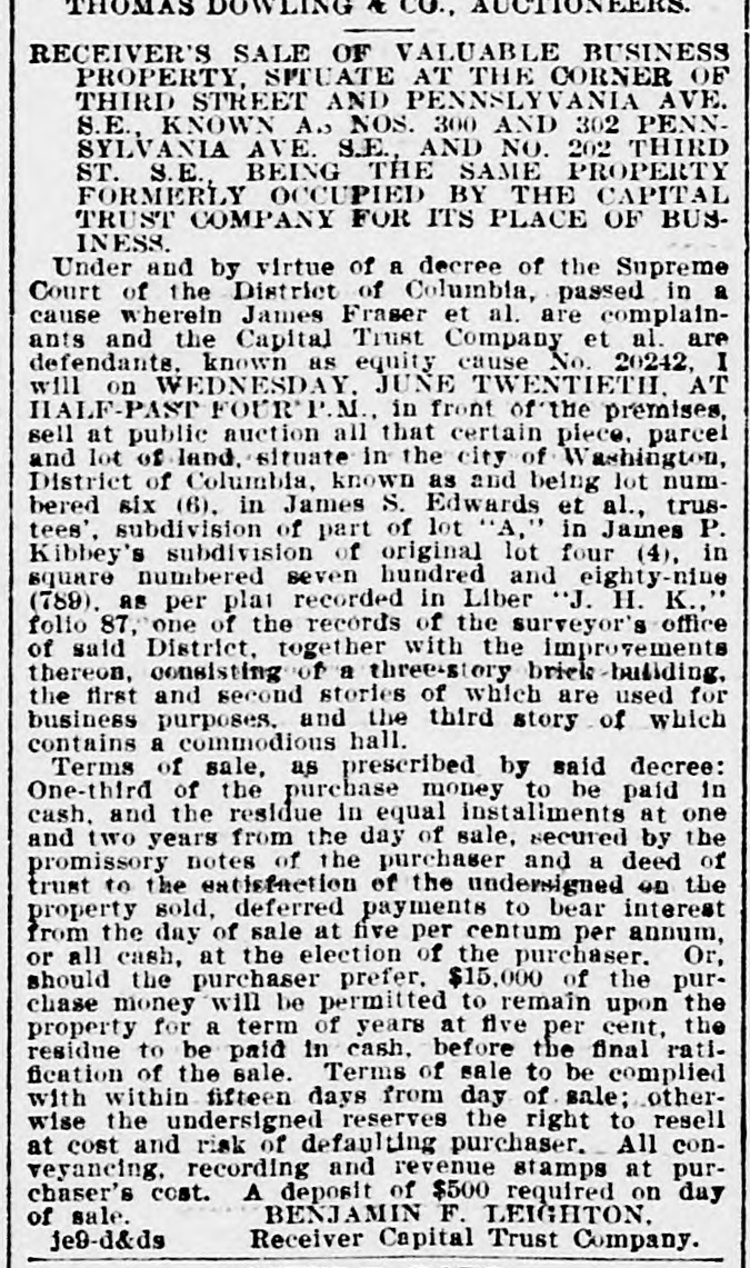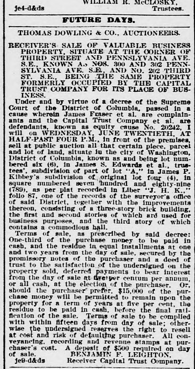 WILLIAM R. McCLOSKY, Trustees. je4-d&ds FUTURE DAYS. THOMAS DOWLING & CO., AUCTIONEERS. RECEIVER'S SALE OF VALUABLE BUSINESS PROPERTY, SITUATE AT THE CORNER OF THIRD STREET AND PENNSLYVANIA AVE. S.E., KNOWN A., NOS. 300 AND 302 PENNSYLVANIA AVE. S.E., AND NO. 202 THIRD ST. S.E., BEING THE SAME PROPERTY FORMERLY OCCUPIED BY THE CAPITAL TRUST COMPANY FOR ITS PLACE OF BUSINESS. Under and by virtue of a decree of the Supreme Court of the District of Columbia, passed in a cause wherein James Fraser et al. are complainants and the Capital Trust Company et al. are defendants, known as equity cause No. 20242, I will on WEDNESDAY, JUNE TWENTIETH, AT HALF-PAST FOUR P.M., in front of the premises, sell at public auction all that certain piece. parcel and lot of land, situate in the city of Washington, District of Columbia, known as and being lot numbered six (6), in James S. Edwards et al., trustees', subdivision of part of lot "A," in James P. Kibbey's subdivision of original lot four (4), in square numbered seven hundred and eighty-nine (789). as per plat recorded in Liber "J. H. K.," follo 87, one of the records of the surveyor's office of said District, together with the improvements thereon, consisting of a three-story brick building, the first and second stories of which are used for business purposes. and the third story of which contains a commodious hall. Terms of sale, as prescribed by said decree: One-third of the purchase money to be paid in cash, and the residue in equal installments at one and two years from the day of sale, secured by the promissory notes of the purchaser and a deed of trust to the satisfaction of the undersigned on the property sold, deferred payments to bear interest from the day of sale at fiverper centum per annum, or all cash, at the election of the purchaser. Or, should the purchaser prefer, $15,000 of the purchase money will be permitted to remain upon the property for a term of years at five per cent, the residue to be paid in cash, before the final ratlfication of the sale. Terms of sale to be complied with within fifteen days from day of sale; otherwise the undersigned reserves the right to resell at cost and risk of defaulting purchaser. All conveyancing. recording and revenue stamps at purchaser's cost. A deposit of $500 required on day of sale. BENJAMIN F. LEIGHTON, je9-d&ds Receiver Capital Trust Company.