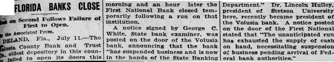 Run was precipitated by the failure/suspension of the Volusia County Bank & Trust in DeLand; heavy withdrawals followed.