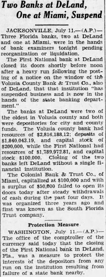 July Three Florida banks, two at DeLand and one at Miami, were in the hands of bank examiners tonight pending reorganization liquidation. The First National bank DeLand closed its doors shortly before noon after heavy run following the posting of notice on the window of the Volusia County Bank Trust also of DeLand. that that institution suspended business now in the hands of the state banking department." The banks at DeLand were two of the oldest Volusia county and both were depositories for city county funds. The Volusia county bank had resources $2,816,188,12; deposits and capital stock $200,000, while the First had resources of and capital stock Closing two banks left DeLand without single financial The Colonial Bank & Trust Co., of Miami, $100,000 and surplus of $50,000 failed open its doors today after steady cash during the past four days. was years and first was known as the South Florida Trust company.