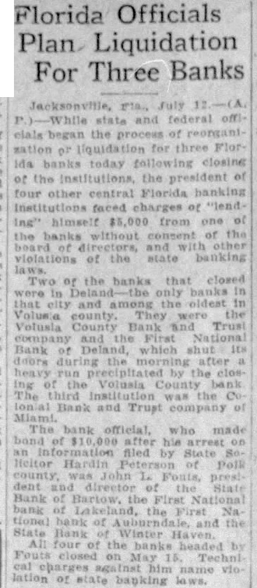 Deland was without financial institution today resulting from the closing yesterday of the First National bank and the Volusia County Bank and Trust company. Runs during the past four days also caused the Colonial Bank and Trust company of Miami, capitalized at $100,000, to cease business. John Fouts of Barstow was arrested late yesterday at Winterhaven on charge of violating the state banking laws and was freed on $10,000 bond. Fouts was president and director of four Central Florida banks which closed their doors on May 15 of this year.