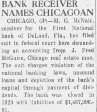 ...the First National Bank of DeLand, Fla., which was closed July 11, 1929...M. G. McNair, receiver for the First National Bank of DeLand, Fla., which was closed July 11, 1929... (1932 article referencing receiver).