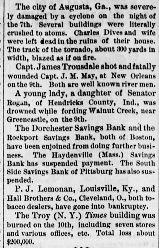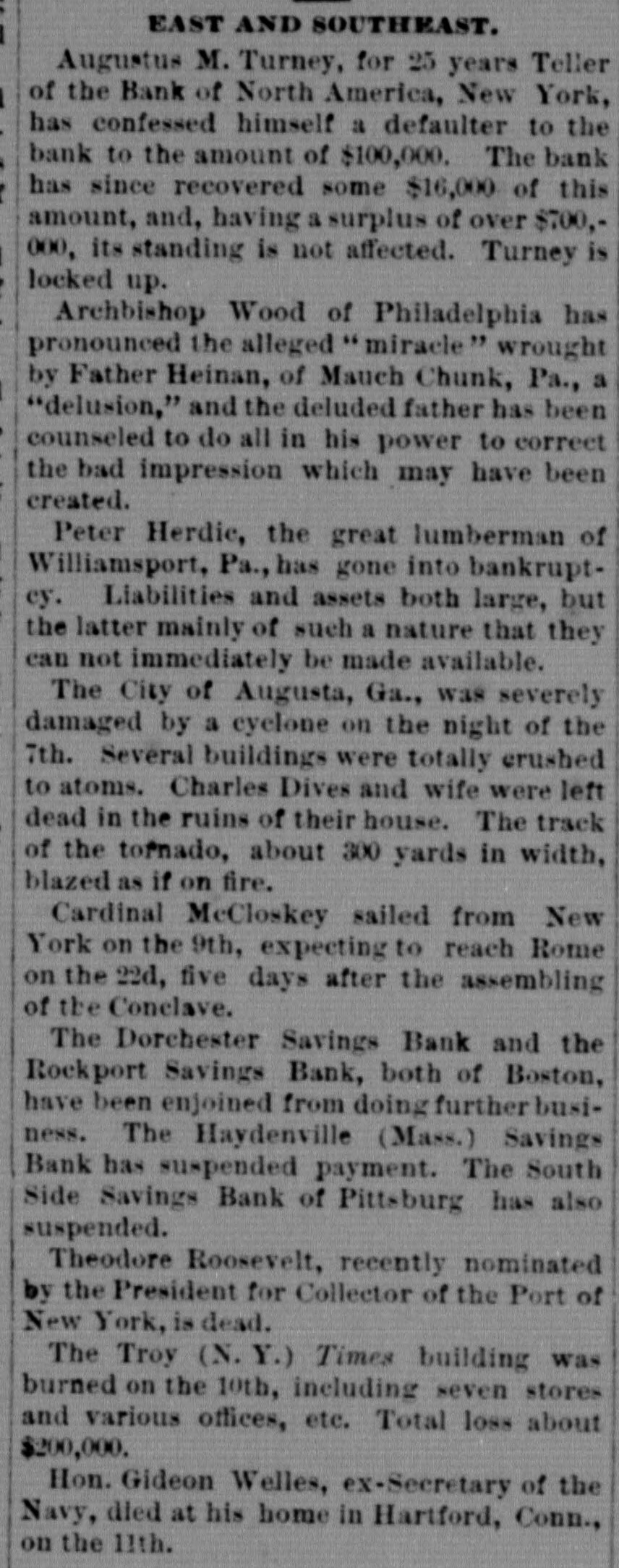 EAST AND SOUTHEAST. The Mercantile Savings Institution of Boston is enjoined for the present from doing business. An alleged miracle is reported to have occurred recently at East Mauch Chunk, Pa. Miss Amelia Greth, aged 36, a devout Catholic, had been for a long time ill with a pulmonary affection. She had a vision, in which her death was predicted at a certain time, and that she would be restored to life and perfect health through the ihtercession of Father Heenan, her pastor." These events followed, it is claimed, precisely as indicated, and both Miss Greth and Father Heenan publicly declare it to be a miracle. The affair causes great excitement, and, while many Catholies accept the facts as stated, others reject them or are non-committal. A Philadelphia man, J. Henry Schrack, successfully imposed upon the credulity of many of his neighbors, by feigning death and then coming to life again, when he told a most marvelous story of the sights he had seen while upon the boundaries of the other world. Investigation shows that the whole thing was a preconcerted fraud, and the imposter has been publicly exposed. Augustus M. Turney, for 25 years Teller of the Bank of North America, New York, has confessed himself a defaulter to the bank to the amount of $100,000. The bank has since recovered some $16,000 of this amount, and, having a surplus of over $700,000, its standing is not affected. Turney is locked up. Archbishop Wood of Philadelphia has pronounced the alleged " miracle wrought by Father Heinan, of Mauch Chunk, Pa., a "delusion," and the deluded father has been counseled to do all in his power to correct the bad impression which may have been created. Peter Herdic, the great lumberman of Williamsport, Pa., has gone into bankruptcy. Liabilities and assets both large, but the latter mainly of such a nature that they can not immediately be made available. The City of Augusta, Ga., was severely damaged by a cyclone on the night of the 7th. Several buildings were totally crushed to atoms. Charles Dives and wife were left dead in the ruins of their house. The track of the tornado, about 300 yards in width, blazed as if on fire. Cardinal McCloskey sailed from New York on the 9th, expecting to reach Rome on the 22d, five days after the assembling of the Conclave. The Dorchester Savings Bank and the Rockport Savings Bank, both of Boston, have been enjoined from doing further business. The Haydenville (Mass.) Savings Bank has suspended payment. The South Side Savings Bank of Pittsburg has also suspended. Theodore Roosevelt, recently nominated by the President for Collector of the Port of New York, is dead. The Troy (N. Y.) Times building was burned on the 10th, including seven stores and various offices, etc. Total loss about $200,000. Hon. Gideon Welles, ex-Secretary of the Navy, died at his home in Hartford, Conn., on the 11th.