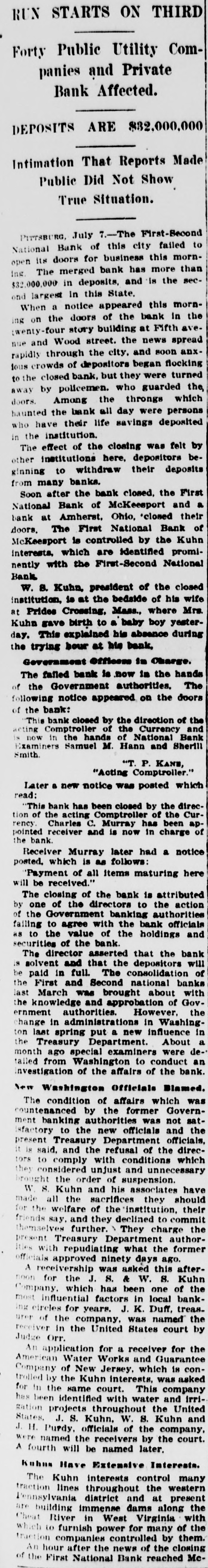 RUN STARTS ON THIRD Forty Public Utility Companies and Private Bank Affected. DEPOSITS ARE $32.000,000 Intimation That Reports Made Public Did Not Show True Situation. July -The First-Becond failed to PITTSBURG, Bank of this city mornNational doors for business this than open its merged bank has more secing. $32,000,000 The in deposits, and is the and largest In this State. a notice appeared this in mornWhen doors of the bank ave- the ing on the story building at Fifth spread :wenty-four Wood street. the news anxnue and through the city. and soon flocking rapidly crowds of depositors began turned 10us closed bank. but they were the, to the who guarded which the throngs away by Among policemen. persons who doors. the bank all day were deposited haunted have their life savings in the effect institution. of the closing was felt be- by The institutions here. depositors deposits ginning other to withdraw their from many after banks. the bank closed. the First a Soon Bank of McKeesport and their National at Amherst. Ohio, 'closed Bank of bank The First National Kuhn doors. is controlled by the promiMcKeesport which are Identified National nently interests. with the First-Second Bank Kuhn. president of the his closed wife W. B. is at the bedside of Mrs. institution. Crossing. Mass., where yesterat Prides gave birth to a baby boy during Kuhn explained his absence This bank. day. the trying hour at his Government officers in Charge. failed bank is now in the hands The The Government authorities. doors following of the notice appeared on the of bank: the closed by the direction Currency of and the acting This Comptroller bank of of the National Sherill Bank Smith. Examiners now in the Samuel hands M. Hann and "T. P. KANE, "Acting Comptroller." Later a new notice was posted which apread: "This bank acting has been Comptroller closed by of the been the direc- Curtion of the Charles C. Murray has charge of the pointed rency. receiver and is now in bank Murray later had a notice Receiver which is as follows: will be received.' posted. Payment of all items maturing here closing of the bank is the attributed action The of the directors to authorities of by the one Government with banking the bank officials failing to the to agree value of the holdings and as securities of the asserted bank. that the bank The director that the depositors will of the is solvent and full. The consolidation banks brought be paid First in and Second national about with last knowledge March was and approbation However, of Gov- the the authorities. Washingernment in administrations in influence in change last spring put a new About a ton Department. were dethe Treasury special examiners conduct an month ago Washington to the bank. investigation tailed from of the affairs of New Washington officials which Blamed. was condition of affairs former Governcountenanced The by the was not satbanking authorities and the ment isfactory to the new officials officials, present Treasury Department refusal of the direcit is said. and the conditions which comply with and unnecessary tors considered to unjust suspension. have they the order of associates brought W. S. Kuhn and his they should for made the all welfare the sacrifices of the declined institution. to commit their friends say. and further they They charge author- the themselves Treasury Department the former ninety this ities present off Hals with approved repudiating asked what days ago. afterA receivership was S. & W. S. Kuhn the noon for the which J. has been local one of bankmost Company. influential factors J. K. in Duff, treascircles for years. named the receiver urer ng of the in the company. United States was court by the Judge Orr. for a receiver for An application Works and Guarantee conCompany American of Water New Jersey. which was is asked trolled by the Kuhn interests. This company for in the identified same court. with water and United irrihas been projects throughout the Kuhn and gation J. S. Kuhn. W. 8. company. States. H. Purdy, officials of the by the court. J. named the receivers later. were A fourth will be named Kahum Have Extensive control Interests. many Kuhn interests the western The lines throughout at present traction district and along the building immense Virginia Pennsylvania dams with the are River in West many of Cheat which to furnish power controlled for by them. traction companies news of the closing of An the hour First after National the Bank reached Mc-