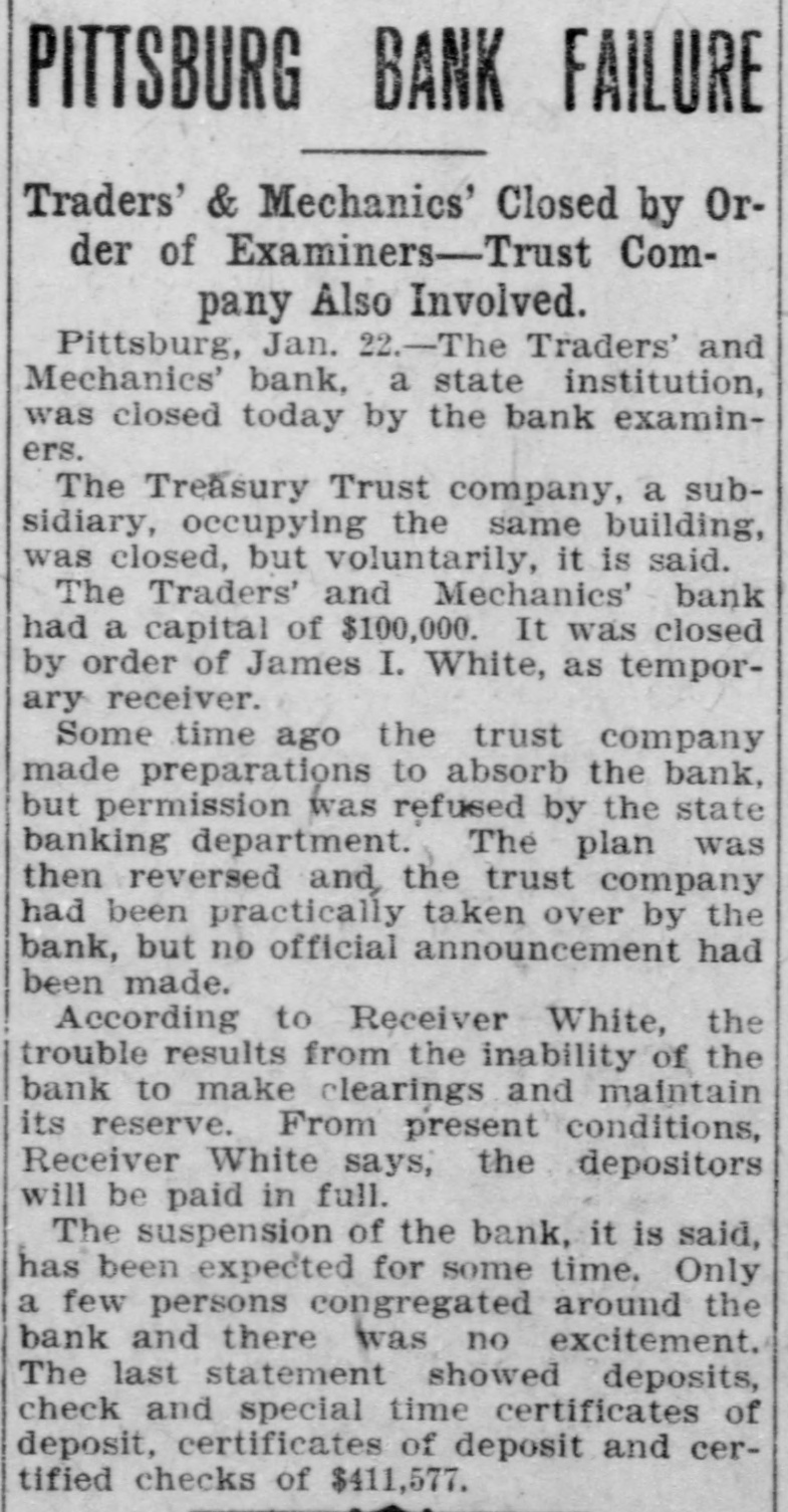 PITTSBURG BANK FAILS. Traders and Mechanics', State Institution, Capital $100,000. Pittsburg, Jan. 22-The Traders and Mechanics' bank, a state institution, was closed today by the bank examiners. The Treasury Trust company a subsidiary, occupying the same building was closed, but voluntarily, it is said. The Traders and Mechanics' bank had a capital of $100,000. It was closed by order of James L. White, as temporary receiver. Some time ago the trust company made preparations to absorb the bank, but permission was refused by the state banking department. The plan was then reversed and the trust company had been practically taken over by the bank but no official announcement had been made. According to Received White, the trouble results from the inability of the bank to make clearings and maintain its reserve. From present conditions, Receiver White says, the depositors will be paid in full.