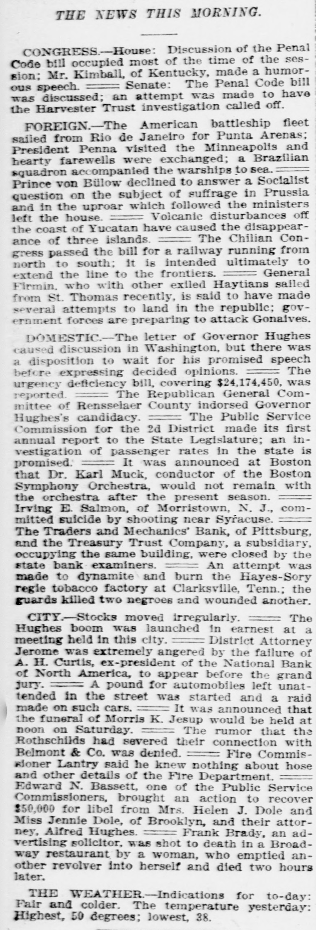 THE NEWS THIS MORNING. CONGRESS-House: Discussion of the Penal Code bill occupied most of the time of the session; Mr. Kimball, of Kentucky, made a humorSenate: The Penal Code bill ous speech. was discussed; an attempt was made to have the Harvester Trust investigation called off. FOREIGN.-The American battleship fleet sailed from Rio de Janeiro for Punta Arenas; President Penna visited the Minneapolis and hearty farewells were exchanged; a Brazilian squadron accompanied the warships to sea. Prince von Büllow declined to answer a Socialist question on the subject of suffrage in Prussia and in the uproar which followed the ministers Volcanic disturbances off left the house. the coast of Yucatan have caused the disappearance of three islands. The Chilian Congress passed the bill for a railway running from north to south: it is intended ultimately to General extend the line to the frontiers. Firmin. who with other exiled Haytians salled from St. Thomas recently, is said to have made several attempts to land in the republic; government forces are preparing to attack Gonalves. DOMESTIC.-The letter of Governor Hughes caused discussion in Washington, but there was a disposition to wait for his promised speech The before expressing decided opinions. urgency deficiency bill, covering $24,174,450, was The Republican General Comreported. mittee of Rensselaer County indorsed Governor The Public Service Hughes's candidacy. Commission for the 2d District made its first annual report to the State Legislature; an investigation of passenger rates in the state is It was announced at Boston promised. that Dr. Karl Muck, conductor of the Boston Symphony Orchestra, would not remain with the orchestra after the present season. Irving E. Salmon, of Morristown, N. J., committed suicide by shooting near Syracuse. The Traders and Mechanics' Bank, of Pittsburg, and the Treasury Trust Company, a subsidiary, occupying the same building, were closed by the state bank examiners. An attempt was made to dynamite and burn the Hayes-Sory regie tobacco factory at Clarksville, Tenn.; the guards killed two negroes and wounded another. The CITY.-Stocks moved irregularly. Hughes boom was launched in earnest at a meeting held in this city. District Attorney Jerome was extremely angered by the failure of A. H. Curtis, ex-president of the National Bank of North America, to appear before the grand jury. A pound for automobiles left unattended in the street was started and a raid made on such cars. It was announced that the funeral of Morris K. Jesup would be held at noon on Saturday. The rumor that the Rothschilds had severed their connection with Belmont & Co. was denied. Fire Commissioner Lantry said he knew nothing about hose and other details of the Fire Department. Edward N. Bassett, one of the Public Service Commissioners, brought an action to recover $50,000 for libel from Mrs. Helen J. Dole and Miss Jennie Dole, of Brooklyn, and their attorney, Alfred Hughes. Frank Brady, an advertising solicitor, was shot to death in a Broadway restaurant by a woman, who emptied another revolver into herself and died two hours later. THE WEATHER-Indications for to-day: Fair and colder. The temperature yesterday: Highest, 50 degrees; lowest, 38.
