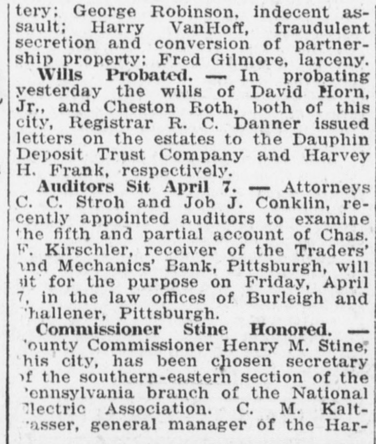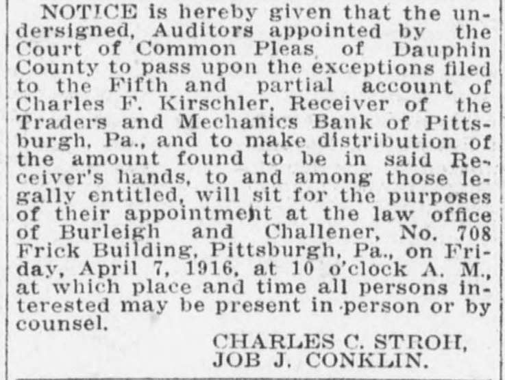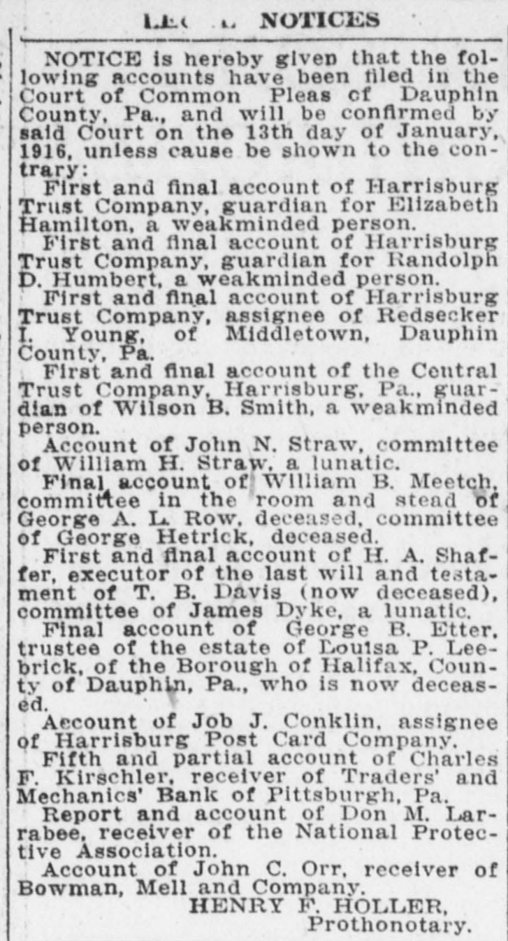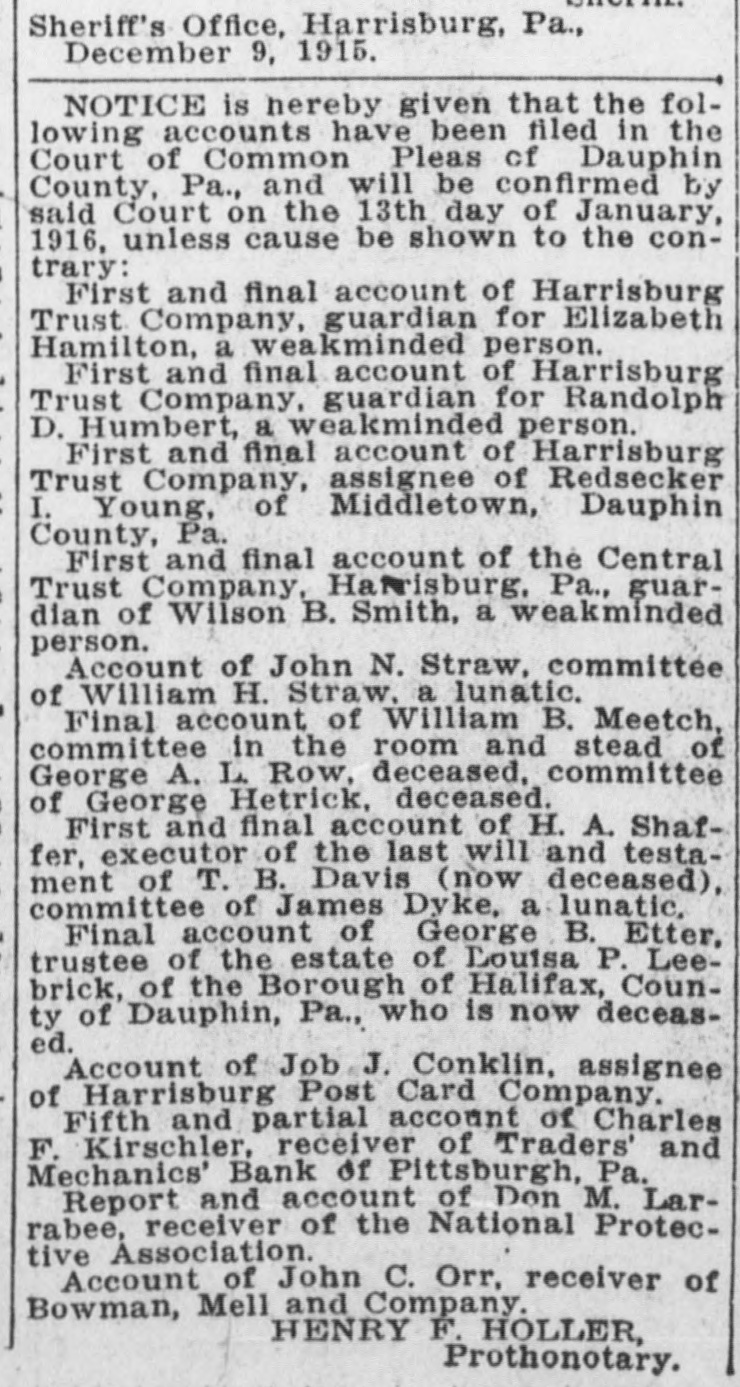 Sheriff's Office, Harrisburg, Pa., December 9, 1915. NOTICE is hereby given that the following accounts have been filed in the Court of Common Pleas of Dauphin County, Pa., and will be confirmed by said Court on the 13th day of January, 1916, unless cause be shown to the contrary: First and final account of Harrisburg Trust Company, guardian for Elizabeth Hamilton, a weakminded person. First and final account of Harrisburg Trust Company, guardian for Randolph D. Humbert, a weakminded person. First and final account of Harrisburg Trust Company, assignee of Redsecker I. Young, of Middletown, Dauphin County, Pa. First and final account of the Central Trust Company. Harrisburg, Pa., guardian of Wilson By Smith, a weakminded person. Account of John N. Straw, committee of William H. Straw. a lunatic. Final account of William B. Meetch, committee in the room and stead of George A. L. Row, deceased, committee of George Hetrick, deceased. First and final account of H. A. Shaffer, executor of the last will and testament of T. B. Davis (now deceased), committee of James Dyke, a lunatic. Final account of George B. Etter, trustee of the estate of Louisa P. Leebrick, of the Borough of Halifax, County of Dauphin, Pa., who is now deceased. Account of Job J. Conklin, assignee of Harrisburg Post Card Company. Fifth and partial account of Charles F. Kirschler, receiver of Traders' and Mechanics' Bank of Pittsburgh, Pa. Report and account of Don M. Larrabee, receiver of the National Protective Association. Account of John C. Orr, receiver of Bowman, Mell and Company. HENRY F. HOLLER, Prothonotary.